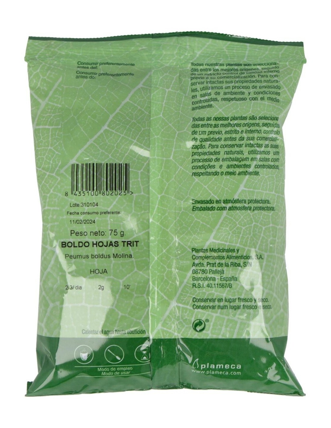 Hojas de boldo trituradas 100% naturales y orgánicas. Ayuda a optimizar las funciones hepáticas y biliares. Contribuye a eliminar toxinas. Ayuda a relajar el cuerpo y el aparato digestivo. Con propiedades antioxidantes y diuréticas, ayuda a fortalecer el sistema inmunológico.Tiene una acción tonificante y protectora del estómago y es apto para tratamientos contra infecciones urinarias. Con un proceso de envasado en salas de ambiente y condiciones controladas, respetuoso con el medio ambiente.