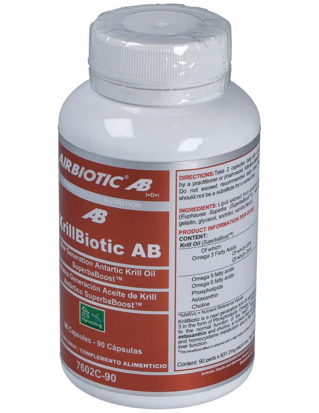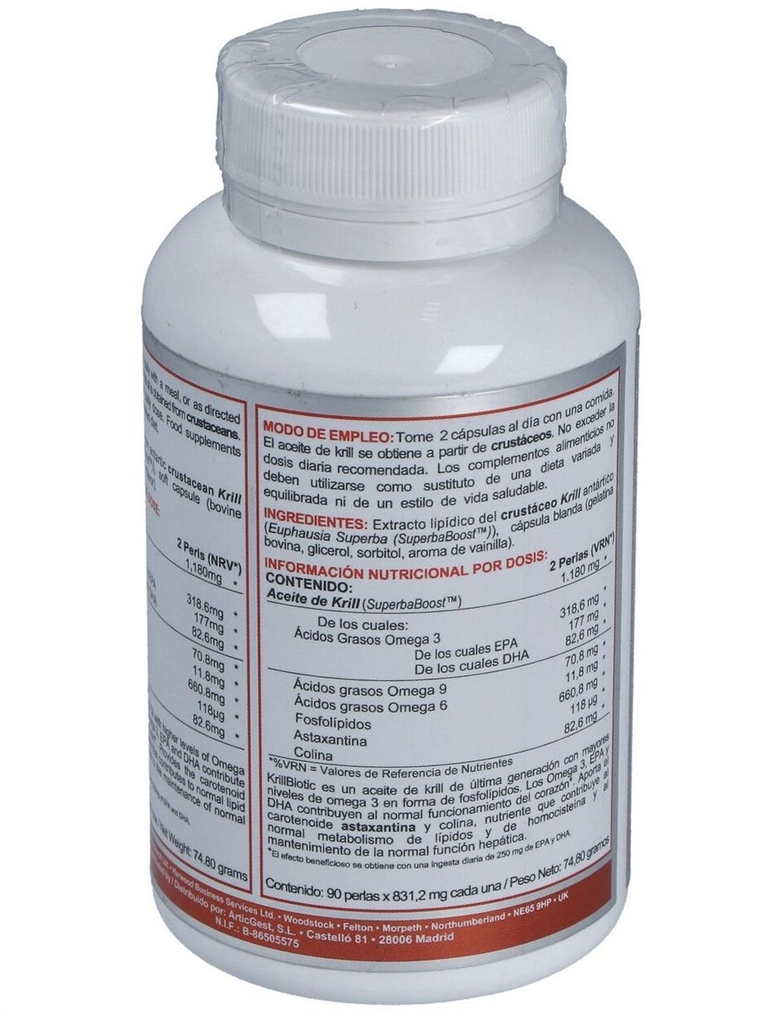 El aceite de krill se obtiene a partir de krill antártico (Euphasia Superba), un pequeño crustáceo que habita en las aguas del Océano Antártico y que se alimenta de fitoplancton (algas marinas) que le aportan omega 3 y el carotenoide astaxantina. En el aceite de krill los omega 3 están asociados principalmente a fosfolípidos, en vez de triglicéridos como ocurre en el aceite de pescado. Esto hace que los omega 3 se absorban y se utilicen mejor, además de hacer al producto más digerible y libre de las molestias digestivas como el reflujo y el regusto a pescado. Krill-Biotic es un aceite de krill de última generación que a través de un novedoso sistema tecnológico permite obtener mayores niveles de omega 3, de fosfolípidos y de colina, consiguiendo un producto mucho más concentrado que el aceite de krill estándar. Este proceso mejora también el color y el olor del aceite. Eco-Harvesting®: Krill-Biotic es un producto sostenible, recolectado mediante un sistema exclusivo que evita la captura de otras especies, y mantiene el krill vivo hasta su procesamiento, lo que evita el deterioro y oxidación de krill conservando así todas sus propiedades. Ingredientes activos por dosis diaria recomendada (2 perlas):