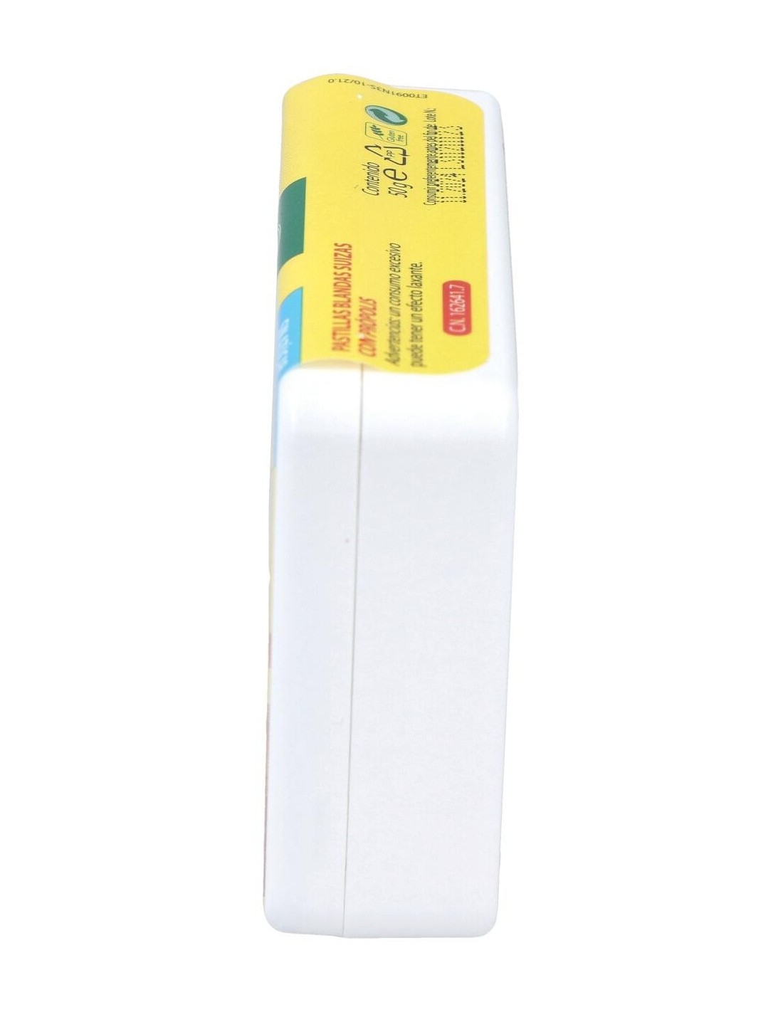 Ingredientes:Espesante: goma arábiga; edulcorantes: sorbitol, jarabe de maltitol, glucósidos de esteviol de Stevia; agua depurada; extracto de própolis (0,99%); aroma; agentes de revestimiento: aceite de coco y cera de carnauba.Modo de empleo:Dejar deshacer en la boca lentamente.Presentación:Envase de 50 gramos sabor miel.Recomendaciones y advertencias:Apto para vegetarianos. No contiene gluten, derivados lácteos, lactosa, azúcar y conservantes añadidos, colorantes artificiales.