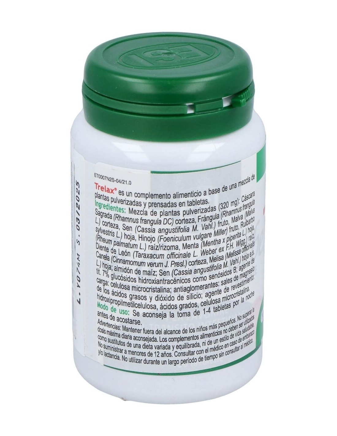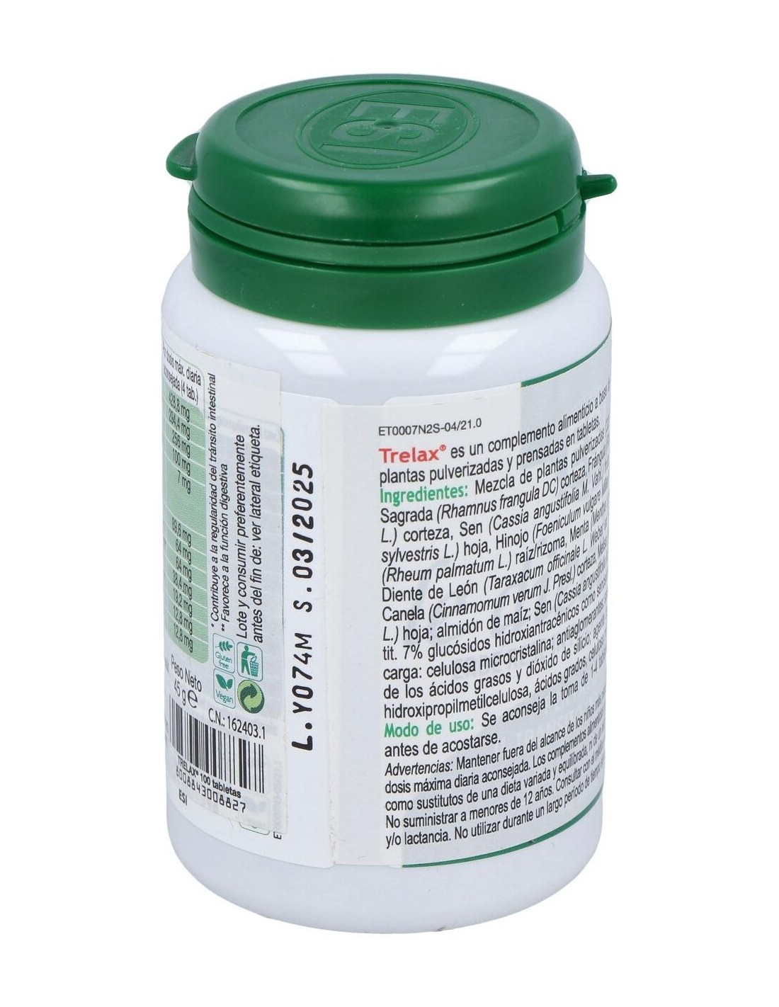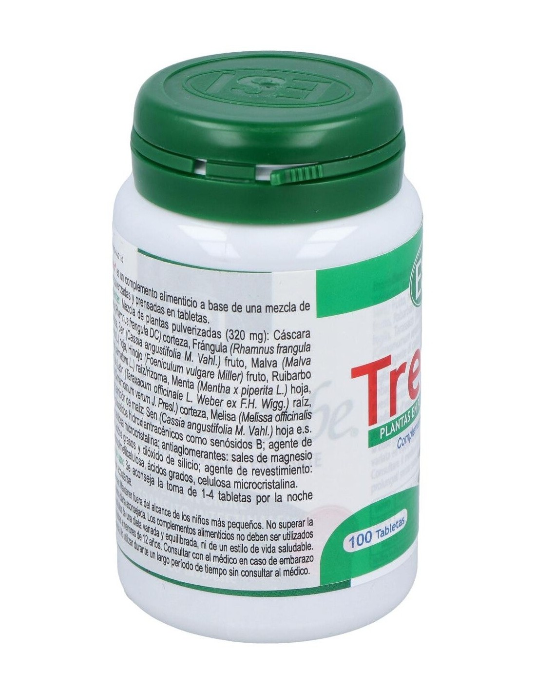 Ingredientes:Mezcla de hierbas pulverizadas: Cascara sagrada (Rhamnus purshiana DC) corteza, Aloe (Áloe ferox Millet) zumo, Hinojo (Foeniculum vulgare Millet) frutos, Sena (Cassia angustifolia Vahl.) hojas, Regaliz (Glycinhiza glabra L) raíz, Genciana (Gentiana lúteo L) raíz, Diente de león (Taraxacum officinale Web.) raíz, Rhamnus alpino (Rhamnus alpinus L ssp. Fallax M. et P) corteza, Ruibarbo (Rheum palmatum L.) raíz/rizomas, Marrubio (Matrubium vulgare L.) sumidad florida; maltodextrina de maíz, agente de carga: celulosa microcristalina; antiaglomerantes: sales de magnesio de los ácidos grasos y dióxido de silicio; agentes de revestimiento: hidroxipropilmetilcelulosa, ácidos grasos, celulosa microcristalina. Modo de empleo:Tomar de 1 a 3 comprimidos al día antes de acostarse con abundante agua. Presentación:Envase de 100 comprimidos.Recomendaciones y advertencias: No contiene gluten, soja, edulcorantes, conservantes, colorantes.