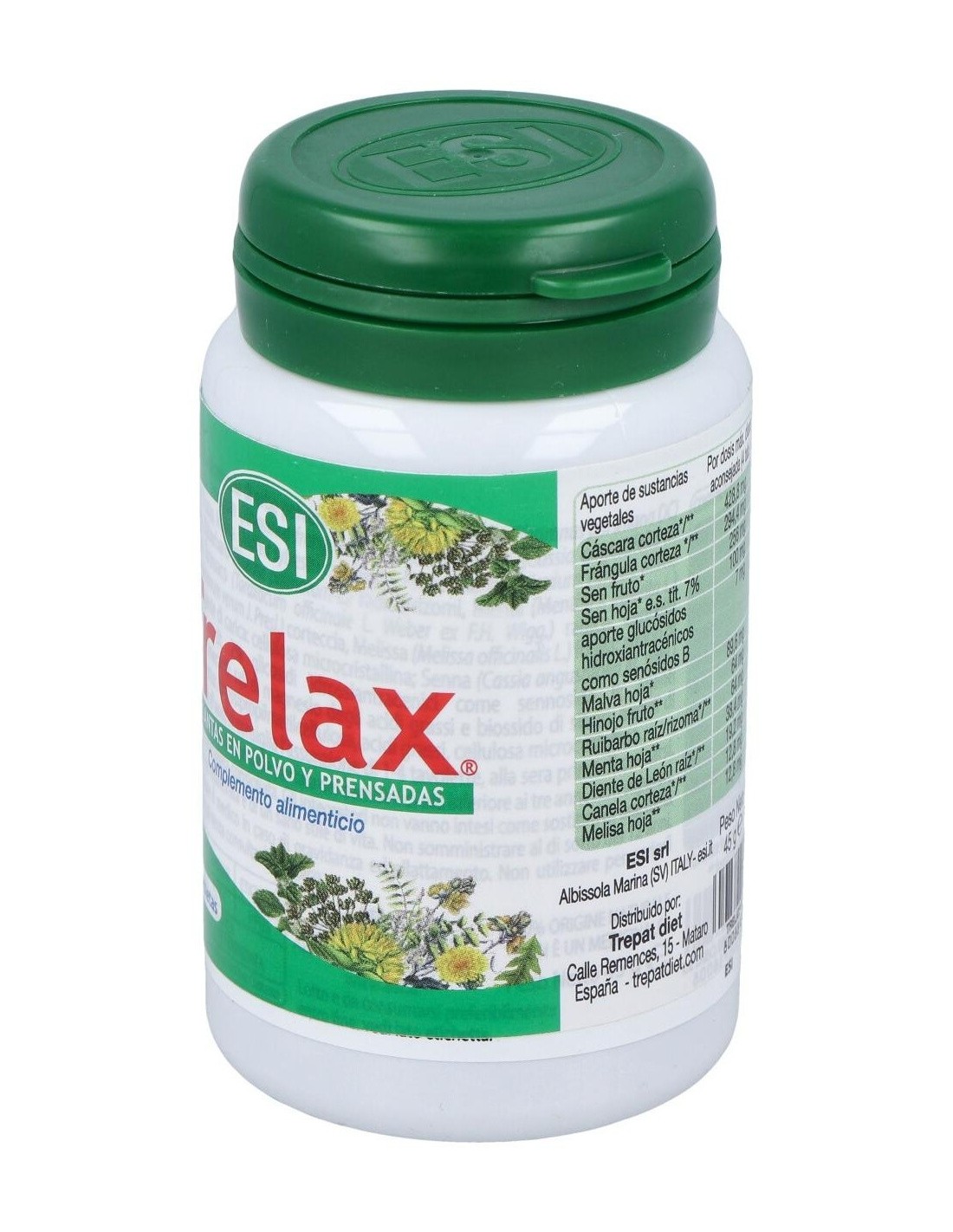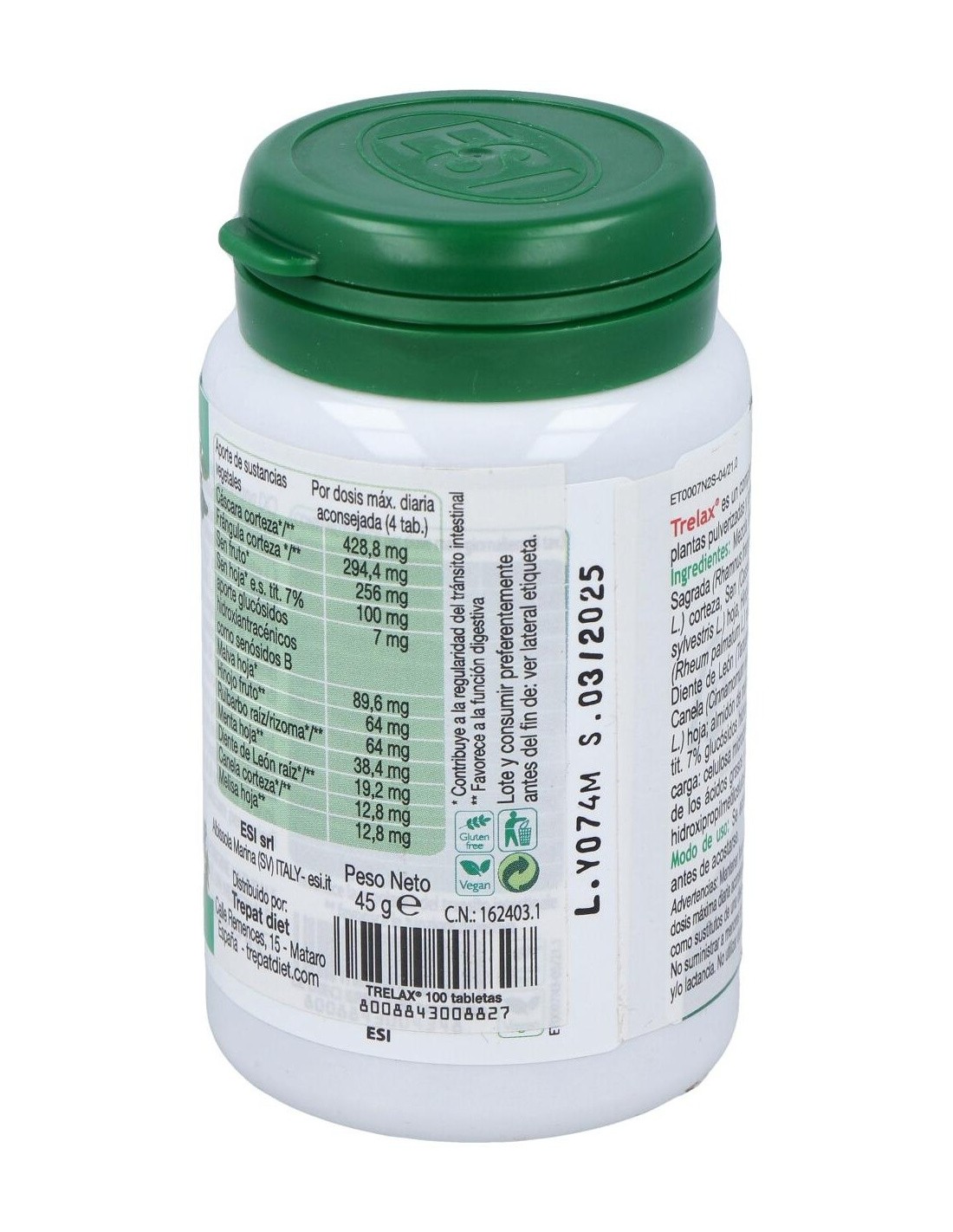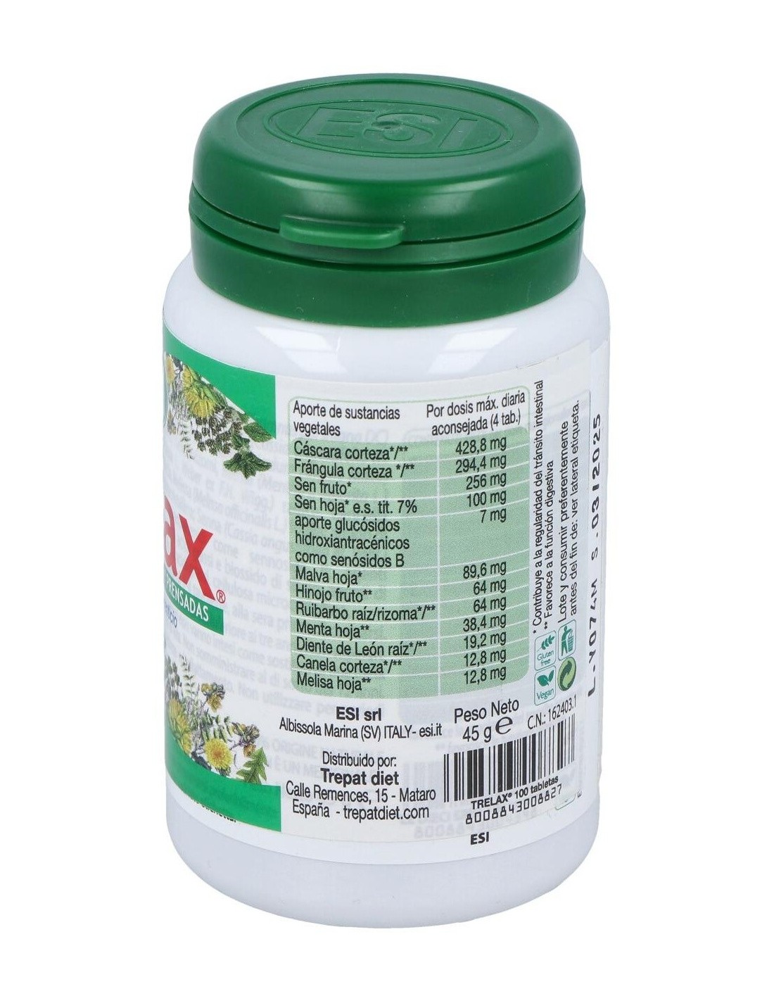 Ingredientes:Mezcla de hierbas pulverizadas: Cascara sagrada (Rhamnus purshiana DC) corteza, Aloe (Áloe ferox Millet) zumo, Hinojo (Foeniculum vulgare Millet) frutos, Sena (Cassia angustifolia Vahl.) hojas, Regaliz (Glycinhiza glabra L) raíz, Genciana (Gentiana lúteo L) raíz, Diente de león (Taraxacum officinale Web.) raíz, Rhamnus alpino (Rhamnus alpinus L ssp. Fallax M. et P) corteza, Ruibarbo (Rheum palmatum L.) raíz/rizomas, Marrubio (Matrubium vulgare L.) sumidad florida; maltodextrina de maíz, agente de carga: celulosa microcristalina; antiaglomerantes: sales de magnesio de los ácidos grasos y dióxido de silicio; agentes de revestimiento: hidroxipropilmetilcelulosa, ácidos grasos, celulosa microcristalina. Modo de empleo:Tomar de 1 a 3 comprimidos al día antes de acostarse con abundante agua. Presentación:Envase de 100 comprimidos.Recomendaciones y advertencias: No contiene gluten, soja, edulcorantes, conservantes, colorantes.