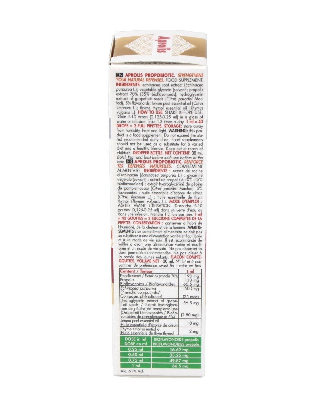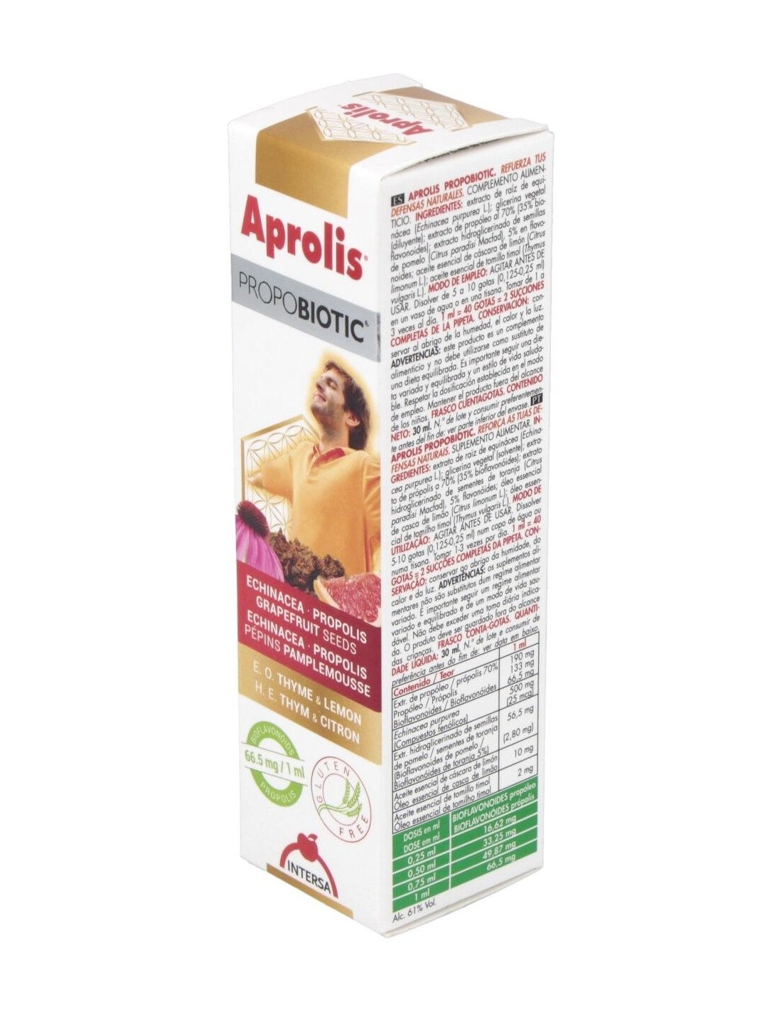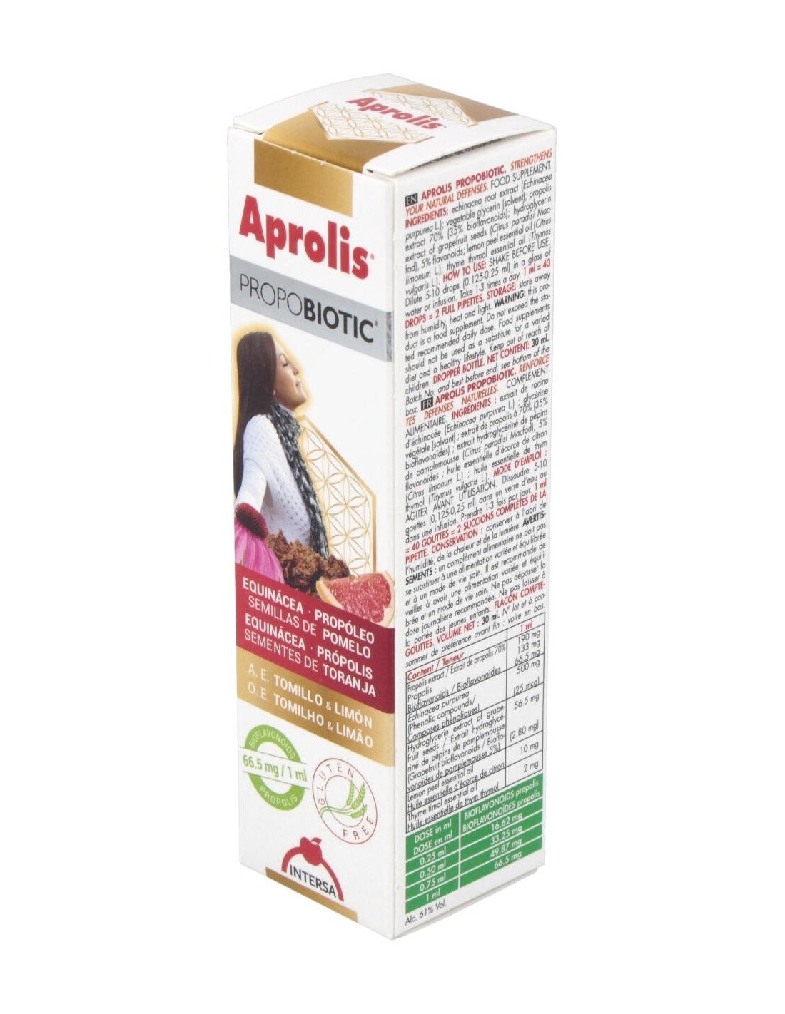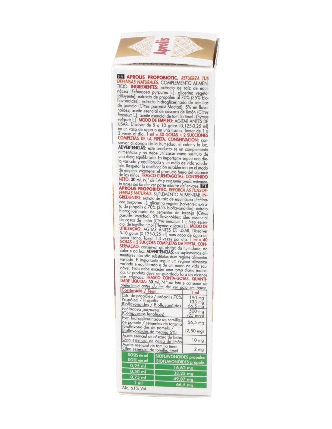 Este producto está compuesto por diferentes plantas con importante acción potenciadora de nuestro sistema inmune como son la equinácea, propóleo y semillas de pomelo además de aceites esenciales de tomillo y limón. Todos estos ingredientes conjugados tienen un efecto estimulante inmunitario y antibiótico natural (antibacteriano, antimicótico, antiviral y antiparasitario). Este beneficia también al terreno orgánico, puesto que contribuye a potenciar la depuración linfática y ayuda a equilibrar el pH de os fluidos fisiológicos, haciendo hostil el medio para el agente infeccioso. Ingredientes: