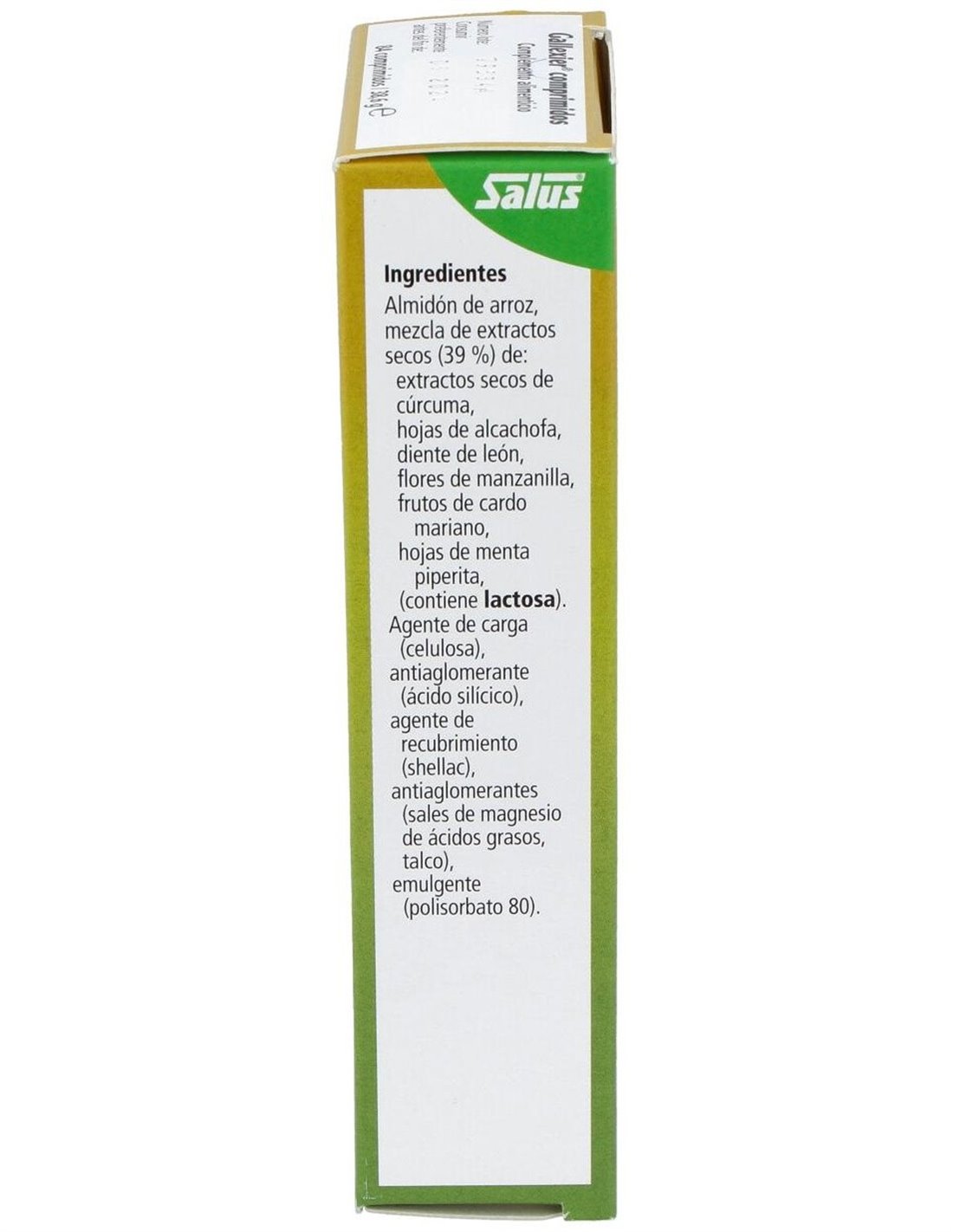 Ingredientes: Mezcla de extractos secos (37,4%): extracto seco de hojas de alcachofa, cúrcuma, diente de león, flores de manzanilla, frutos de cardo mariano, hojas de menta piperita. Modo de empleo:Tomar durante o después de las comidas de 2 a 3 comprimidos con suficiente líquido. Presentación:Envase de 84 comprimidos.
