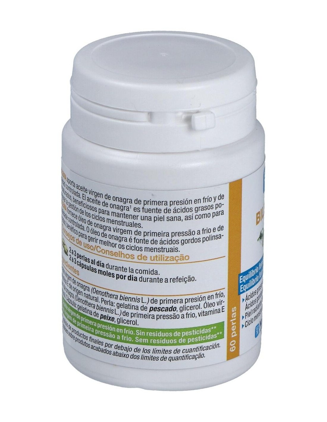 Aceite virgen de onagra (Oenothera biennis L.) de primera presión en frío, vitamina E de origen natural. Perla: Gelatina de pescado, glicerol.