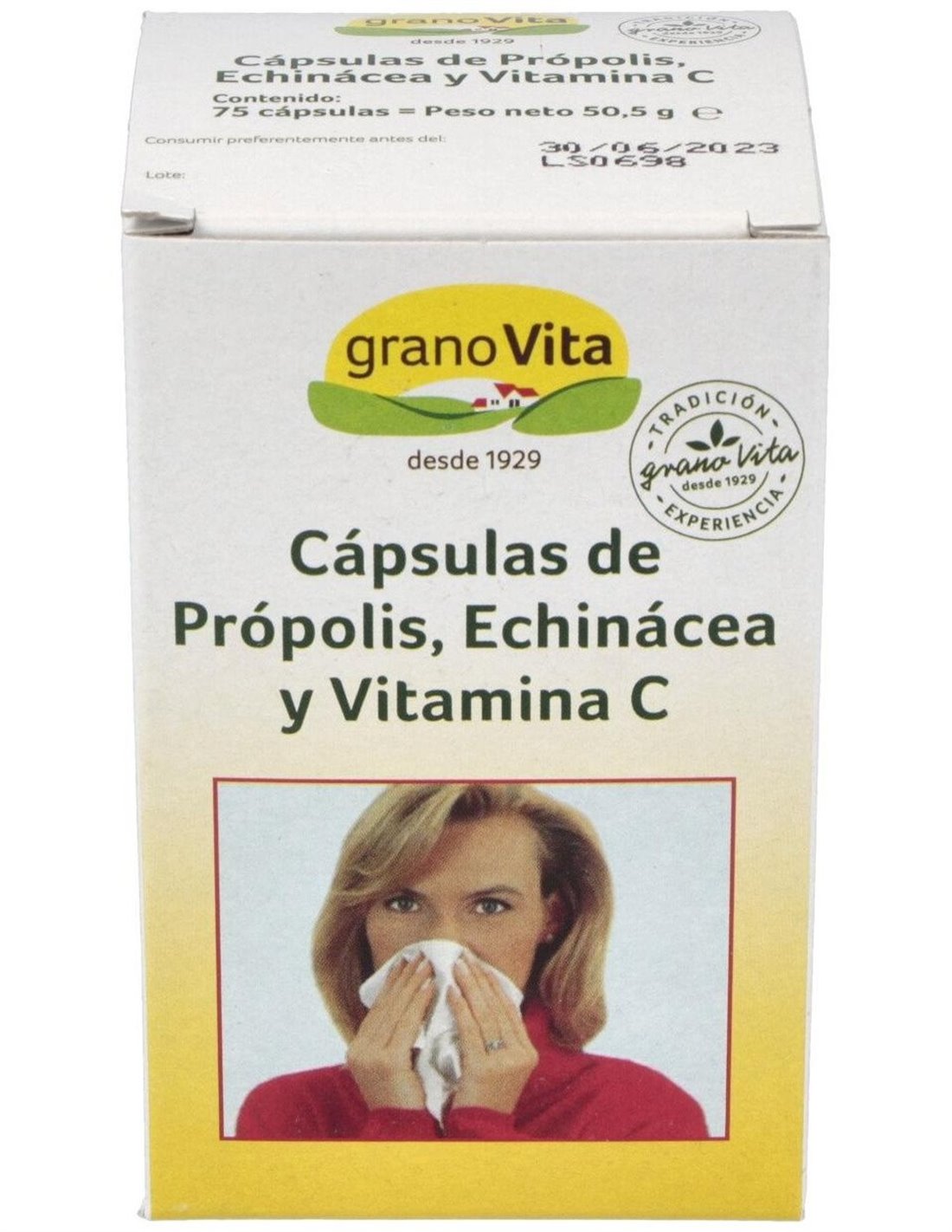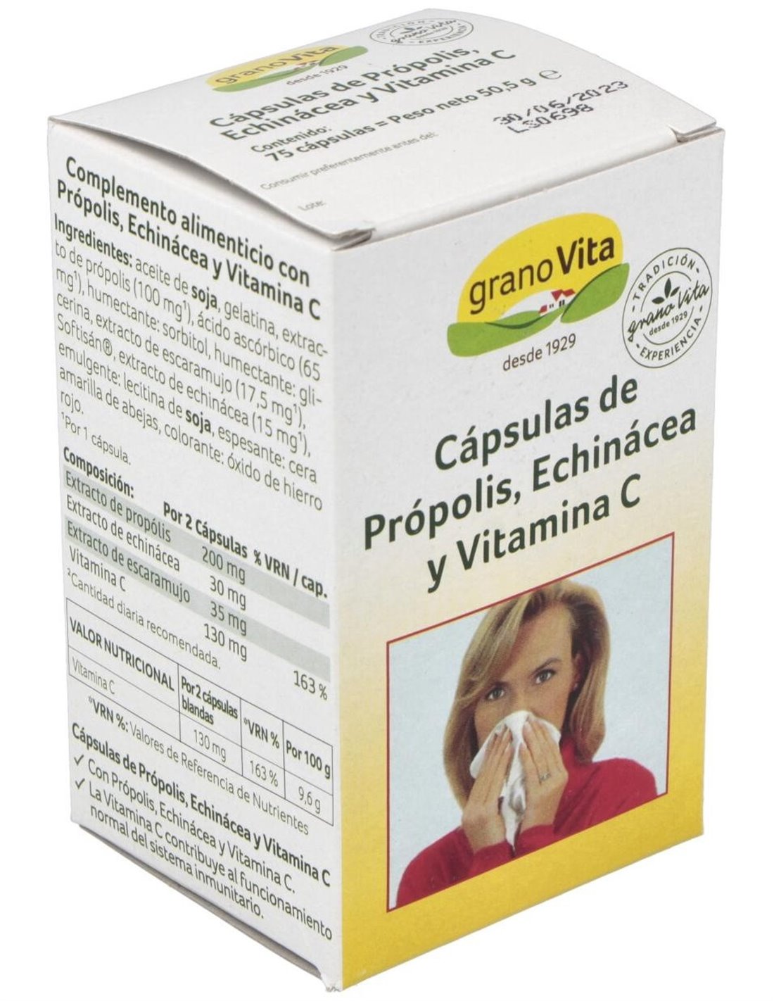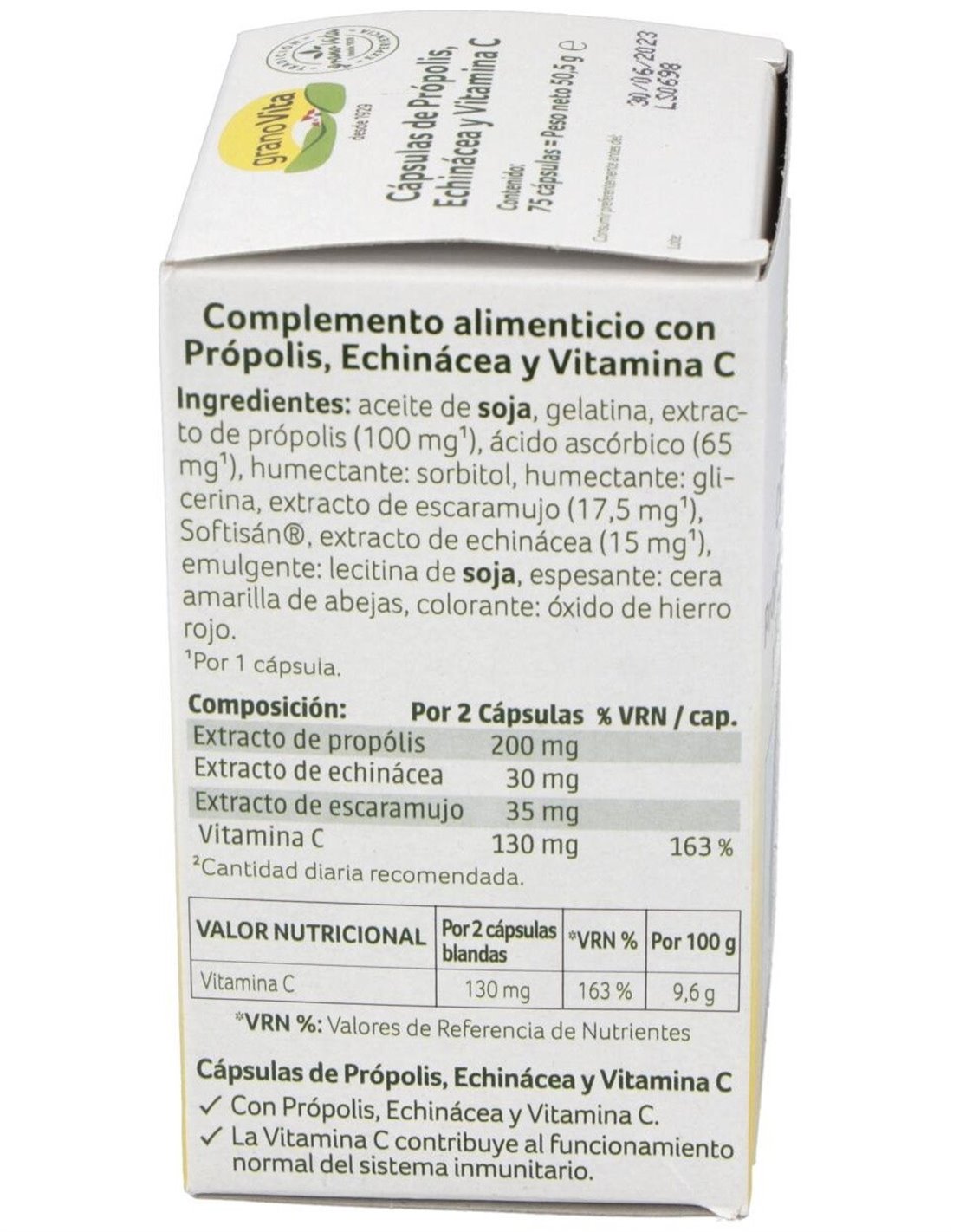 Ingredientes:Aceite de soja, gelatina, extracto de própolis, ácido ascórbico, humectante: sorbitol, humectante: glicerina, extracto de escaramujo, Softisán®, extracto de echinácea, emulgente: lecitina de soja, espesante: cera amarilla de abejas, colorante: óxido de hierro rojo.Modo de empleo:Tomar de 1 a 3 diarias y hasta 6 al día en casos necesarios.Presentación:Envase de 75 cápsulas.