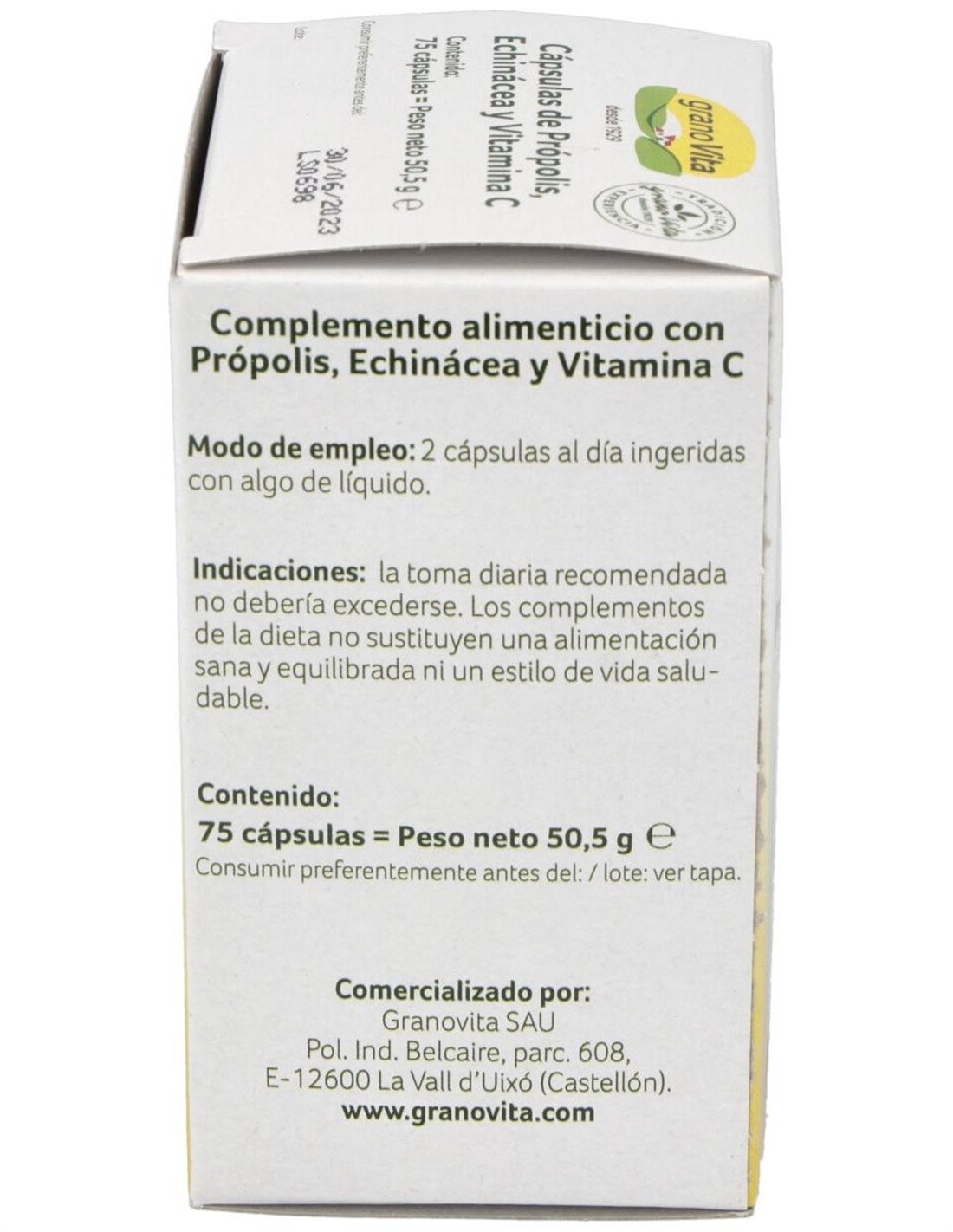 El propóleo es un producto elaborado por las abejas a partir de las resinas y secreciones que cubren las yemas y cortezas de las coníferas. Los componentes más importantes del extracto de propóleo son los aminoácidos, flavonoides, terpenos y derivados de los ácidos cinámicos con propiedades antioxidantes. El propóleo se ha utilizado en la medicina tradicional como antiséptico y antiinflamatorio natural. La vitamina C interviene en el metabolismo energético, funcionamiento del sistema inmune, cuidado de la piel, huesos, sistema nervioso, reduce el daño oxidativo y combate el cansancio y la fatiga.Composición activa por 2 cápsulas: