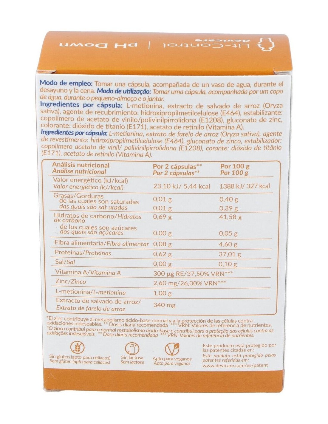 L-Metionina (500 mg), extracto de salvado de arroz (fitato cálcico magnésico), gluconato de zinc, vitamina A. Excipientes: Maltodextrina (agente de carga), dióxido de silicio (antiapelmazante), estearato de magnesio (fluidificante). Cápsula: Hidroxipropilmetilcelulosa (agente de recubrimiento), dióxido de titanio (colorante).