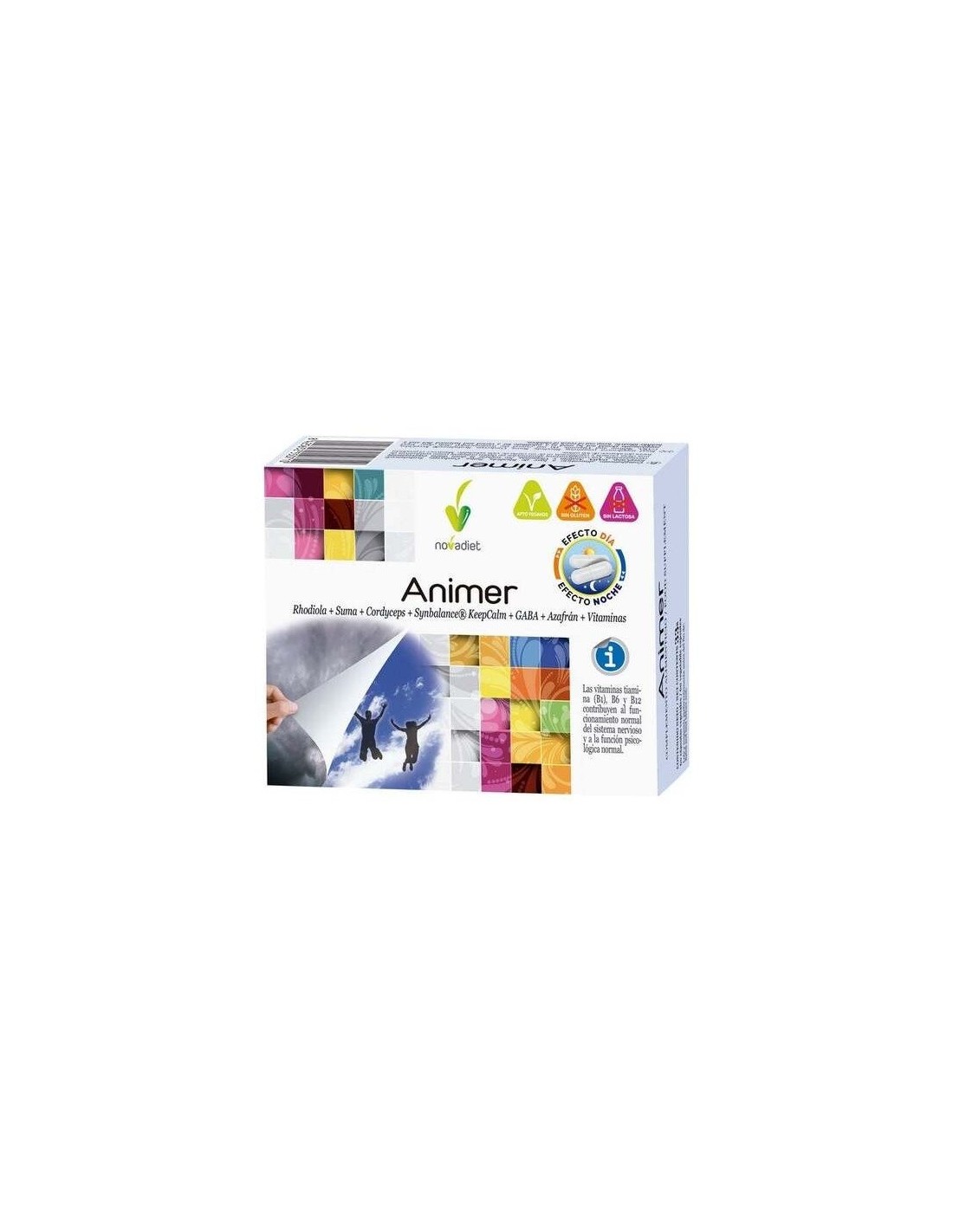 Animer Día (blíster naranja): Rhodiola, Suma (Pfaffia paniculata E.S.), Cordyceps sinensis, Azafrán (E.S., titulado al 2% en safranal), Antiaglomerantes (fosfato cálcico dibásico, celulosa microcristalina, estearato de magnesio). Cubierta: Agua, Hidroxipropilmetilcelulosa, Óxido de cinc (2,34 mg Zn).
