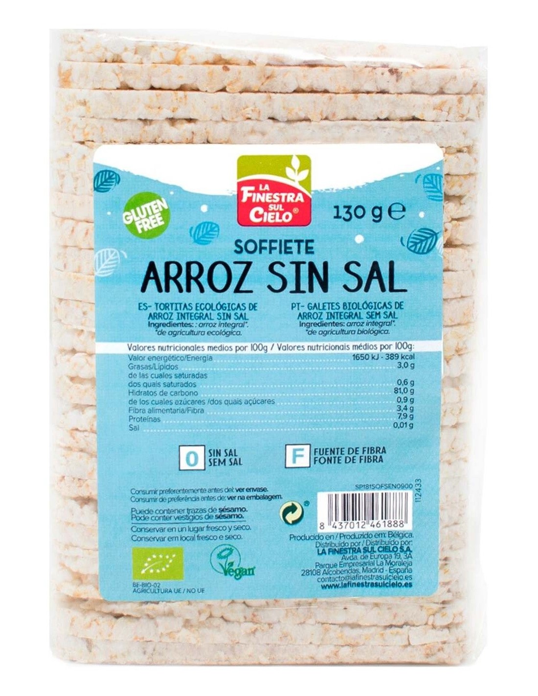 Arroz integral* (100%). Valor nutricional por 100 g: Valor energético kcal.389 kJ.1650 Grasas: 3.000 g de las cuales, saturadas 0.600 g Hidratos de carbono 81.000 g de los cuales, azúcares 0.900 g Fibra alimentaria 3.400 g Proteínas 7.900 g Sal 0.010 g (*)= De agricultura ecológica. + Puede contener trazas de sésamo.