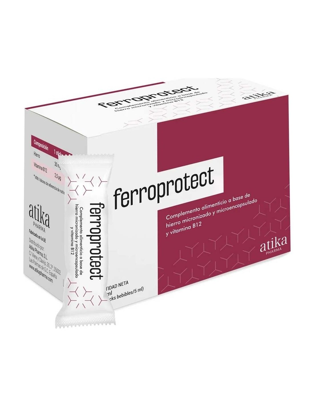 Complemento alimenticio a base de hierro micronizado y microencapsulado y vitamina B12, con una excelente absorción y tolerancia. Formulado en cómodos sticks bebibles, para tomar en cualquier momento y lugar, sin necesidad de agua. Su excelente sabor ha sido reconocido en premios internacionales. La tecnología avanzada por la que el hierro de Ferroprotect es sometido a un proceso de micronizado (se reduce el tamaño de partícula) y microencapsulado (las partículas se introducen dentro de unas esferas microscópicas formadas por ácidos grasos) hace que tenga una óptima tolerabilidad gastrointestinal y mayor absorción. \ El hierro contribuye a la formación normal de glóbulos rojos y de hemoglobina, al transporte normal de oxígeno en el cuerpo y a disminuir el cansancio y la fatiga, así como a mantener una función normal del sistema inmunitario, del sistema nervioso y a mantener una función cognitiva normal entre otras funciones fisiológicas. Producto apto para veganos.