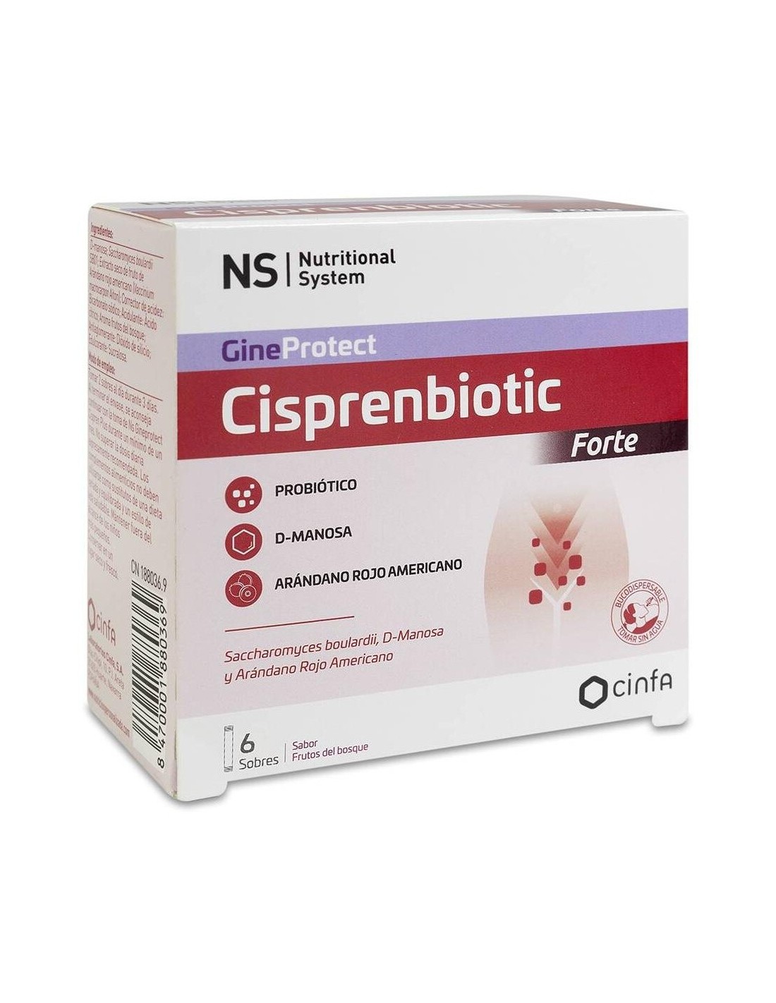 D-manosa; Saccharomyces boulardii (contiene leche y derivados); Extracto seco de arándano rojo americano (Vaccinium macrocarpon); Corrector de acidez: Bicarbonato sódico; Acidulante: Ácido cítrico; Aroma frutos del bosque; Antiaglomerante: Dióxido de silicio; Edulcorante: Sucralosa.