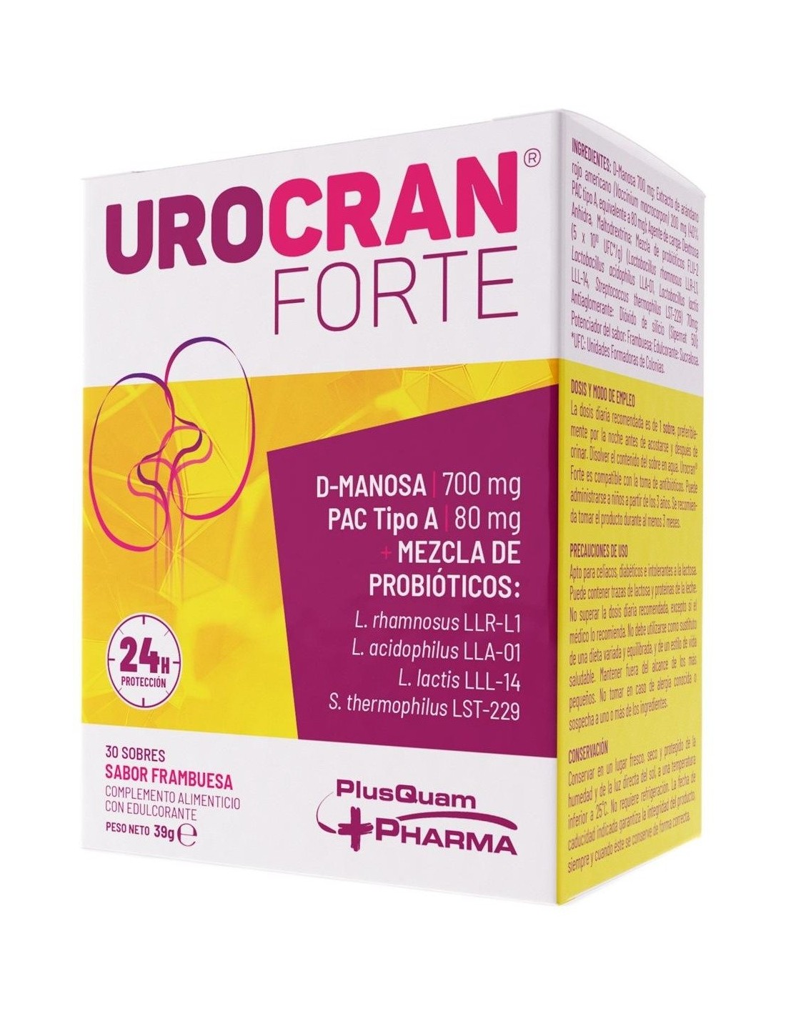 Contiene una combinación única de tres ingredientes: D-Manosa + PAC Tipo A (Arándano rojo) + Probióticos, que contribuyen al normal funcionamiento del tracto urinario, así como del sistema excretor e inmunitario. Gracias a la proporción adecuada y en equilibrio de sus ingredientes, Urocran® Forte puede tomarse en periodos de larga duración. Es compatible con la toma de antibióticos, puede administrarse a niños a partir de 3 años, es apto para embarazadas y compatible con la lactancia. Sabor a frambuesa.