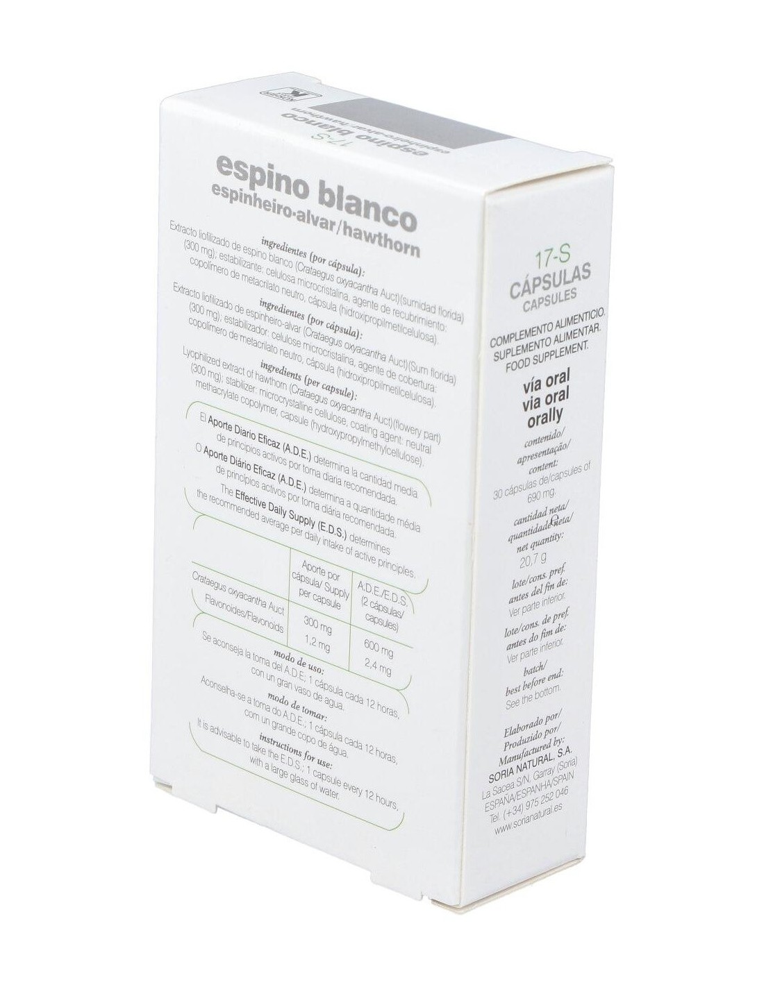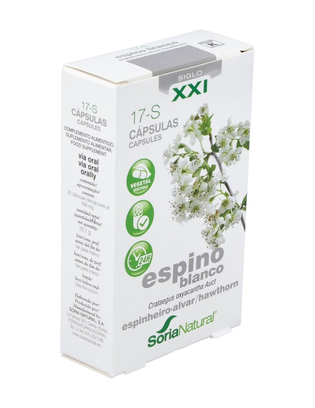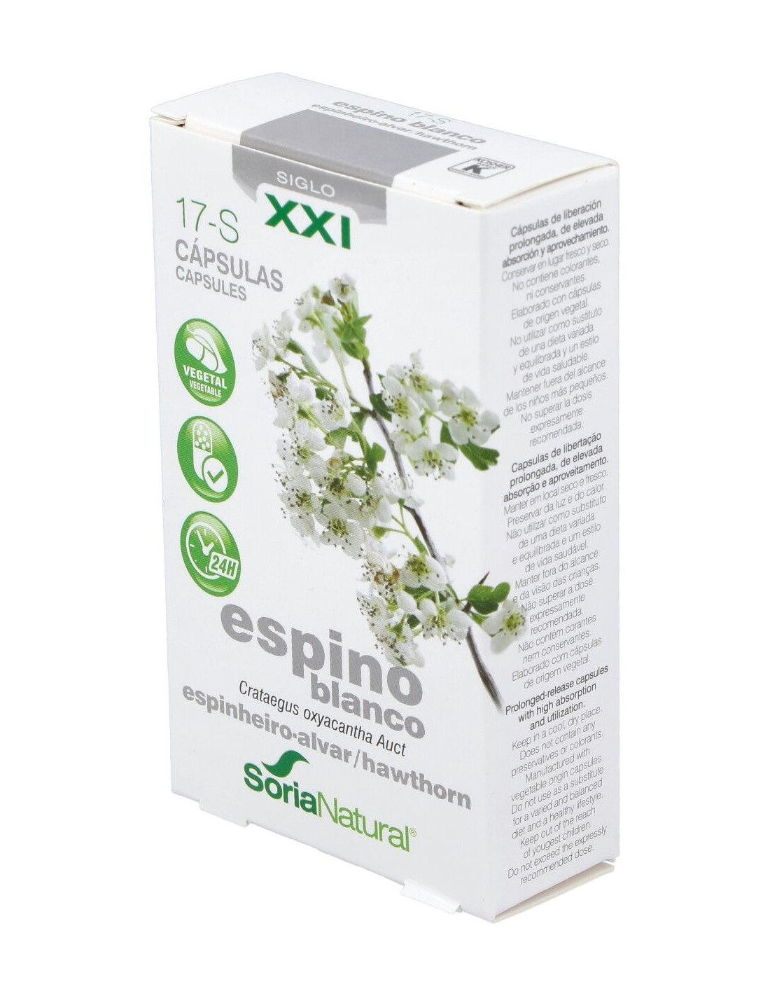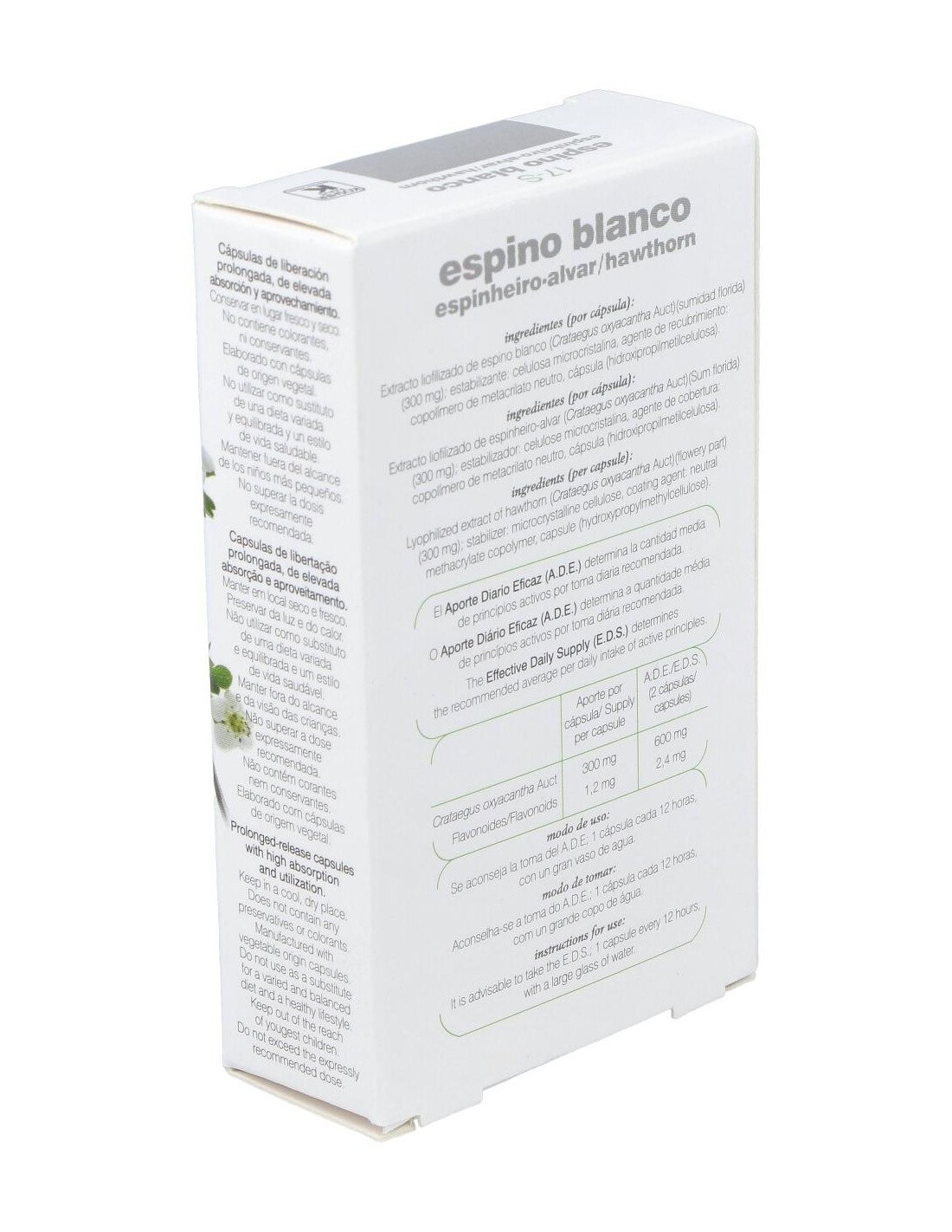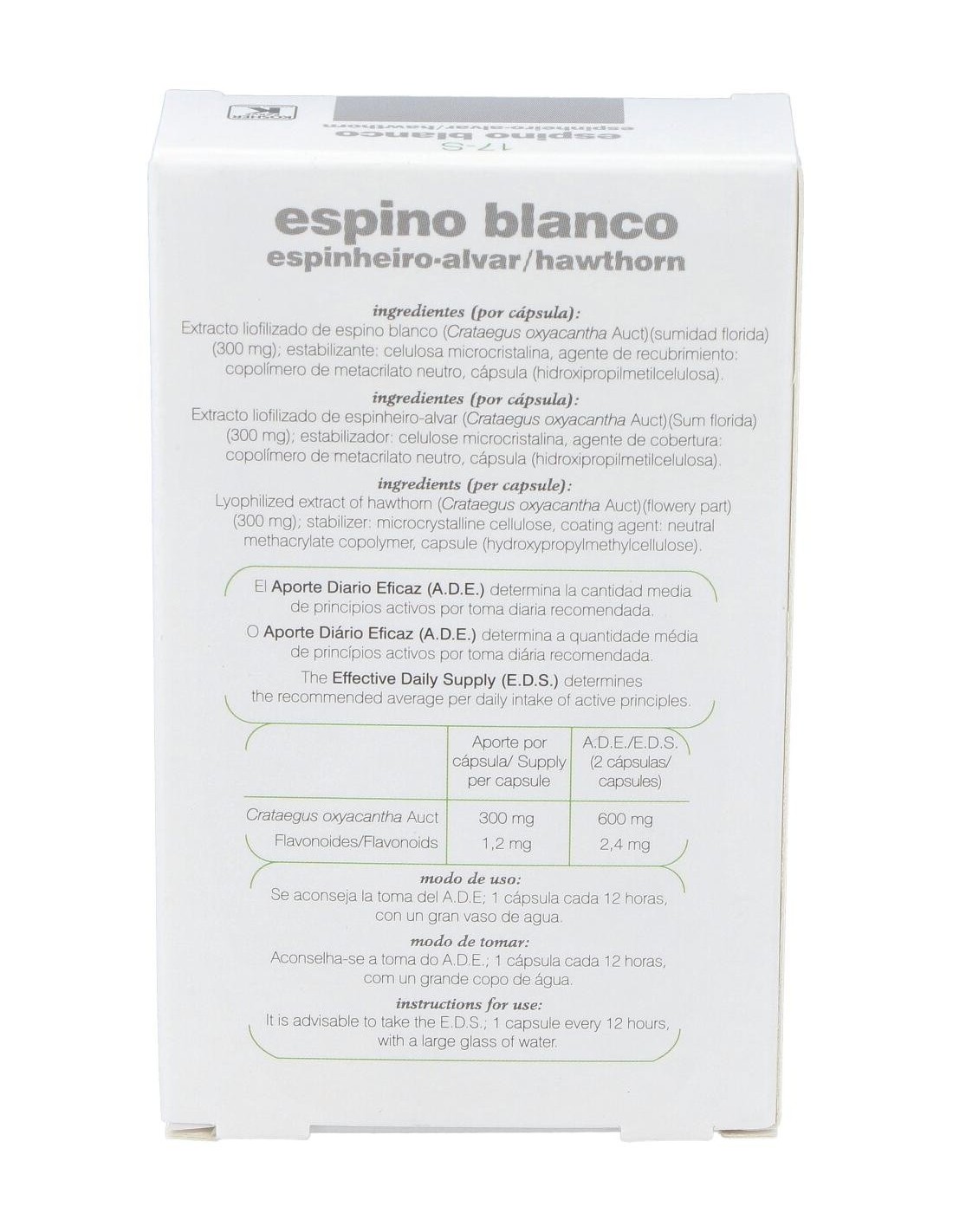 El espino blanco o Crataegus oxyacantha L. ha sido empleado desde tiempos antiguos para mejorar la circulación coronaria y la nutrición del músculo cardiaco. Este producto se elabora utilizando hojas y flores deshidratadas de buena calidad. El espino blanco se utiliza para ayudar a la función del corazón, mejorar la circulación y mantener un aporte de sangre y nutrientes adecuado al corazón. También se utiliza como tranquilizante del sistema nervioso, ayuda a regular la tensión arterial y alivia los espasmos. Composición:Extracto liofilizado de espino blanco; estabilizador: celulosa microcristalina, agente de recubrimiento: copolímero de metacrilato neutro.