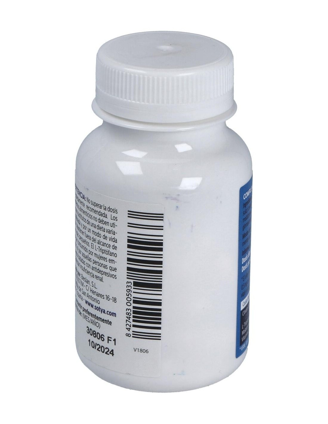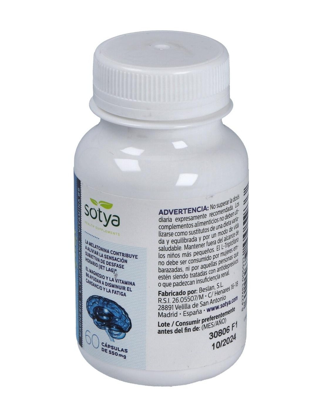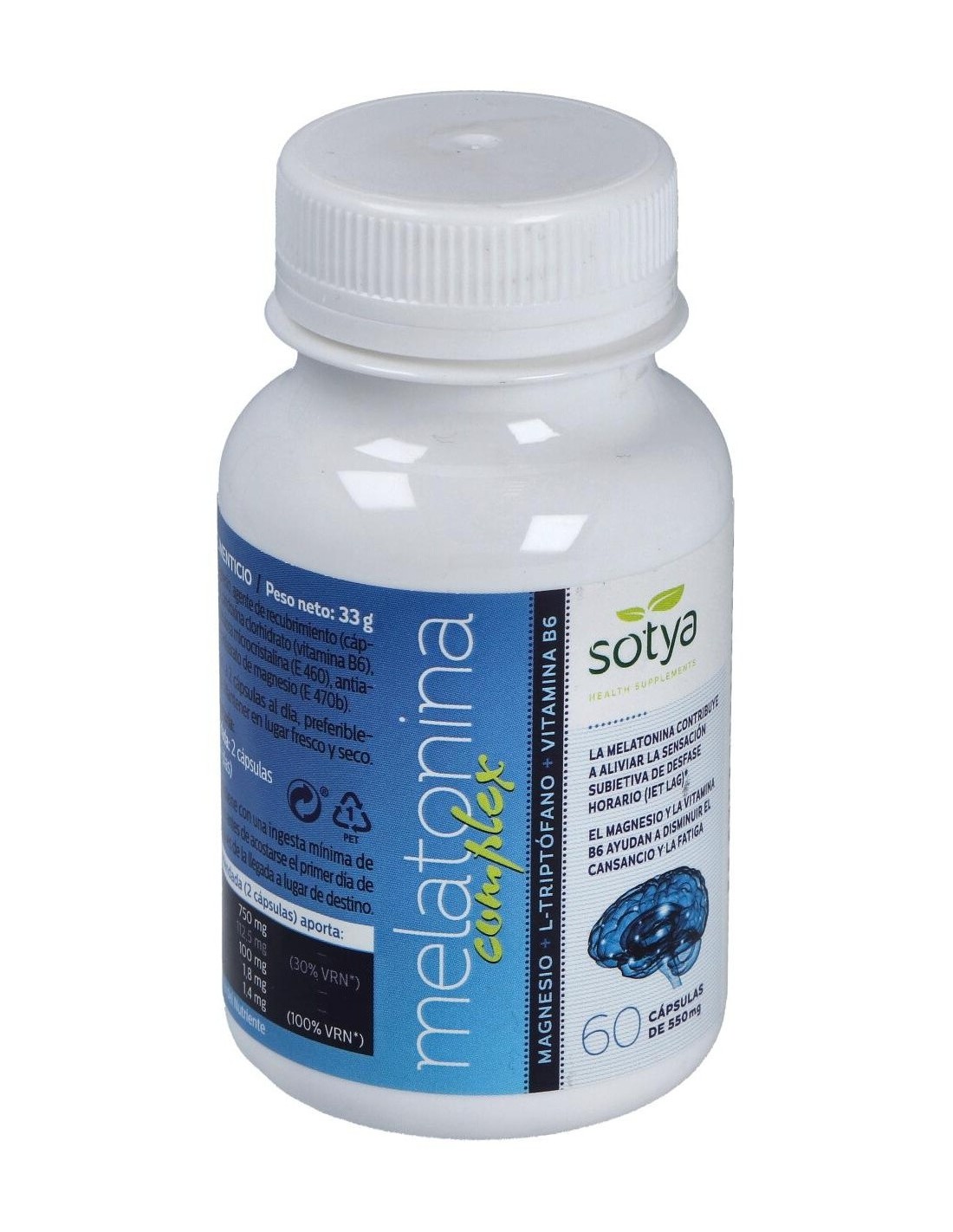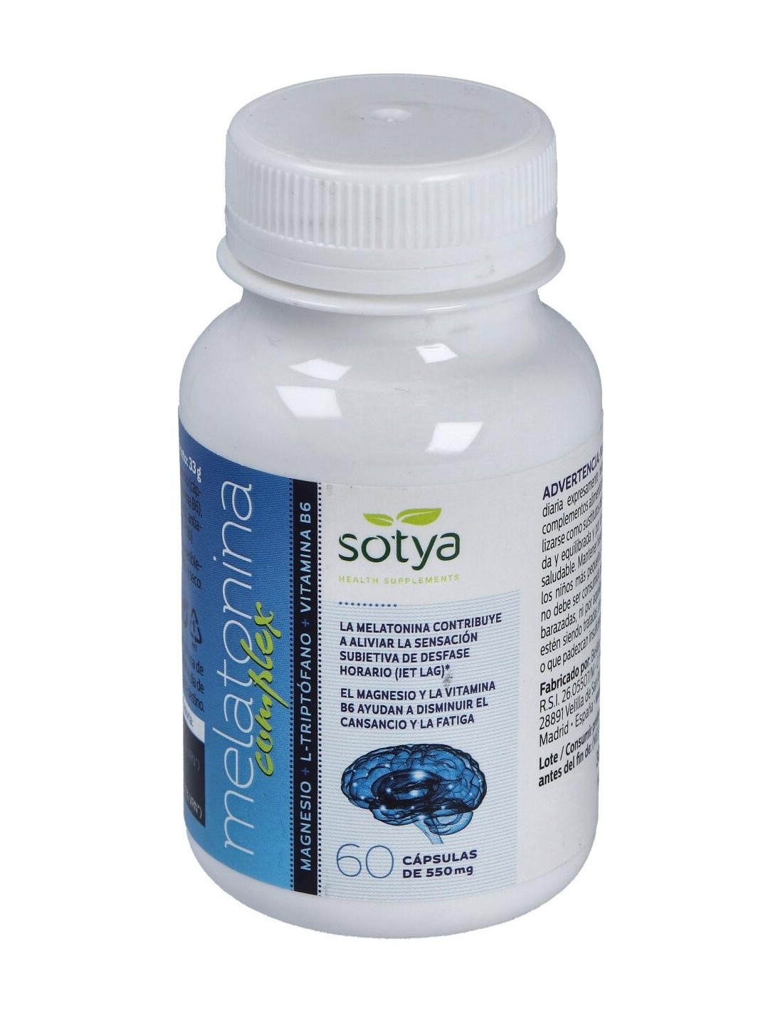 Melatonina Complex Magnesio+L-Triptofano+Vitamina B6 550Mg Cáps. 60U de Sotya es un suplemento para adultos que contribuye a la regulación del ciclo de sueño, combinando melatonina, magnesio y vitamina B6 para apoyar el bienestar nocturno.