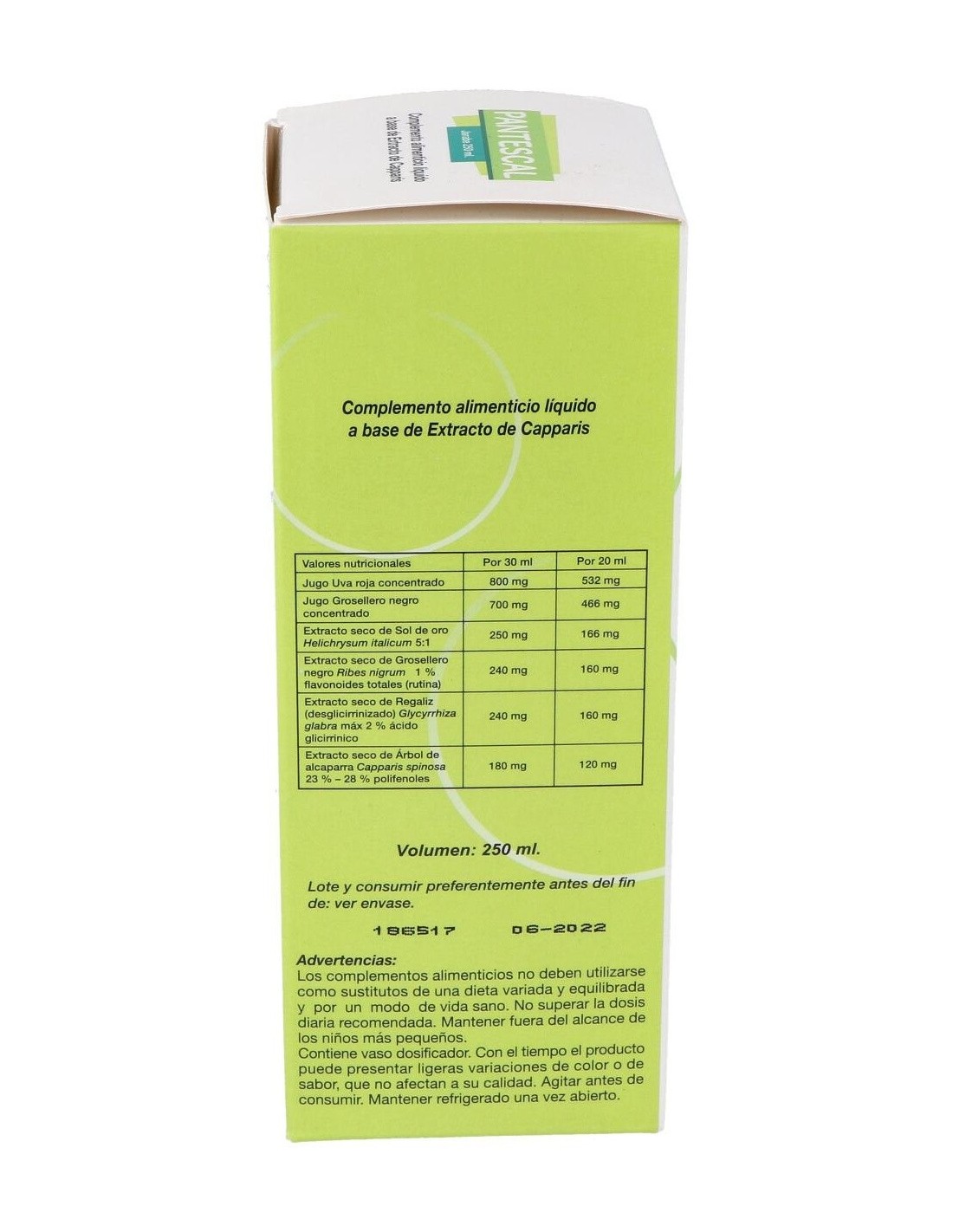 El jarabe Pantescal está elaborado con ingredientes cuidadosamente seleccionados para asegurar una textura homogénea y un sabor agradable, facilitando su uso continuo. Su envase de 250 ml está diseñado para conservar la calidad del producto durante su vida útil.