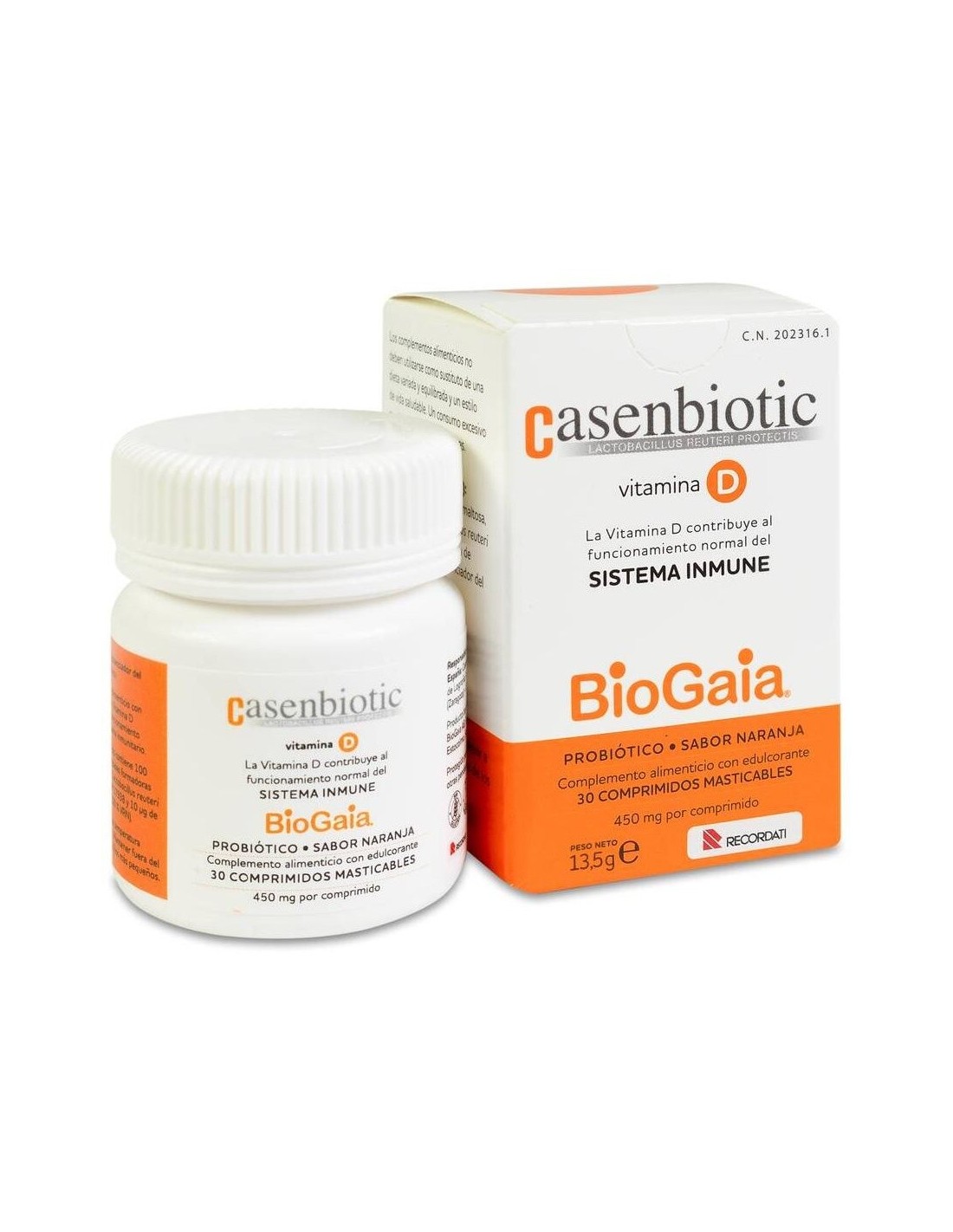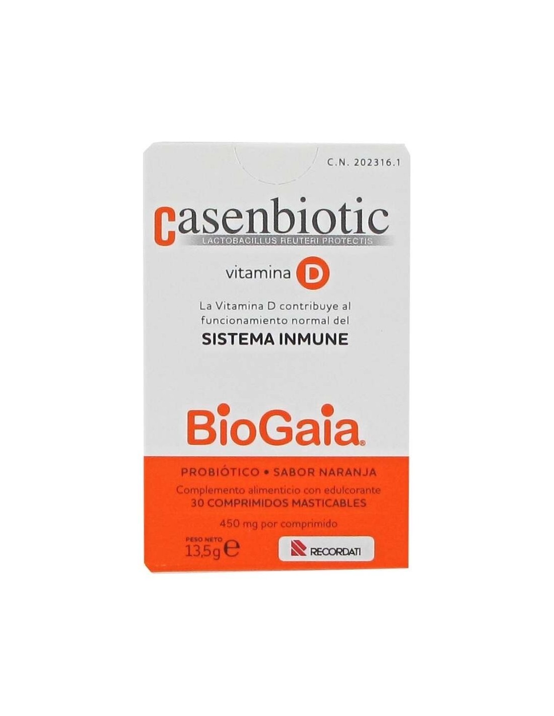 Comprimidos masticables de sabor naranja con fermentos lácticos vivos Lactobacillus reuteri Protectis® DSM 17938 y Vitamina D3, la cual contribuye a mantener el sistema inmune en condiciones normales.