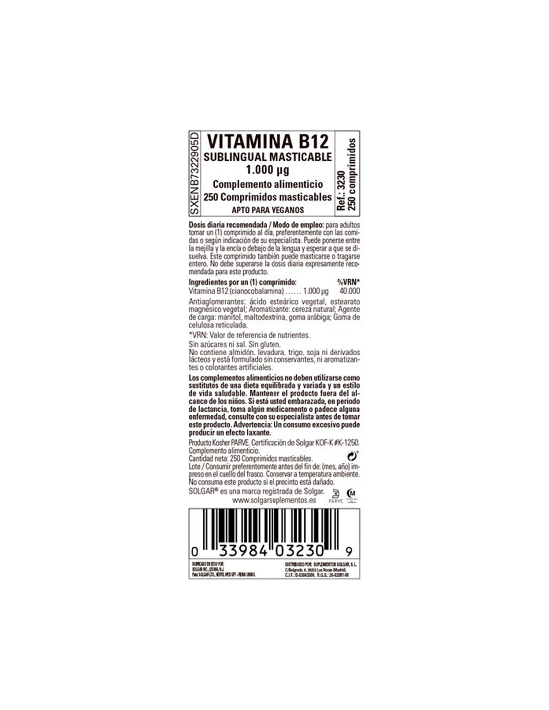 SOLGARVitamina B12 Cianocobalamina 1000Mcg 250Comp.Mast de Solgar: Características y Beneficios Increíbles