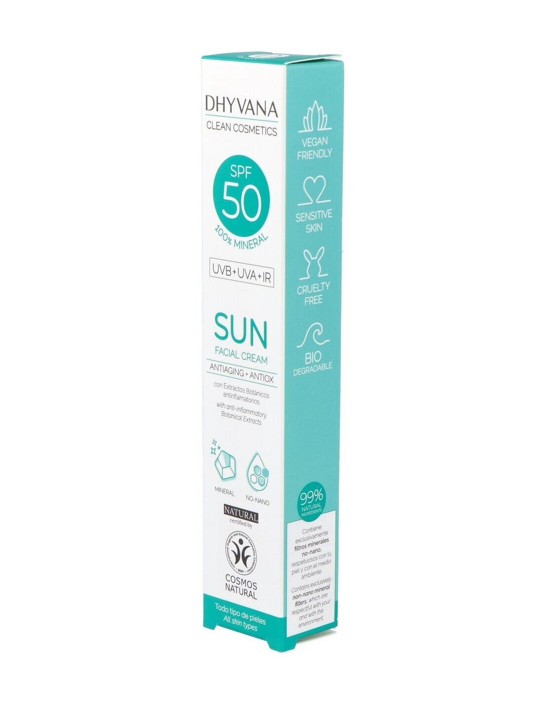 Eco Suncare® Protector Solar Spf50 de Dhyvana es un filtro solar físico que proporciona una fotoprotección de amplio espectro frente a las radiaciones UVA y UVB para todos los fototipos. Gracias a su alto factor de protección, ayuda eficazmente a prevenir quemaduras causadas por el sol, así como la oxidación y el envejecimiento cutáneo. Su composición natural, 100% mineral y sin nanopartículas, es respetuosa con el medio ambiente y puede utilizarse en ecosistemas acuáticos protegidos.
