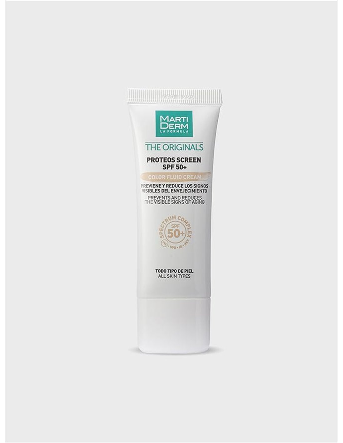 Martiderm Proteos Screen SPF50+ Color Fluid Cream 40ml es un protector solar que protege de los rayos UVA, UVB, IR y HEV evitando quemaduras, ayuda a unificar el tono de la piel y a prevenir el fotoenvejecimiento.