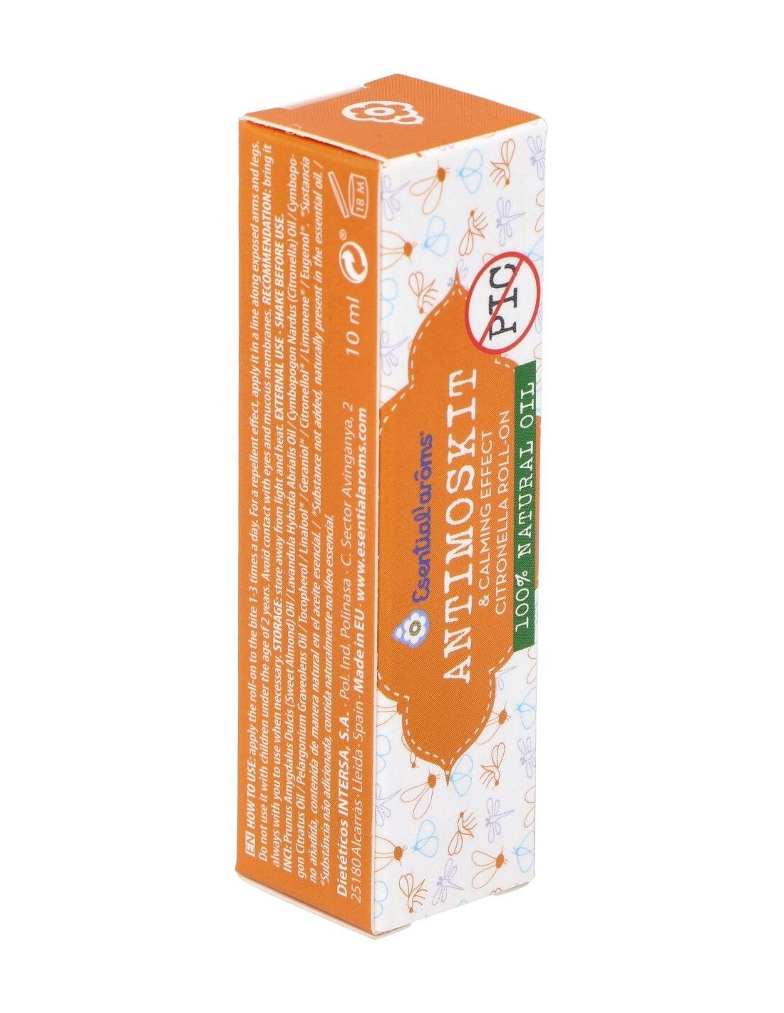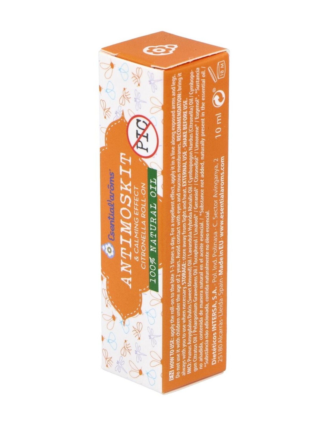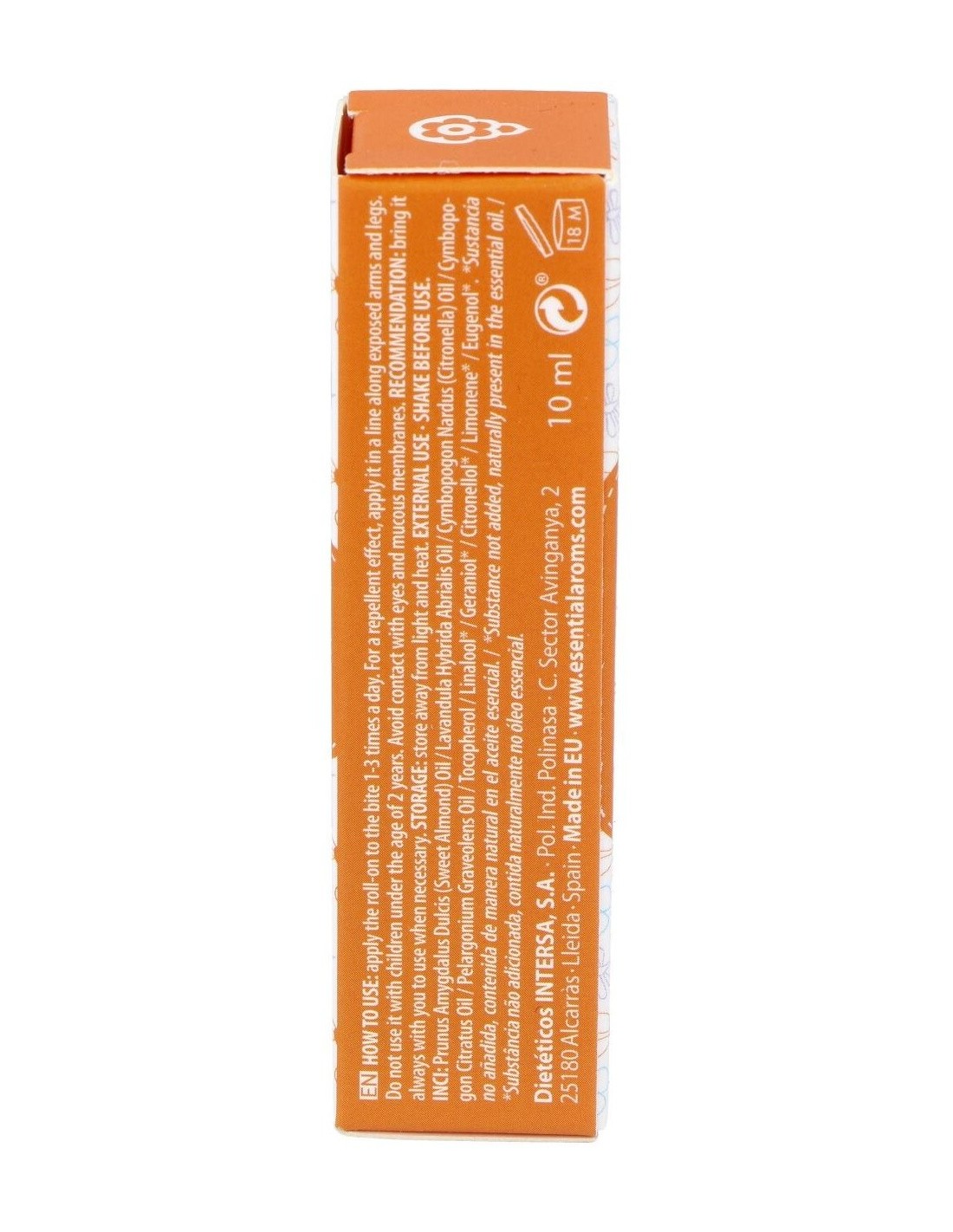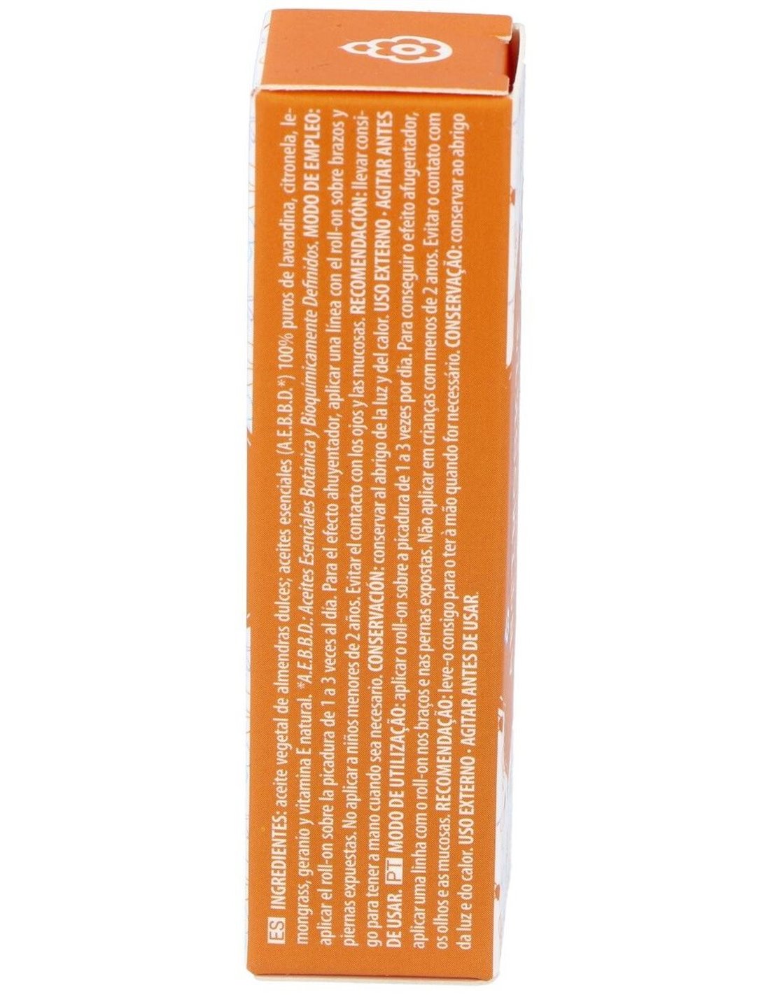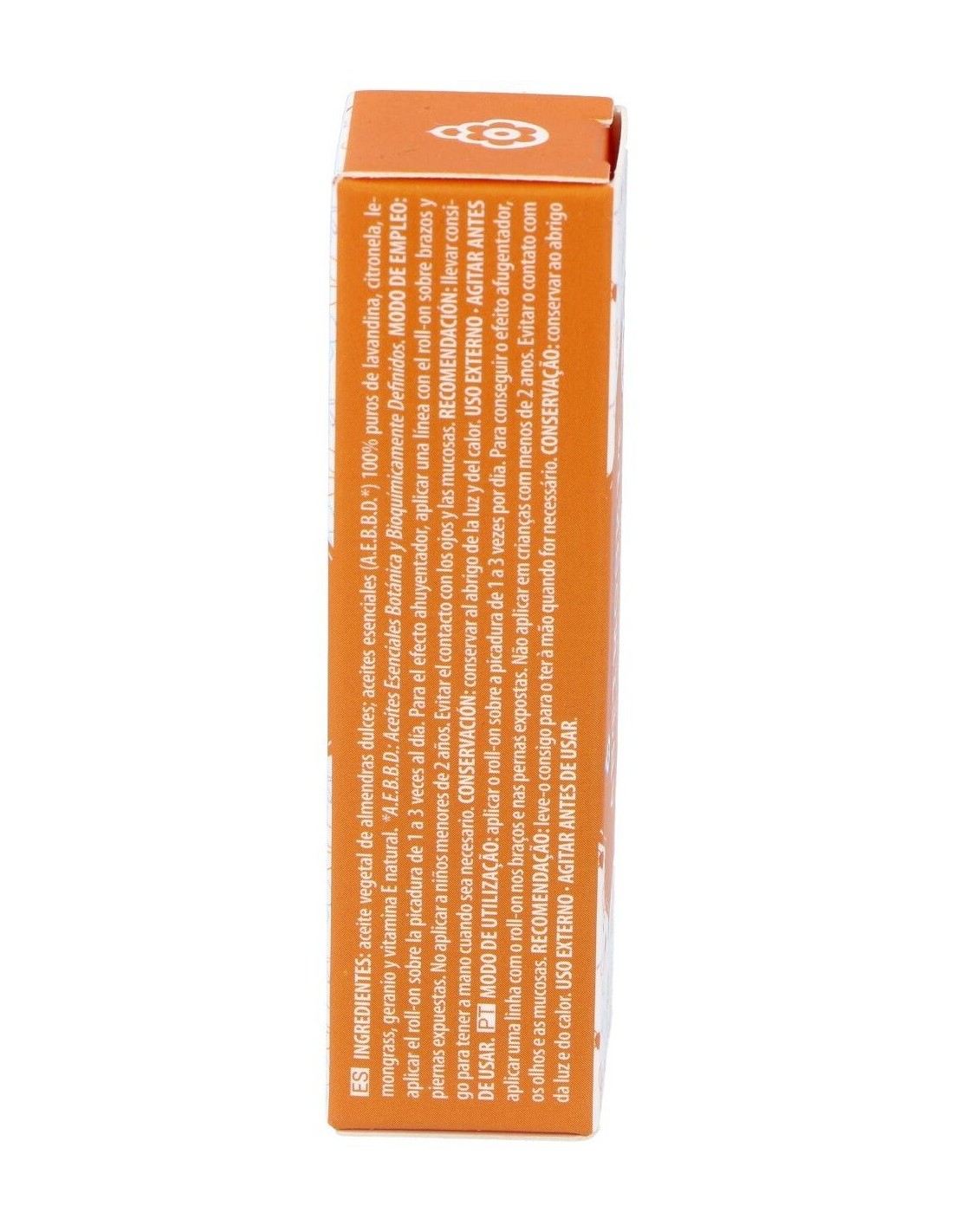 Ingredientes:Aceite vegetal de almendras dulces, aceites esenciales a.e.b.b.d.* 100% puros de: Lavandina, citronela de ceilán, lemon-grass, geranio y vitamina e natural.Modo de empleo:Aplicar el roll-on sobre la picadura, de 1 a 3 veces por día. Para realizar el efecto ahuyentador, aplicar una línea con el roll-on sobre brazos y piernas expuestas.Presentación:Roll-On de 10 ml.