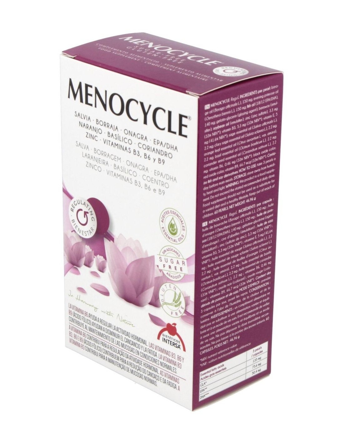 Ingredientes:aceite de borraja (Borago officinalis L.)(150 mg), aceite de onagra (Oenothera biennis L.)(150 mg), aceite de pescado (18/12 EPA/DHA)(140 mg), gelatina-glicerina (agente de recubrimiento); cera de abejas (emulgente); aceite de soja (emulgente); zinc (sulfato de zinc)(3,3 mg), vitamina B3,(5,3 mg), vitamina E (5 mg), aceite esencial de salvia (Salvia officinalis L.)(2,2 mg), aceite esencial de amaro (Salvia sclarea L.)(2,2 mg), aceite esencial de naranjo-hojas (Citrus aurantium L. var. amara)(2,2 mg), aceite esencial de basílico (Ocimum basilicum L.)(2,2 mg), aceite esencial de semillas de coriandro (Coriandrum sativum L.)(2,2 mg), vitamina B6 (0,46 mg), color óxido negro; color óxido rojo; vitamina B9 (66,7 mcg).Modo de empleo:Tomar 3 perlas al día, una antes de cada comida.Presentación:Envase de 60 perlas.Recomendaciones y advertencias:Apto para veganos. No contiene azúcares ni gluten. Contiene derivados de pescado y de soja.