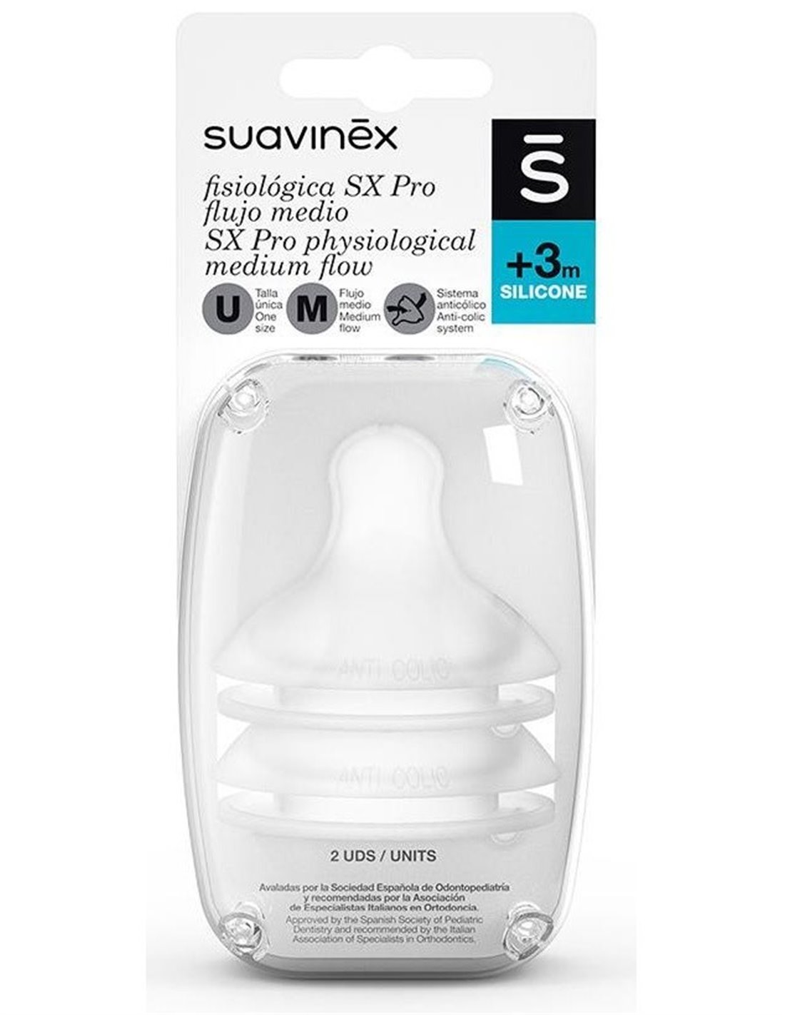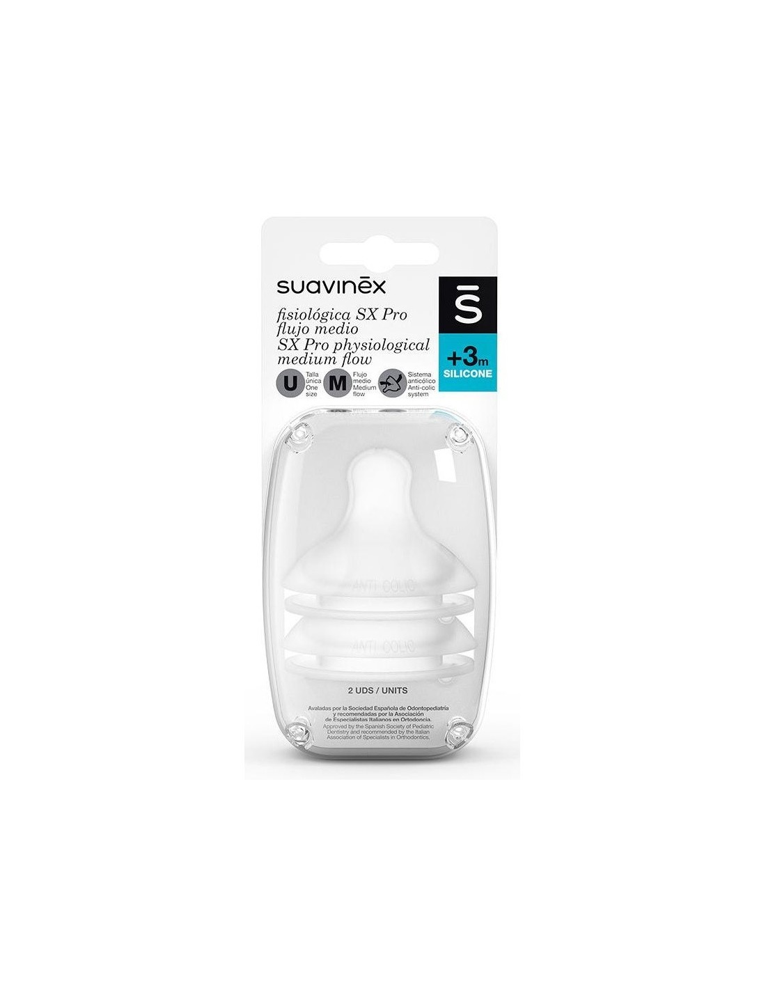 SUAVINEXCreada teniendo en cuenta las particularidades bucodentales del bebé, cuyo maxilar y mandíbula están en pleno desarrollo. Cumpliendo con las recomendaciones profesionales más avanzadas para no interferir en el desarrollo de la cavidad oral. Avalada por la Sociedad Española de Odontopediatría. Silicona fina ultra-suave con acabado arenado, imita en textura y consistencia el pezón materno, consiguiendo: Máxima calidez, un movimiento super flexible, la adaptación máxima a la forma del paladar. Flujo medio (a partir de 3 meses).