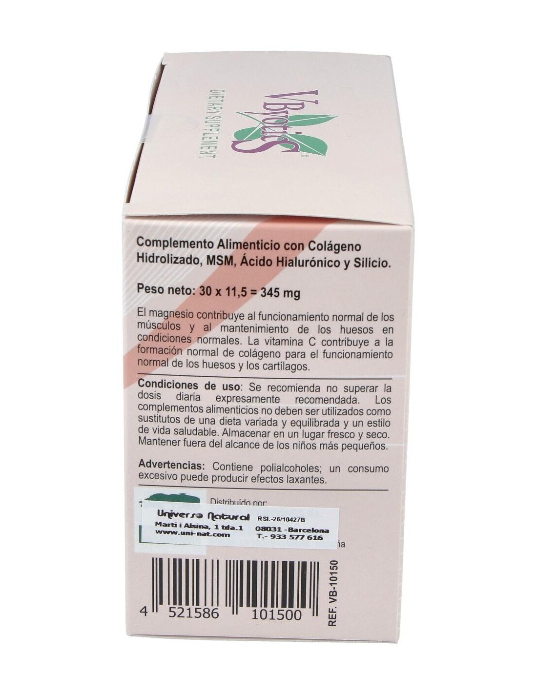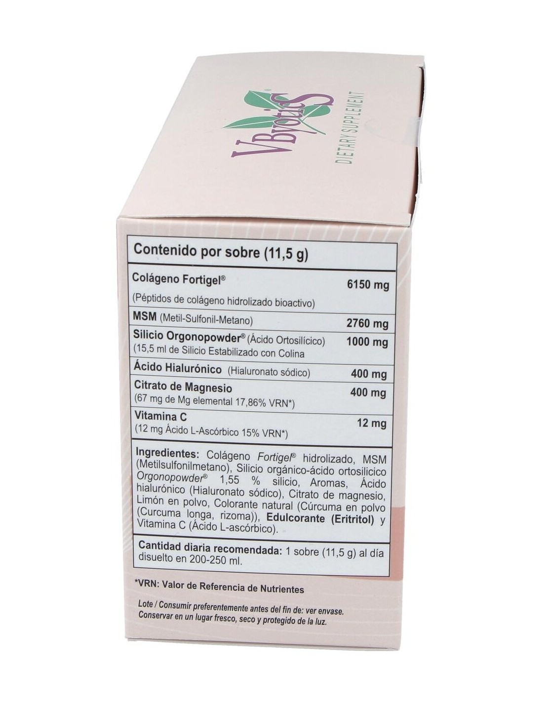 Ingredientes:Colágeno Fortigel hidrolizado, MSM (Metilsulfonilmetano). Silicio orgánico-ácido ortosilicico Orgonopowder® 1,55 % silicio, Aromas, Acido hialurónico (Hialuronato sódico), Citrato de magnesio, Limón en polvo, Colorante natural (Cúrcuma en polvo (Curcuma longa, rizoma)), Edulcorante (Eritritol) y Vitamina C (Ácido L-ascórbico).Modo de empleo:Tomar 1 sobre (11,5 g) al día disuelto en 200-250 ml.Presentación:Envase de 30 sobres.Recomendaciones y advertencias:Puede contener trazas de gluten, leche, huevo, soja, apio, frutos de cáscara, dióxido de azufre, sulfitos, pescado, crustáceos y moluscos.