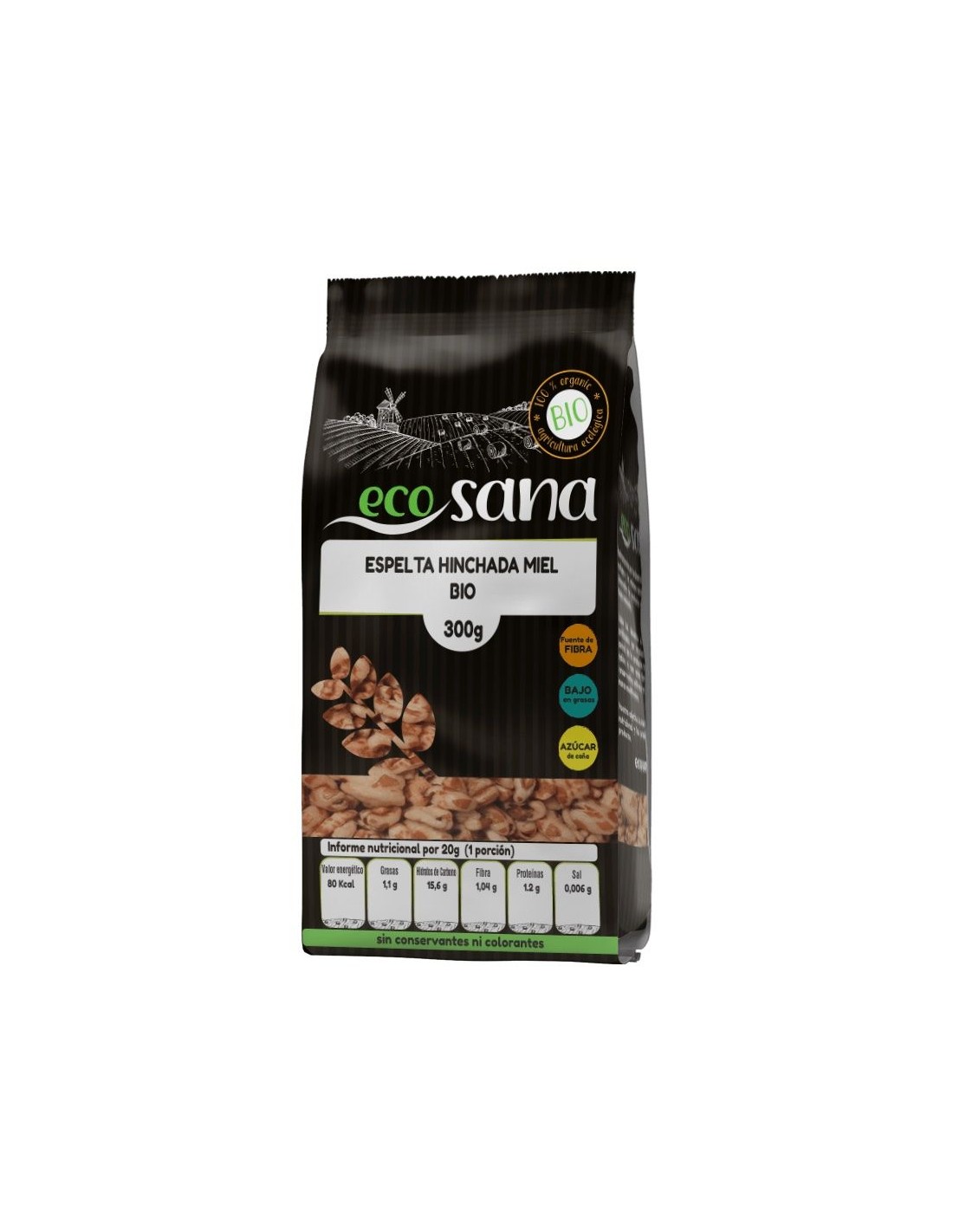 Ingredientes:Espelta hinchada* (53,3%), azúcar de caña*, jarabe de maíz*, miel* (4,1%), aceite de girasol*. (*) Procedente de agricultura ecológica.Valor nutricional por 100 gramos: