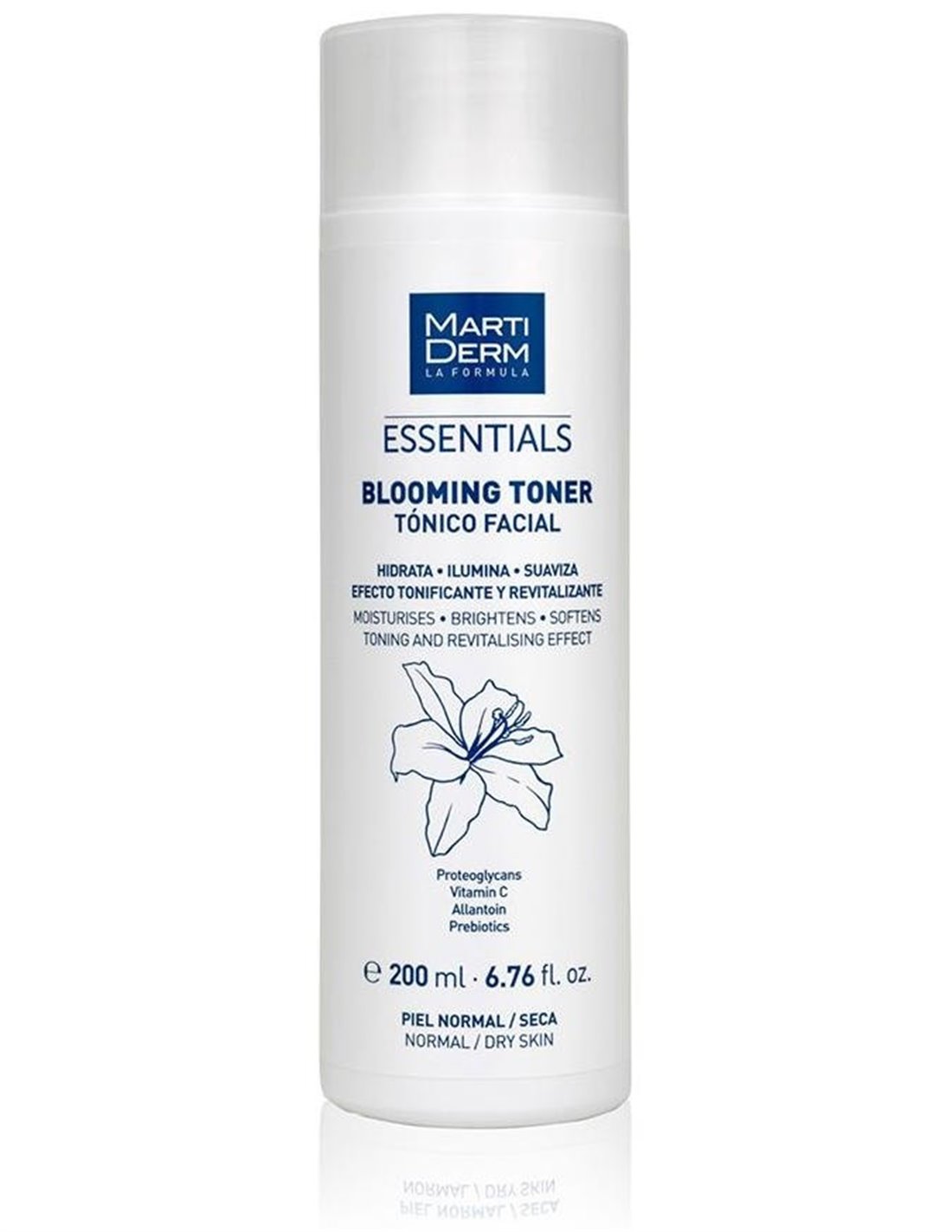 Martiderm Essentials Blooming Toner 200 ml es un tónico facial que facilita la revitalización de la piel. Su fórmula a base de caléndula y extractos de alantoína, contribuye a hidratar y suavizar el cutis, aportando un efecto antioxidante. Además, sus activos prebióticos contribuyen a proteger la piel del rostro de la acción de agentes externos actuando como una barrera protectora y ayudan a reequilibrar la flora cutánea. Este tónico está específicamente indicado para pieles normales o secas.