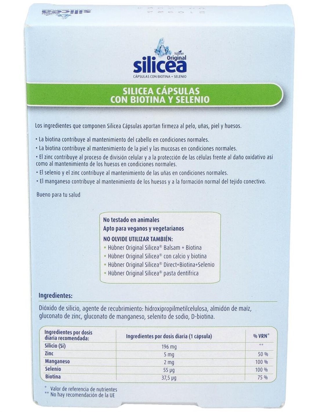 El ácido silícico se encuentra en todas partes de la naturaleza, donde ejerce un papel muy importante aportando firmeza, elasticidad y flexibilidad.El ácido silícico (silicio) es fundamental para una retención suficiente del agua. Ninguna otra sustancia puede retener 300 veces su peso en agua. Un contenido de agua suficiente garantiza que las células reciban los nutrientes suficientes.Silicea Balsam es un producto pensado para aportar al organismo la dosis necesaria de silicio que necesitamos sobre todo cuando por la alimentación no ingerimos la suficiente cantidad o por edad el cuerpo no la asimila con la misma facilidad.Silicea para la pielUna piel cuidada, lisa y radiante forma parte de un aspecto atractivo. Las sustancias vitales son la garantía para disfrutar de una piel bella y juvenil. Existe una gran variedad de cosméticos y complementos alimenticios que contienen estas sustancias, pero no todos son igual de eficaces.Las primeras arrugas evidentes suelen aparecer a principios o mediados de los treinta. Sin embargo, nuestra piel empieza a envejecer mucho antes: a partir de los 20 a 25 años se retiene ya poca humedad y las células se renuevan cada vez más lentamente. Es decir: la capacidad de la piel para regenerarse desciende continuamente. Estos son motivos por los que debemos prestar gran atención al cuidado de nuestra piel ya desde jóvenes, para que a medida que pasa el tiempo la mantengamos en buen estado.Silicea para el cabelloEl requisito fundamental para lograr un cabello brillante y fuerte es una nutrición especialmente adaptada a los cabellos, que contengan todas las vitaminas, minerales y oligoelementos necesarios para su formación. El brillo y el volumen del cabello pueden condicionarse desde el exterior, pero básicamente proceden del interior. Los cabellos, igual que la piel, reciben sustancias básicas a través del sistema circulatorio. En resumen puede decirse que lo que es bueno para nuestra piel, también lo es para el cabello. Silicea para las uñasLas uñas sufren constantes agresiones. Están todo el día expuestas al frío, viento, humedad, productos de limpieza, golpes, etc.. Por eso es muy importante cuidarlas, así no se romperán con facilidad, ni presentaran un aspecto acanalado (con líneas verticales marcadas). Para tener un buen aspecto y que sean resistentes debemos nutrirlas, igual que la piel y el cabello. Tener unas uñas resistentes y con buen aspecto es el objetivo que todo el mundo quiere. Ingredientes por cápsula: