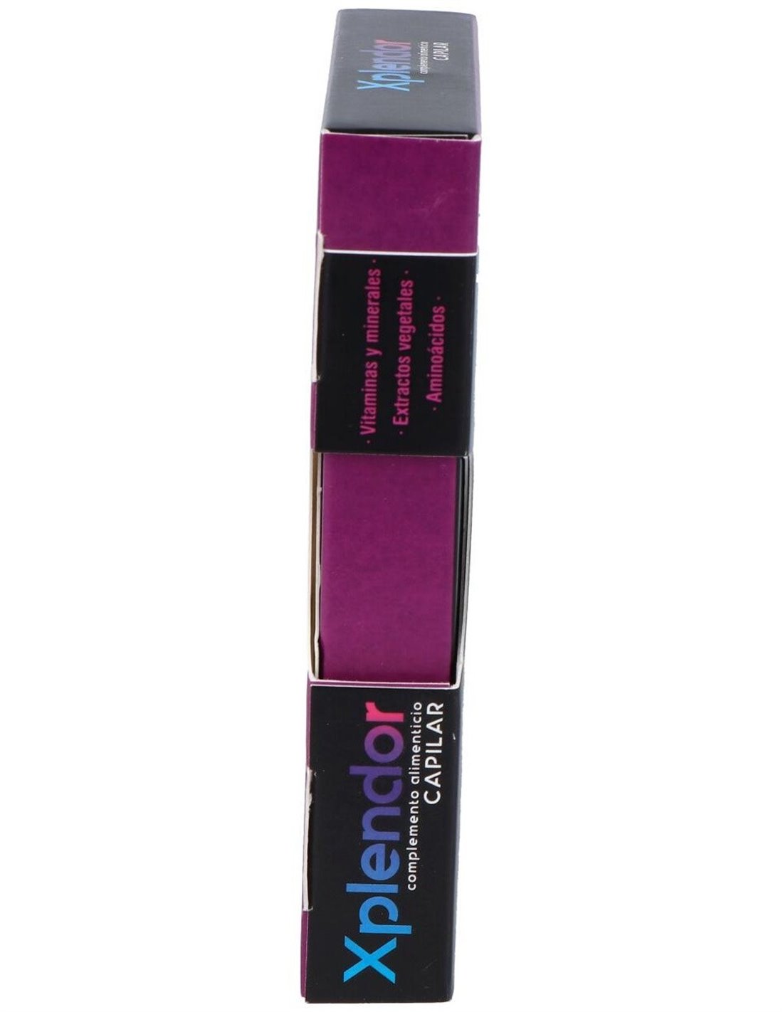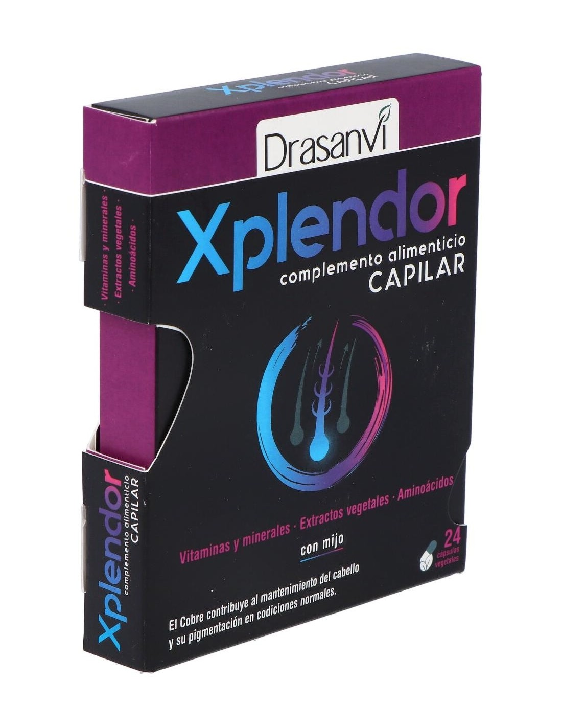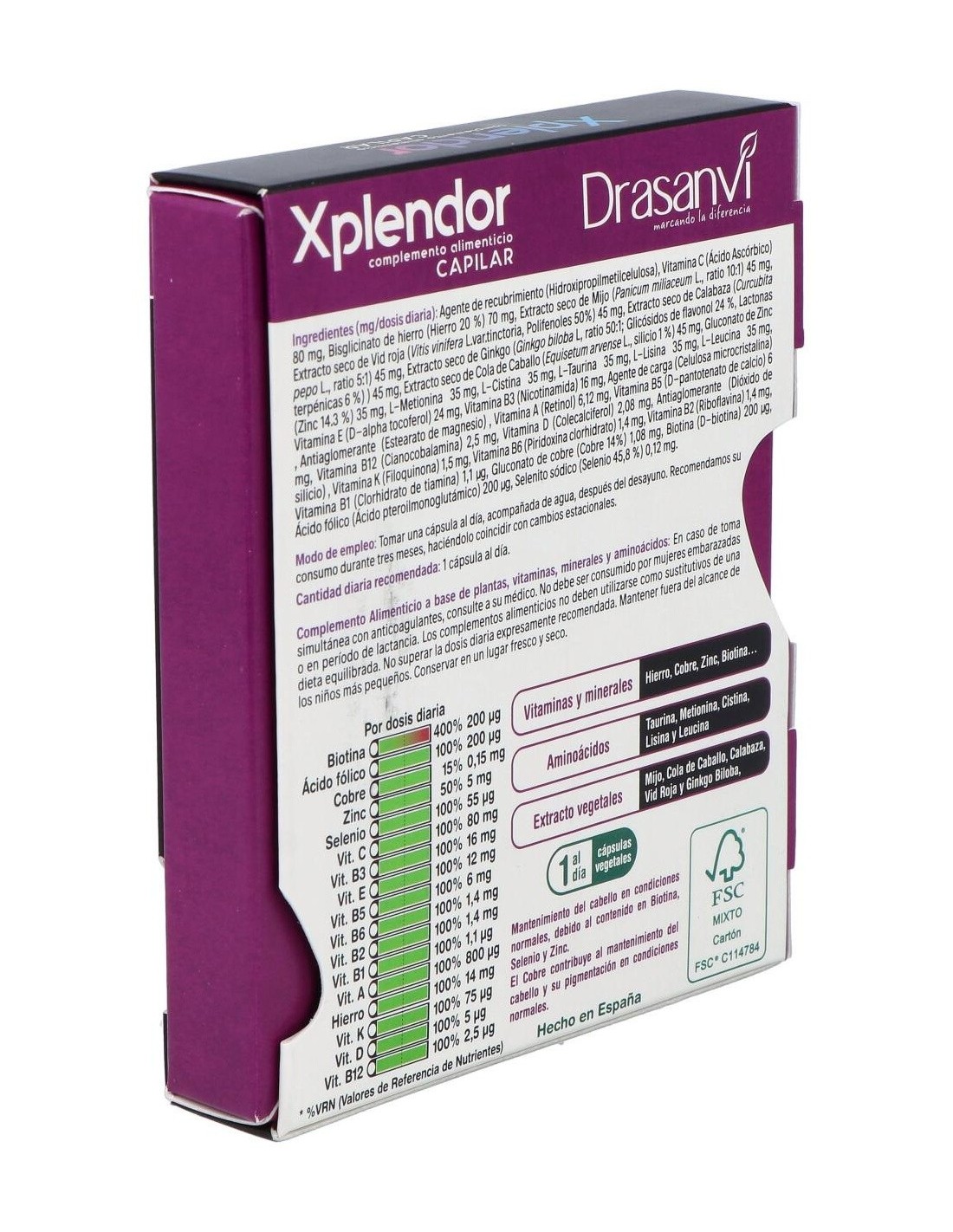 Xplendor aporta 13 vitaminas en cantidad adecuada, cubriendo el 100% de la Cantidad Diaria Recomendada. El cabello es una de las partes del organismo que más rápidamente nota un déficir de vitaminas. Un aporte adecuado contribuye al mantenimiento de la piel en condiciones normales.Xplendor incorpora extractos vegetales con diferentes principios activos: entre estos extractos está el de Mijo. Se trata de un cereal muy rico en nutrientes, proteínas vegetales, ácidos grasos esenciales, fibra y minerales como el fósforo, magnesio, hierro y gran número de macronutrientes. El extracto empleado es en forma de extracto seco, es decir, multiplica por 5 su equivalencia en planta pulverizada.Composición activa por cápsula: