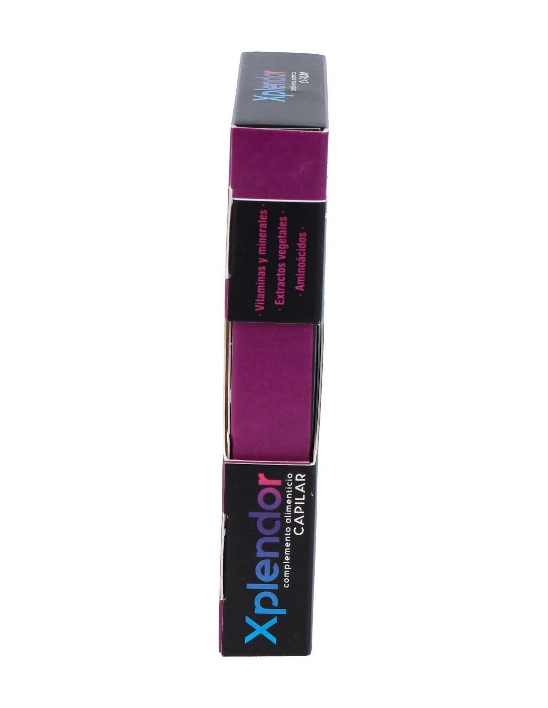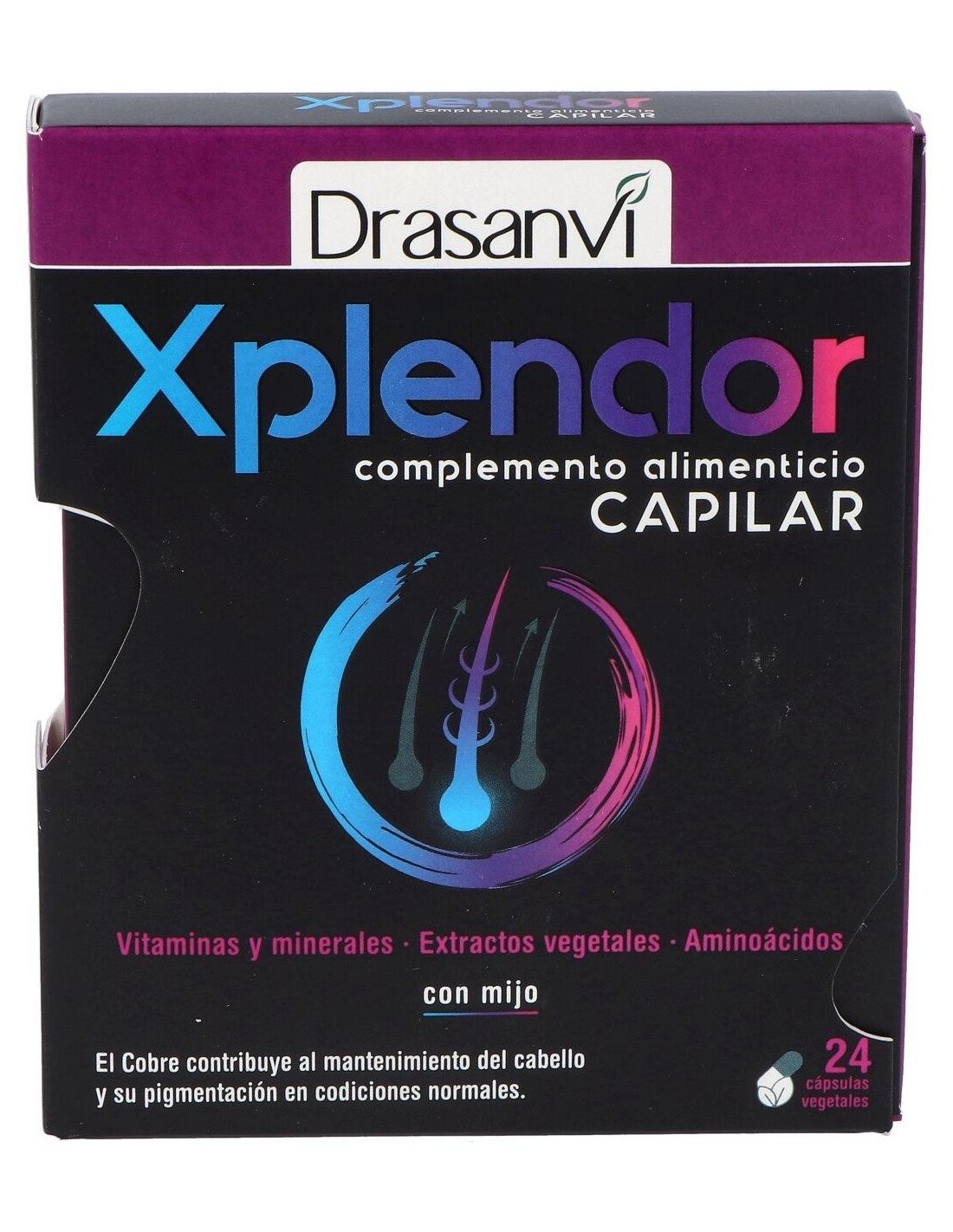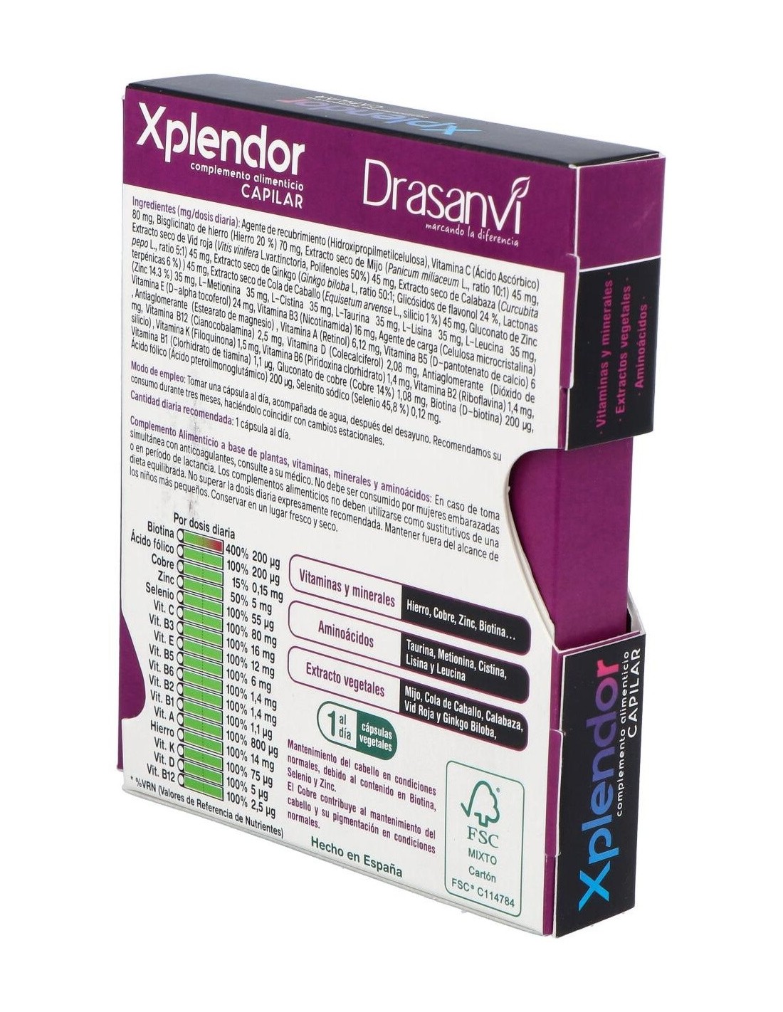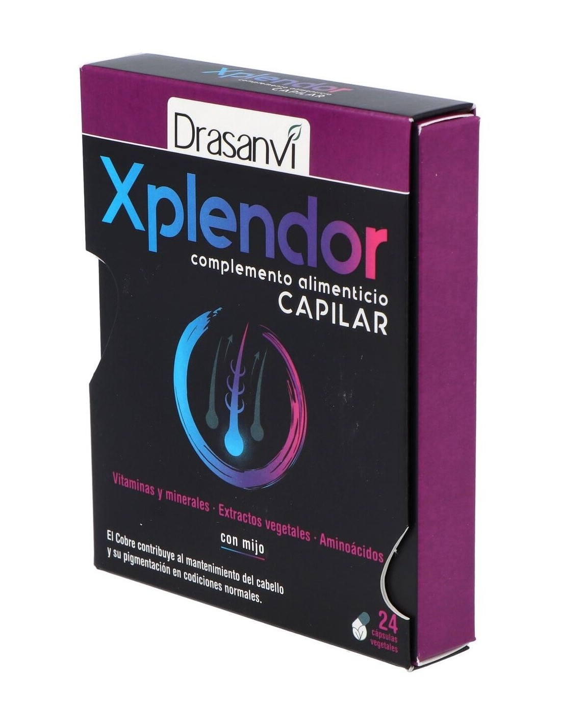 Xplendor aporta 13 vitaminas en cantidad adecuada, cubriendo el 100% de la Cantidad Diaria Recomendada. El cabello es una de las partes del organismo que más rápidamente nota un déficir de vitaminas. Un aporte adecuado contribuye al mantenimiento de la piel en condiciones normales.Xplendor incorpora extractos vegetales con diferentes principios activos: entre estos extractos está el de Mijo. Se trata de un cereal muy rico en nutrientes, proteínas vegetales, ácidos grasos esenciales, fibra y minerales como el fósforo, magnesio, hierro y gran número de macronutrientes. El extracto empleado es en forma de extracto seco, es decir, multiplica por 5 su equivalencia en planta pulverizada.Composición activa por cápsula: