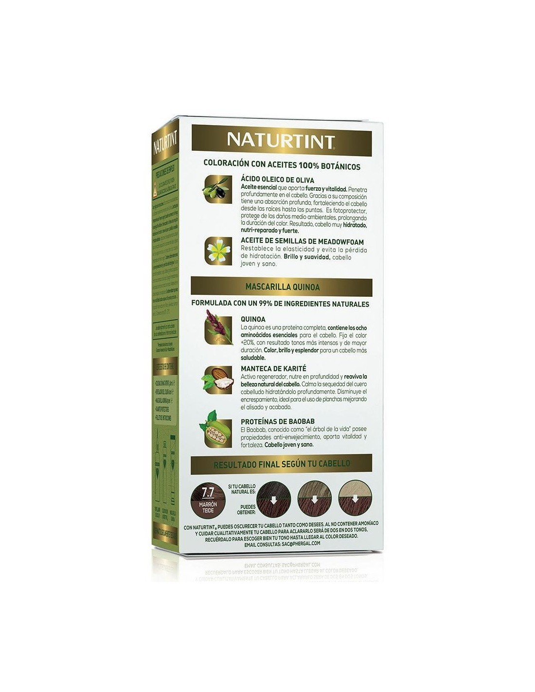 COLORACIÓN NATURTINT 60 ml: PEG-2 OLEAMINE. AQUA (PURIFIED WATER). ALCOHOL DENAT. PEG-4 RAPESEEDAMIDE. PROPANEDIOL. ETHANOLAMINE. OLEIC ACID. HYDROLYZED OAT PROTEIN. HYDROLYZED CORN PROTEIN. HYDROLYZED SOY PROTEIN. HYDROLYZED WHEAT PROTEIN. LIMNANTHES ALBA SEED OIL. TETRASODIUM GLUTAMATE DIACETATE. SODIUM METABISULFITE. SODIUM ERYTHORBATE. p-PHENYLENEDIAMINE. 2-METHYLRESORCINOL. p-AMINOPHENOL. 4-CHLORORESORCINOL. 2-AMINO -4-HYDROXYETHYLAMINOANISOLE SULFATE. N,N-BIS (2-HYDROXYETHYL)-p-PHENYLENEDIAMINE SULFATE. 4-AMINO-2 HYDROXYTOLUENE. m-AMINOPHENOL. OCTADECYL DI-T-BUTYL-4 HYDROXYHYDROCINNAMATE.