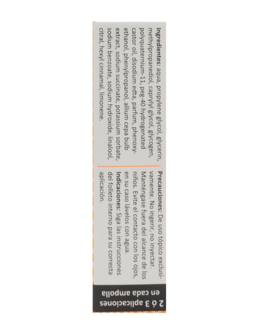 - Tratamiento de mantenimiento:Aplicar 1/2 ampolla como mínimo una vez a la semana de manera continuada.Ingredientes (INCI):Aqua, propylene glycol, glycerin, methylpropanediol, caprylyl glycol, glycogen, polyquaternium-11, peg-40 hydrogenated castor oil, disodium edta, parfum, phenoxyethanol, phenylpropanol, allium cepa bulb extract, sodium succinate, potassium sorbate, sodium benzoate, sodium hydroxide, linalool, citral, hexyl cinnamal, limonene. Modo de empleo: - En cabellos secos: