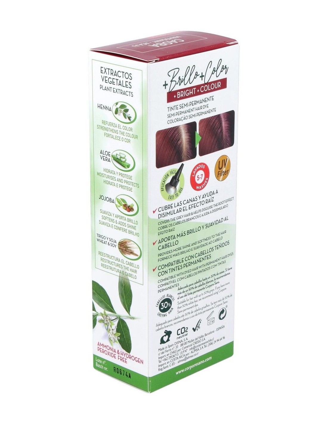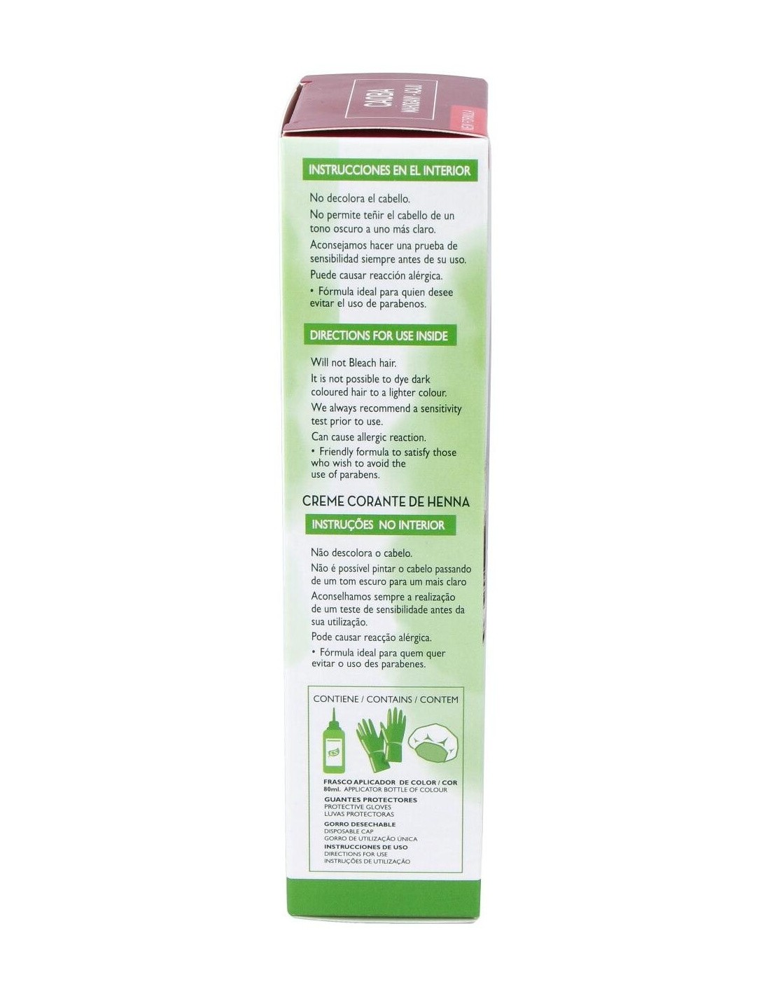 La crema colorante de Henna es un producto de coloración preparado para su uso, sin necesidad de mezclas. Concebido para aportar reflejos Caoba al cabello, camuflar la raíz y cubre las canas, proporcionando brillo, color y suavidad intensos sin dañar el cabello.Su fórmula contiene Henna para reforzar el color, Aloe Vera para hidratar y proteger el cabello, Jojoba para suavizar y aportar brillo y aminoácidos de Trigo y Soja para reestructurar intensamente el cabello. También contiene filtro UV para proteger el color de las radiaciones solares. Es compatible con cabellos teñidos con tintes permanentes.No contiene amoníaco ni agua oxigenada por lo que no aclara el tono del cabello ni decolora. Su aplicación es fácil, cómoda y está lista en de 30 a 40 minutos. Reaviva el color natural del cabello y proporciona intensos reflejos que desaparecen progresivamente tras varios lavados. Es un producto adecuado para aquellas personas en busca de una coloración capilar libre de parabenos, amoníaco ni agua oxigenada.Beneficios: