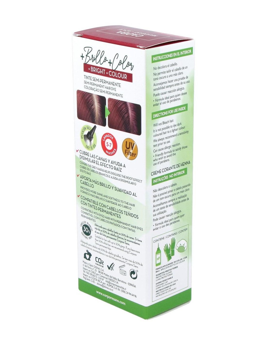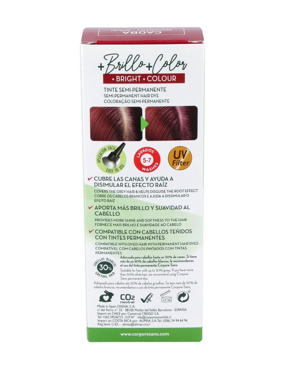 El efecto dura de 5 a 7 lavados.Se pueden mezclar distintos tonos aunque el resultado final dependerá del tipo de cabello en el que se aplica.La cana queda coloreada en un tono un poco más claro que el resto del cabello. Presentación:Envase de 80 ml.
