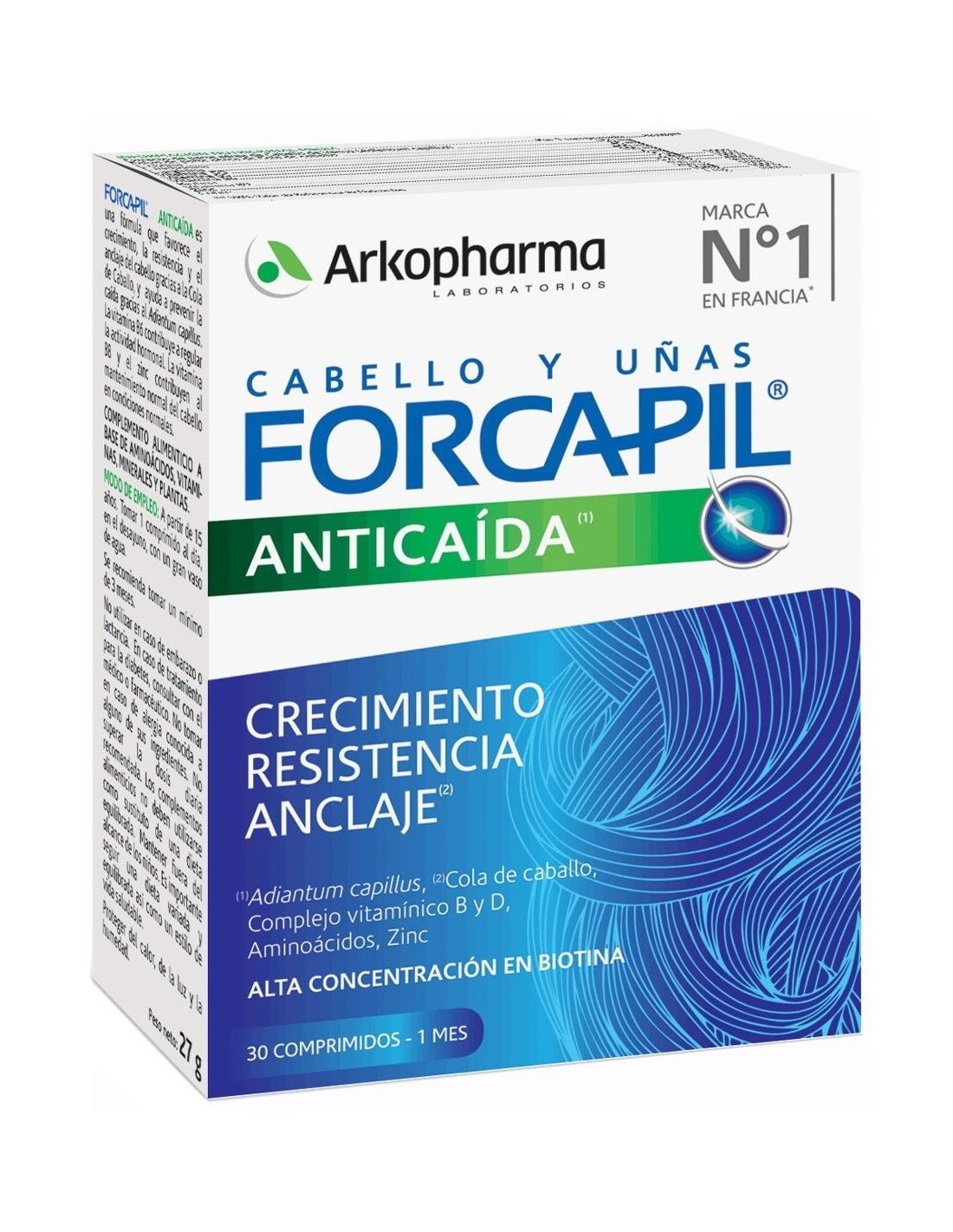 Arkopharma Forcapil Anticaída 30comp es un complemento alimenticio que contribuye a aportar vitalidad y fuerza al cabello. Formulado a base de 3 aminoácidos de origen 100% vegetal, dos plantas medicinales (Adiantum capillus y Cola de Caballo), vitaminas, minerales y alta concentración en biotina.