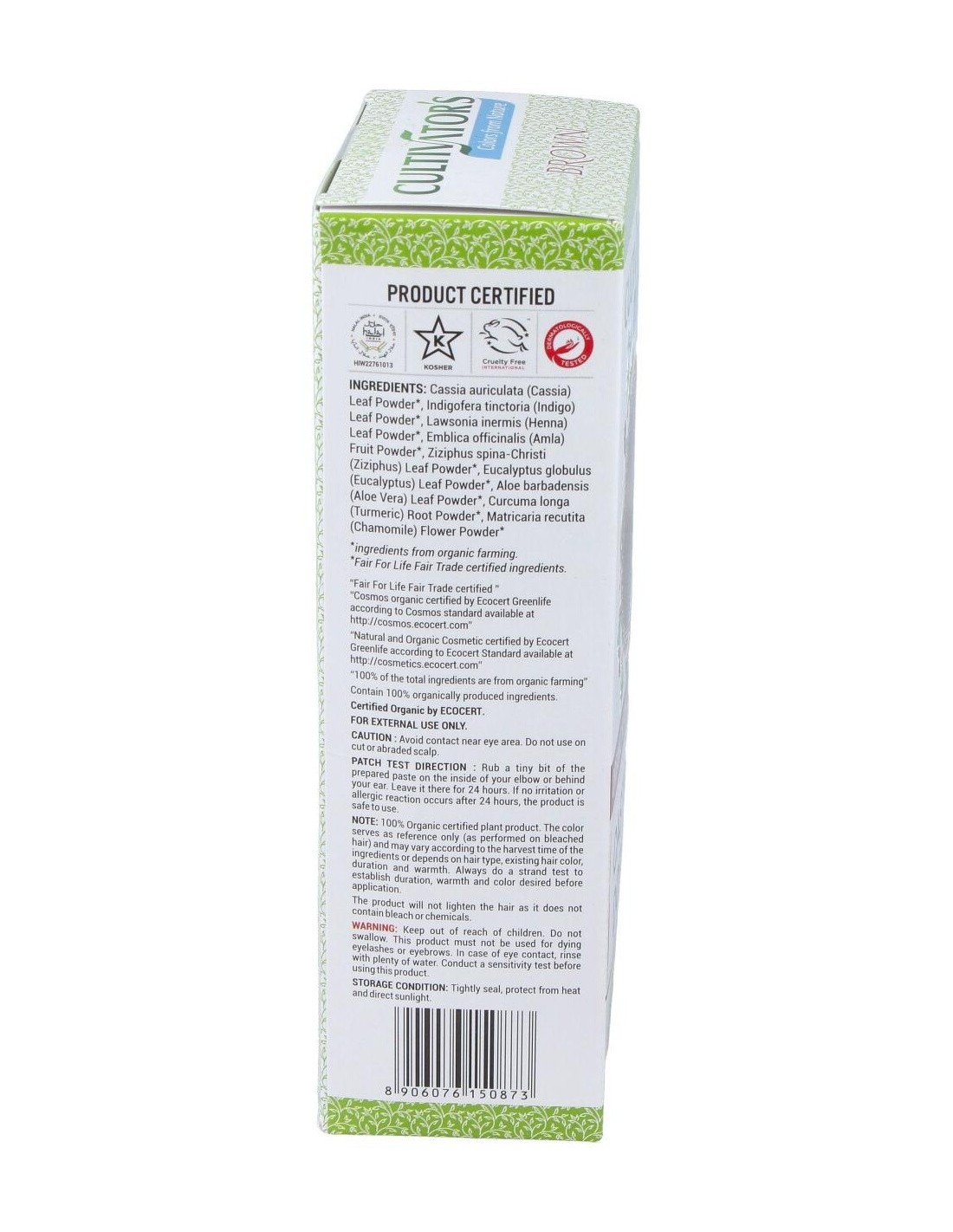 Cassia auriculata (Cassia)*, Indigofera tinctoria (Indigo)*, Lawsonia inermis (Henna)*, Emblica officinalis (Amla)*, Ziziphus spina-Christi (Ziziphus)*, Eucalyptus globulus (Eucalyptus)*, Aloe barbadensis (Aloe Vera)*, Curcuma longa (Turmeric)*, Matricaria recutita (Chamomile)*