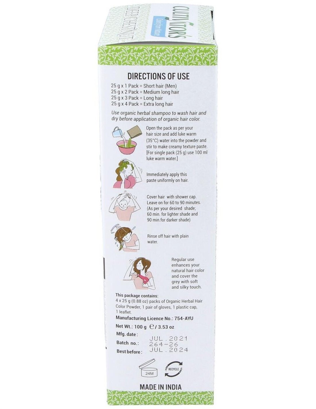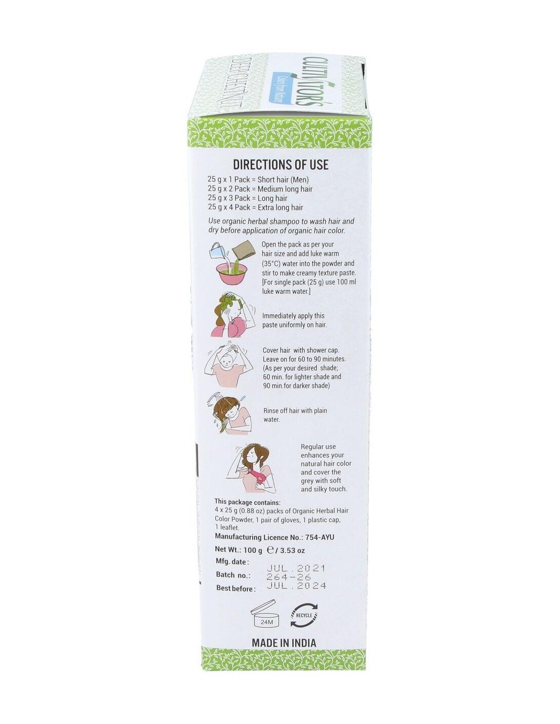 Lavar el cabello con un champú orgánico y secar antes de aplicar el tinte ecológico. Abrir el sobre o los sobres a utilizar según largo del pelo y volcar el contenido en un bol, agregar 100 ml de agua tibia (35ºC) por cada sobre. Mezclar hasta obtener una pasta homogénea. Aplicar de inmediato la pasta a tu cabello de manera uniforme. Cubrir todo el cabello con el gorro de plástico y dejar actuar el producto de 60 a 90 min según intensidad de color deseada (60 min para obtener un tono más claro y 90 min para la máxima intensidad de cada color). Aclarar muy bien el cabello con agua limpia.