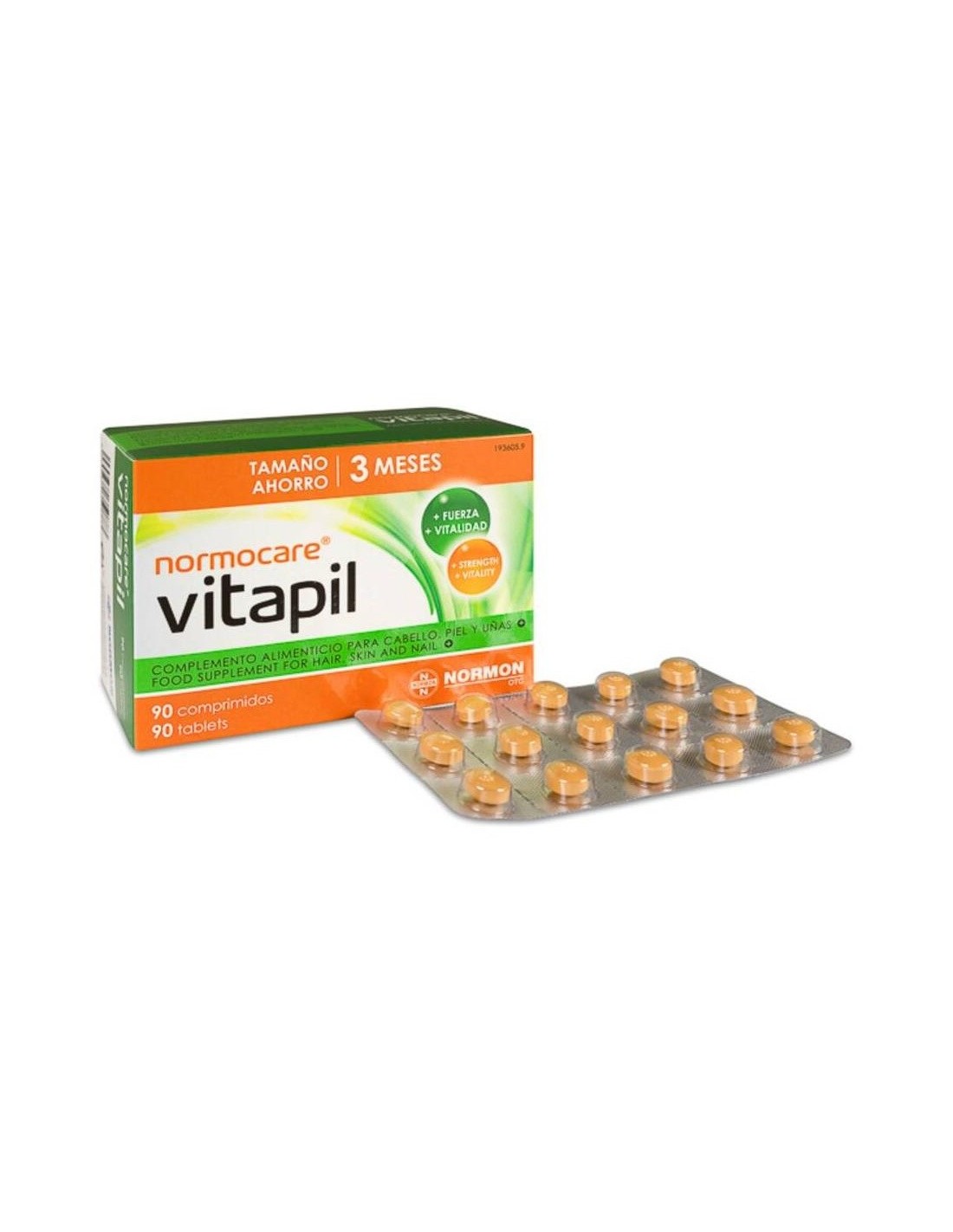 Estabilizante: E460i; ácido L-ascórbico (80mg de vitamina C); edulcorante E420i; aminoácido: 50mg de L-cistina; 50mg de extracto de mijo (Panicum Miliaceum L., fruto) (0.25mg de silicio); 50mg de extracto de bambú (Bambusa vulgaris Schrad., tallos y brotes)(35mg de silicio); 50mg de aceite de borraja (Borago officinalis L., semilla) (4mg de ácido gamma linolénico); mineral: sulfato ferroso (14mg de hierro); acetato de DL-a-tocoferilo (12mg de vitamina E ); estabilizante: E463; mineral: sulfato de zinc (10mg de zinc); nicotinamida (16mg de vitamina B3); 10mg de ácido para-aminobenzoico (PABA); D-pantotenato cálcico (6mg de vitamina B5 ); antiaglomerante: E551; acetato de retinilo (800µg de vitamina A); agente de carga: E1521; estabilizante: E470b; mineral: sulfato cúprico (1mg de cobre); riboflavina (1,4mg de vitamina B2 ); piridoxina clorhidrato (1.4mg de vitamina B6 ); clorhidrato de tiamina (1.1mg de vitamina B1 ); ácido pteroilmonoglutámico (200µg de ácido fólico); mineral: molibdato sódico (50µg de molibdeno); mineral: selenito sódico (50µg de selenio); D-biotina (50µg de biotina); cianocobalamina (2.5µg de vitamina B12); Cubierta: estabilizantes: E464 y E460i; agente de recubrimiento: E1521; antiaglomerante: E570; colorantes: E171 y E172.