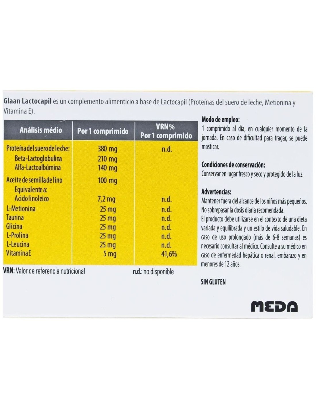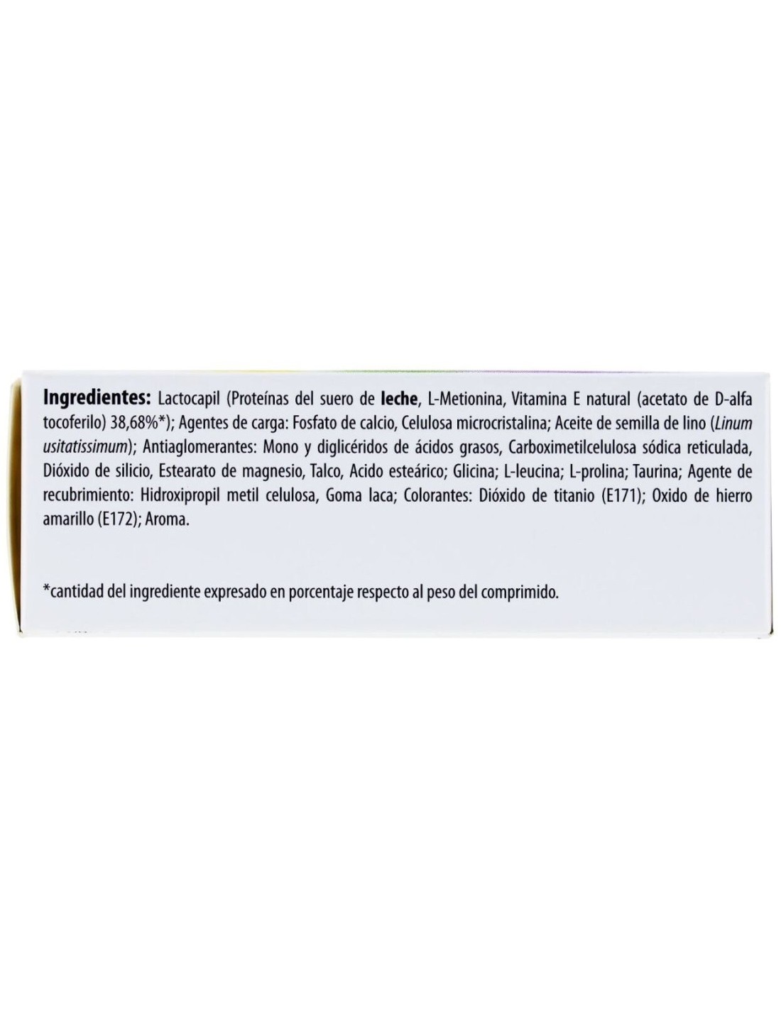 LACTOCAPIL (PROTEÍNAS DEL SUERO DE LECHE; METIONINA; ACETATO DE D-ALPHA TOCOFERILO*); MALTODEXTRINA; ANTIAGLOMERANTES (CELULOSA MICROCRISTALINA, CARBOXIMETIL CELULOSA SÓDICA, ÁCIDO ESTEÁRICO, DIÓXIDO DE SILICIO, TALCO, ESTEARATO DE MAGNESIO); ACEITE DE SEMILLA DE LINO (LINUM USITATISSIMUM); L-GLICINA; L-LEUCINA; L-PROLINA; L-TAURINA; AGENTES DE RECUBRIMIENTO (HIDROXIPROPIL METIL CELULOSA, ETIL CELULOSA); COLORANTES (DIÓXIDO DE TITANIO, ÓXIDO DE HIERRO); AROMA DE CARAMELO.* PROCEDENTE DE LA SOJA.
