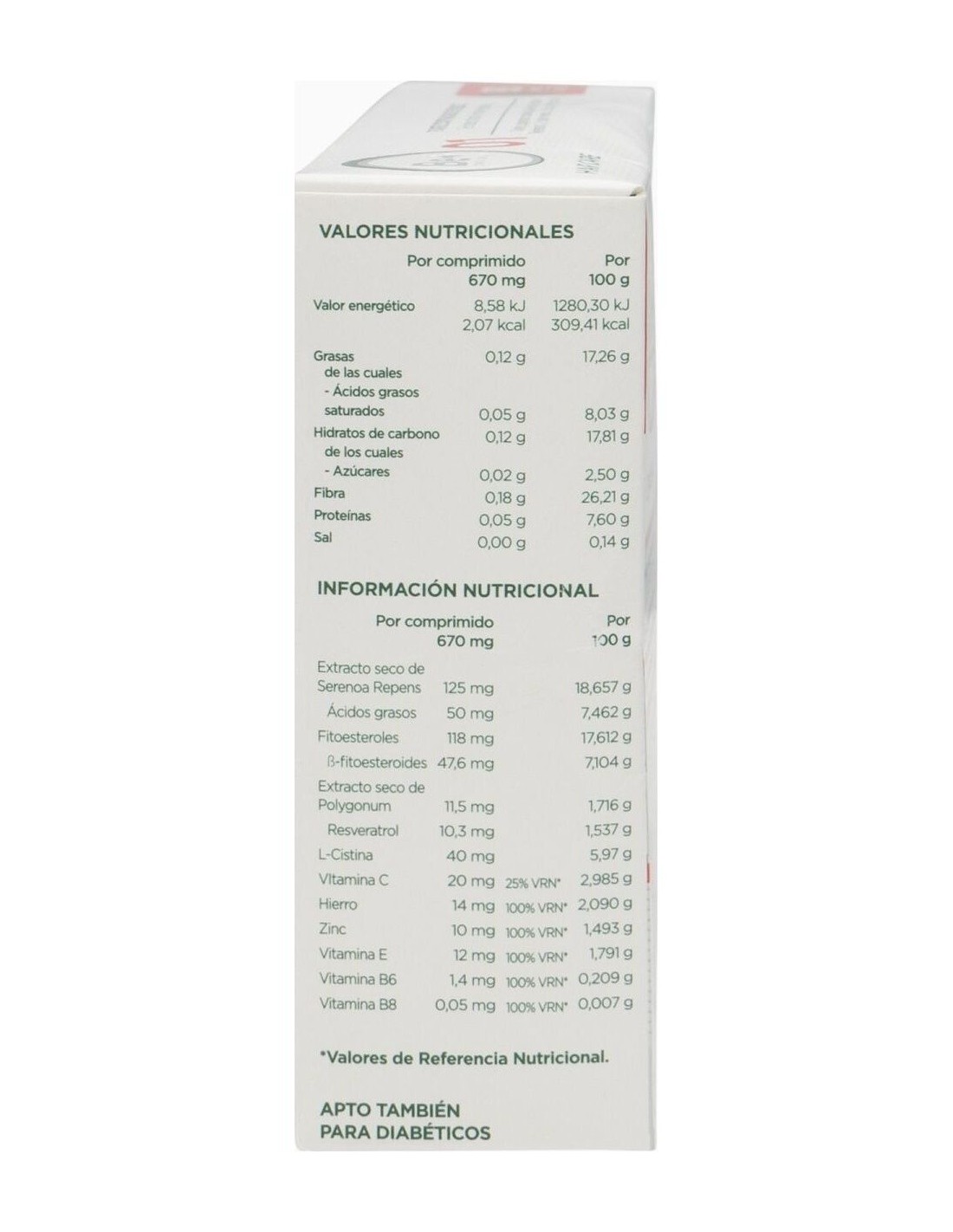 Formulación con elevada concentración de Serenoa Repens junto a Fitoesteroles y Resveratrol y 4 vitaminas junto al Hierro, Zinc, L-Cistina, recomendado para la caída del cabello en situación de antecedentes familiares y menopausia y caída en la zona superior de la cabeza. La biotina contribuye a mantener el cabello en condiciones normales. Las vitamina C y E tiene propiedades antioxidantes. Apto para diabéticos.