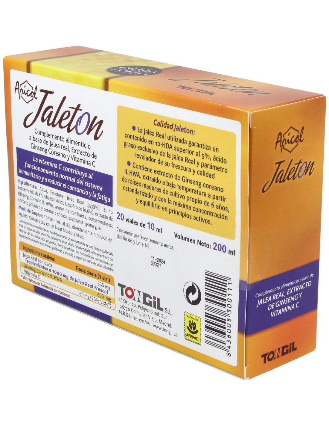 El Apicol Jaleton J.Real Ginseng 20Amp de Tongil está elaborado con ingredientes seleccionados para mantener la calidad y estabilidad del extracto. Su diseño en ampollas individuales facilita su transporte y uso en diferentes momentos del día.