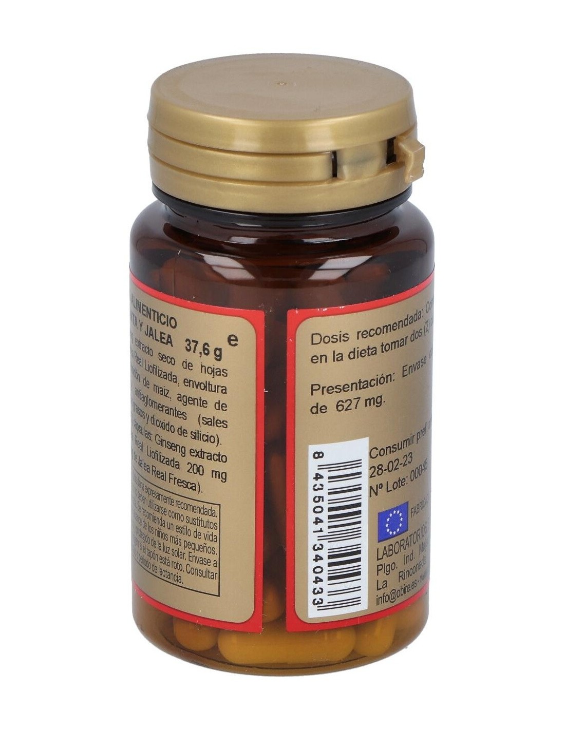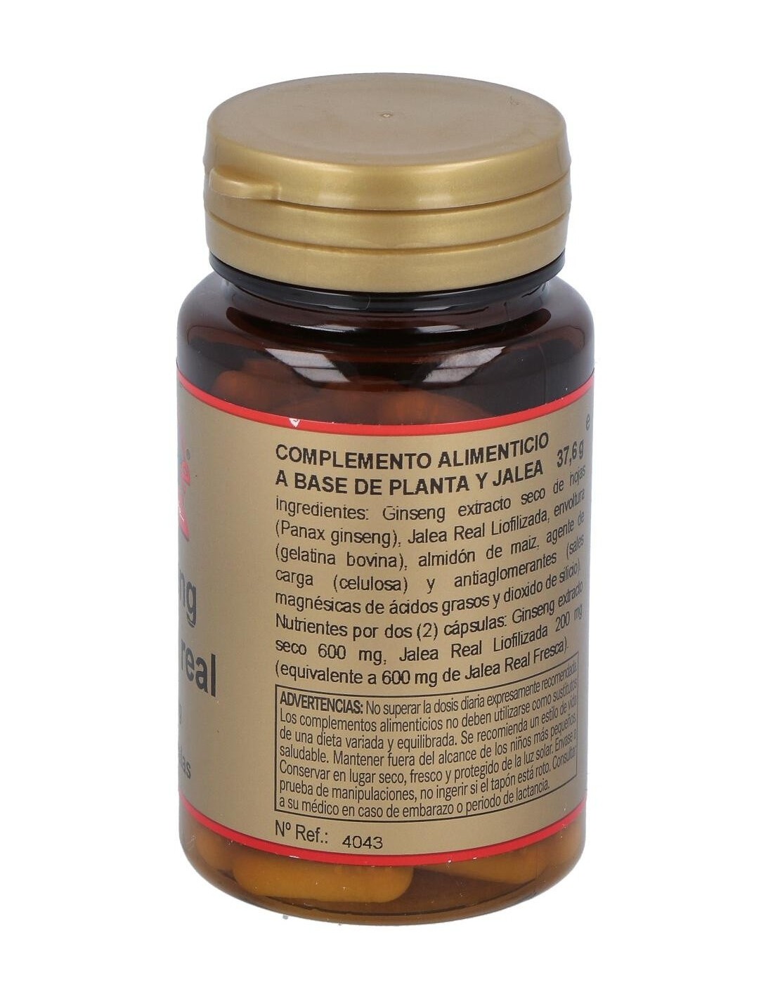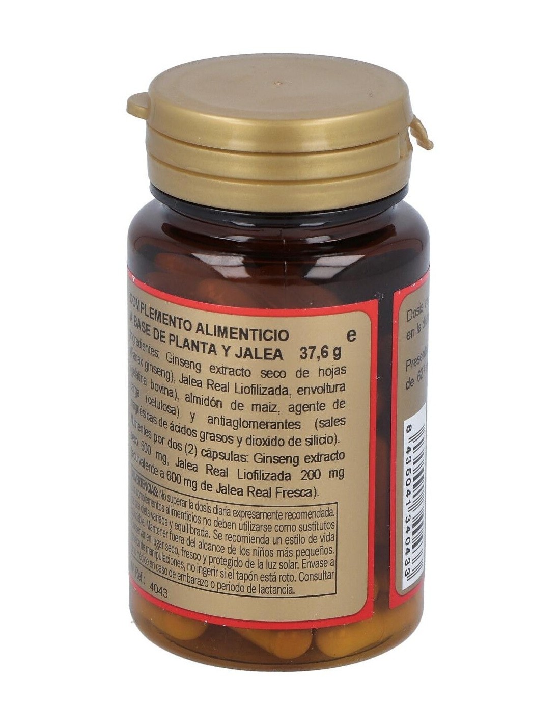 Composición por 1 cápsula: ginseng (300mg), jalea real liofilizada (100mg equivalentes a 300mg de jalea real fresca) y excipientes (estearato magnésico vegetal y gelatina).