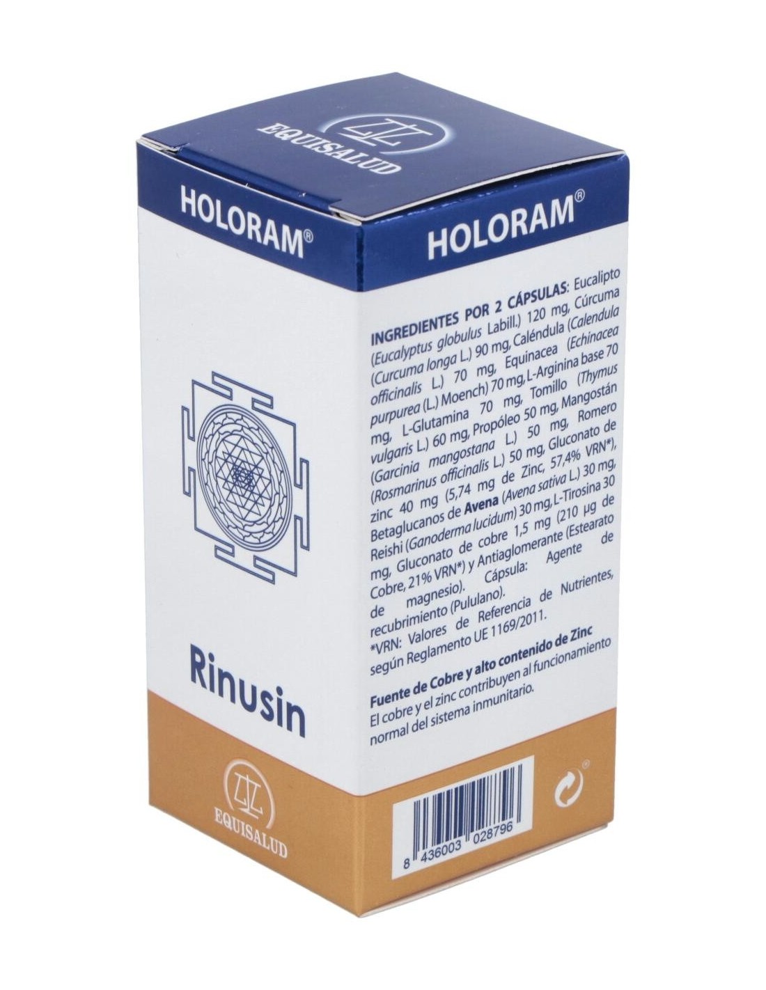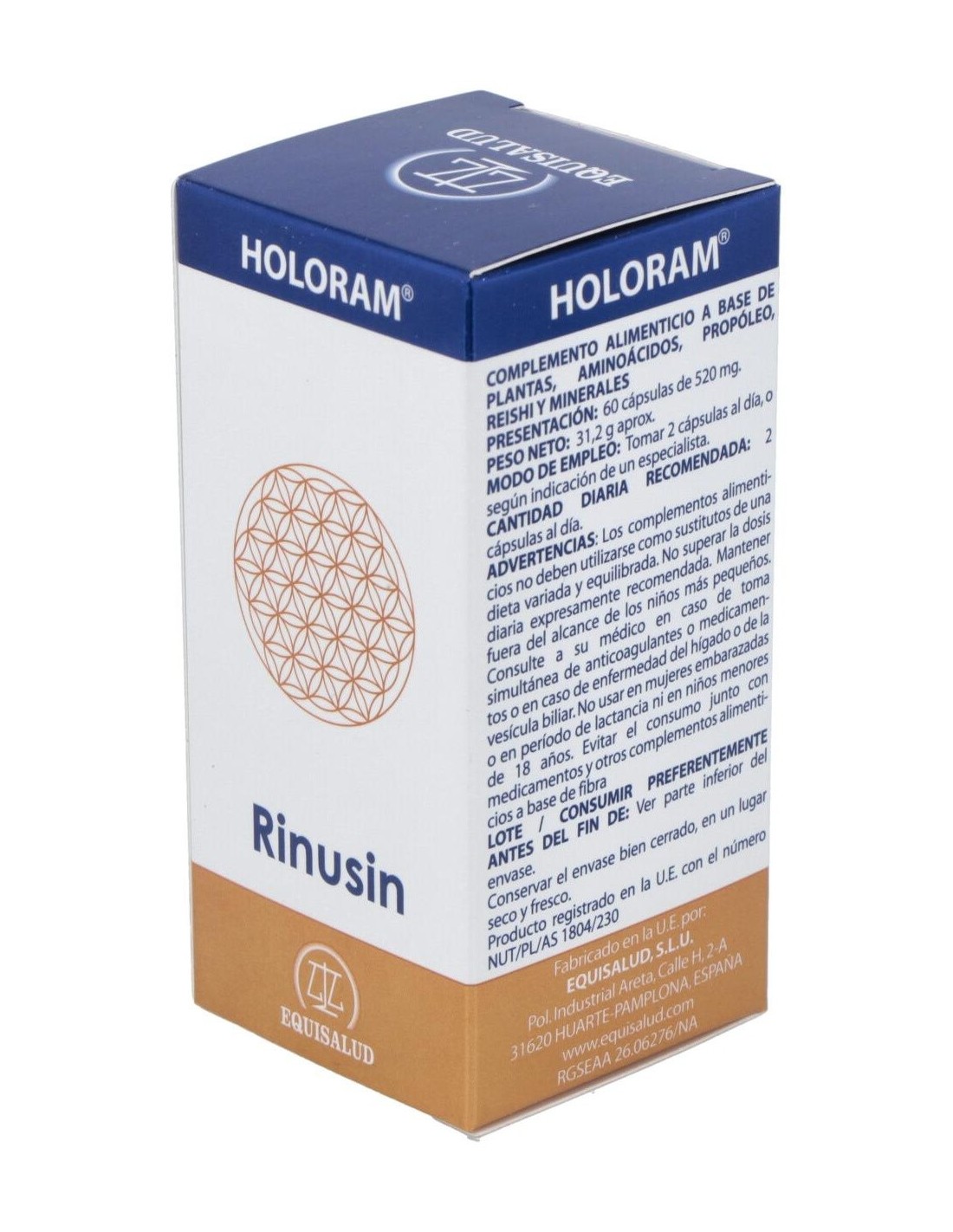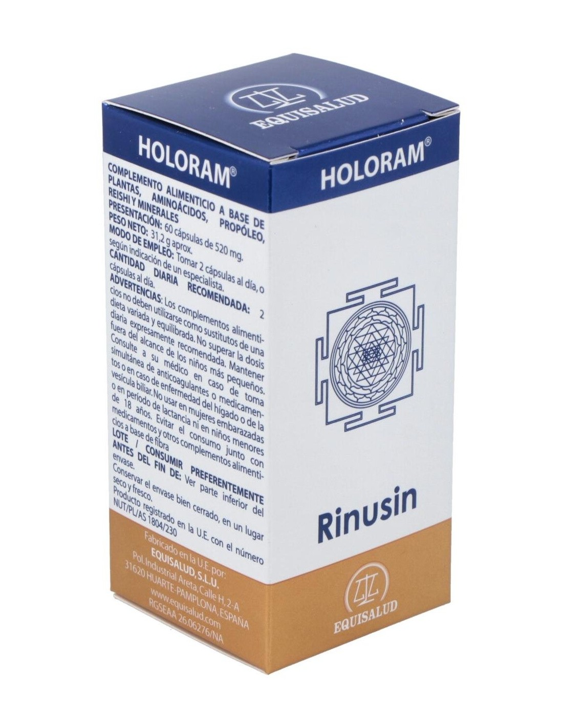 El HoloRam Rinusin es un activador de los procesos naturales de defensa y conservación de la integridad y salud de los tejidos de los senos paranasales. El HoloRam Rinusin es un biorregulador cuyos componentes han sido cuidadosamente seleccionados y mezclados en las dosis precisas para ser activados biofísicamente. Se logra así una sinergia que potencia y activa la información reguladora de la integridad, la microperfusión y la inmunidad de las mucosas paranasales. El HoloRam Rinusin es además un regulador del equilibrio neurovegetativo y microcirculatorio del delicado epitelio de los senos paranasales, tan afectado hoy por la polución ambiental, incluyendo la contaminación electromagnética. Composición por cápsula:
