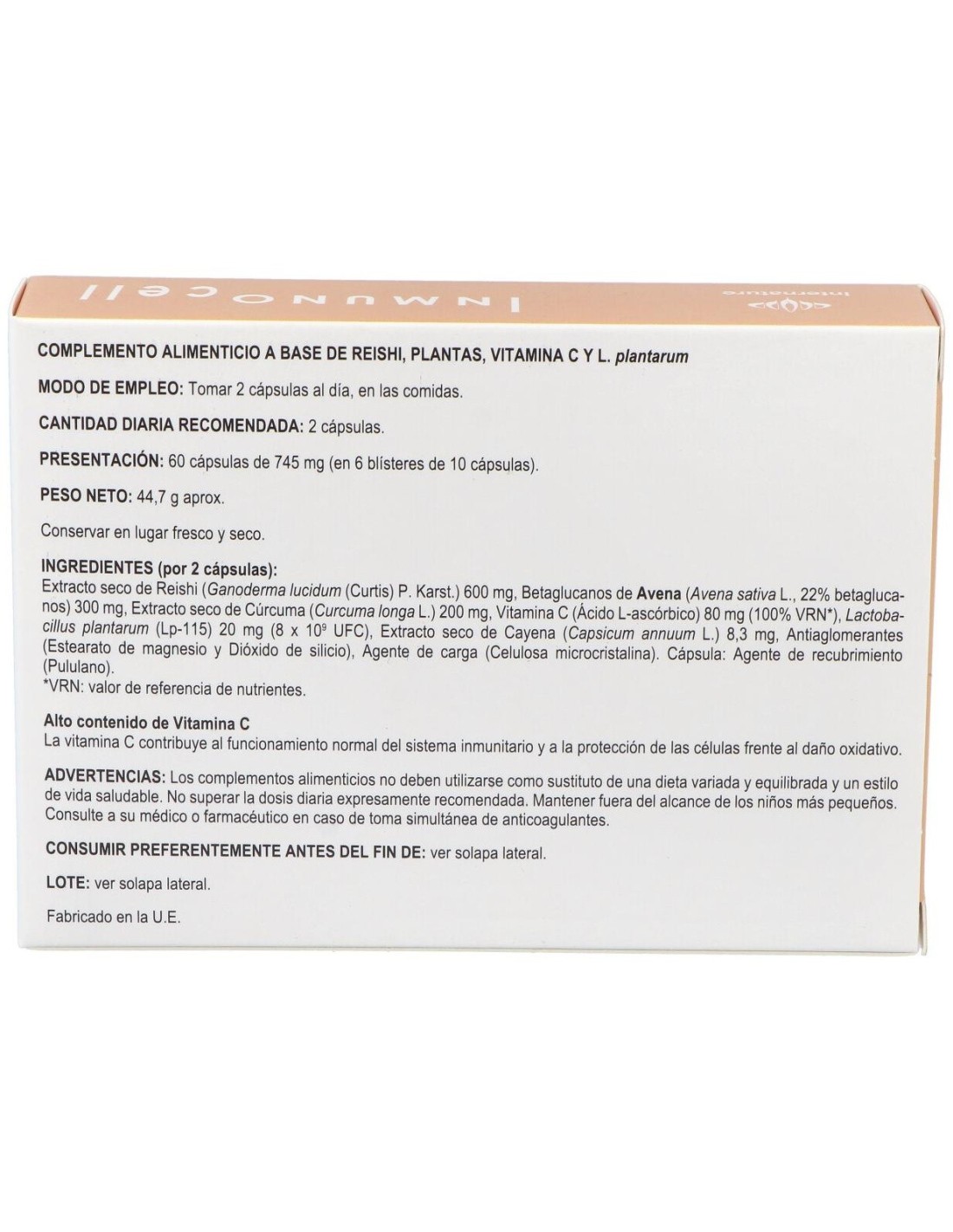 Inmunocell, es un suplemento natural que contiene extracto seco de cúrcuma, con cayena como transportador a través de las barreras biológicas, para su mayor absorción. Además de la cúrcuma, Inmunocell contiene extracto seco de reishi, (rico en glucanos), de reconocida acción antioxidante, inmunoestimulante y antiinflamatoria, junto con beta 1,3 glucanos, fibra soluble, de acción inmunoreguladora en el tramo intestinal, y antiinflamatoria.Ingredientes activos por cápsula:
