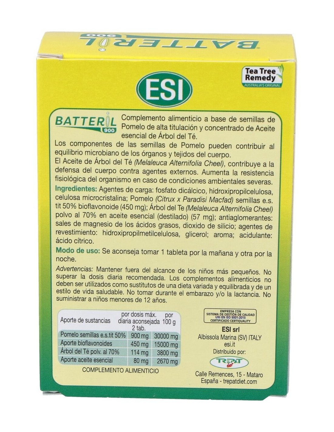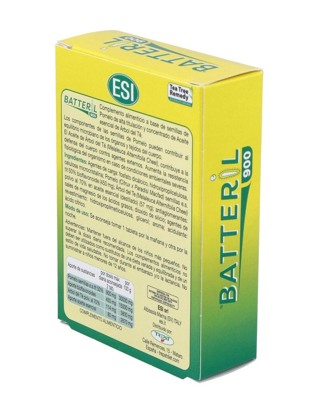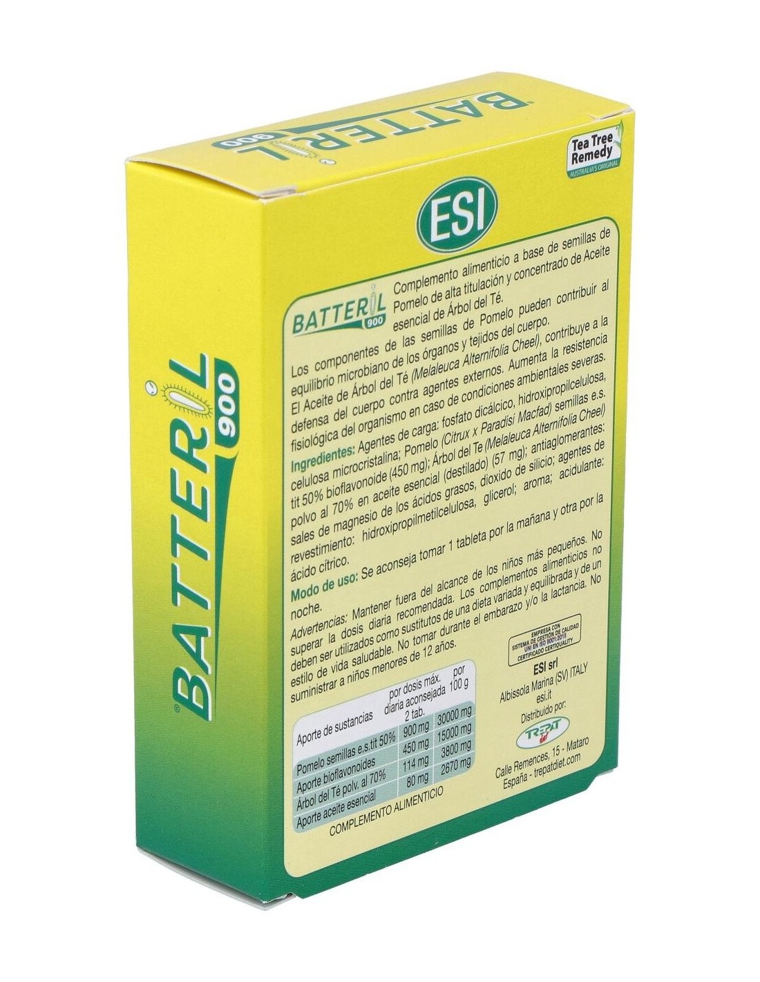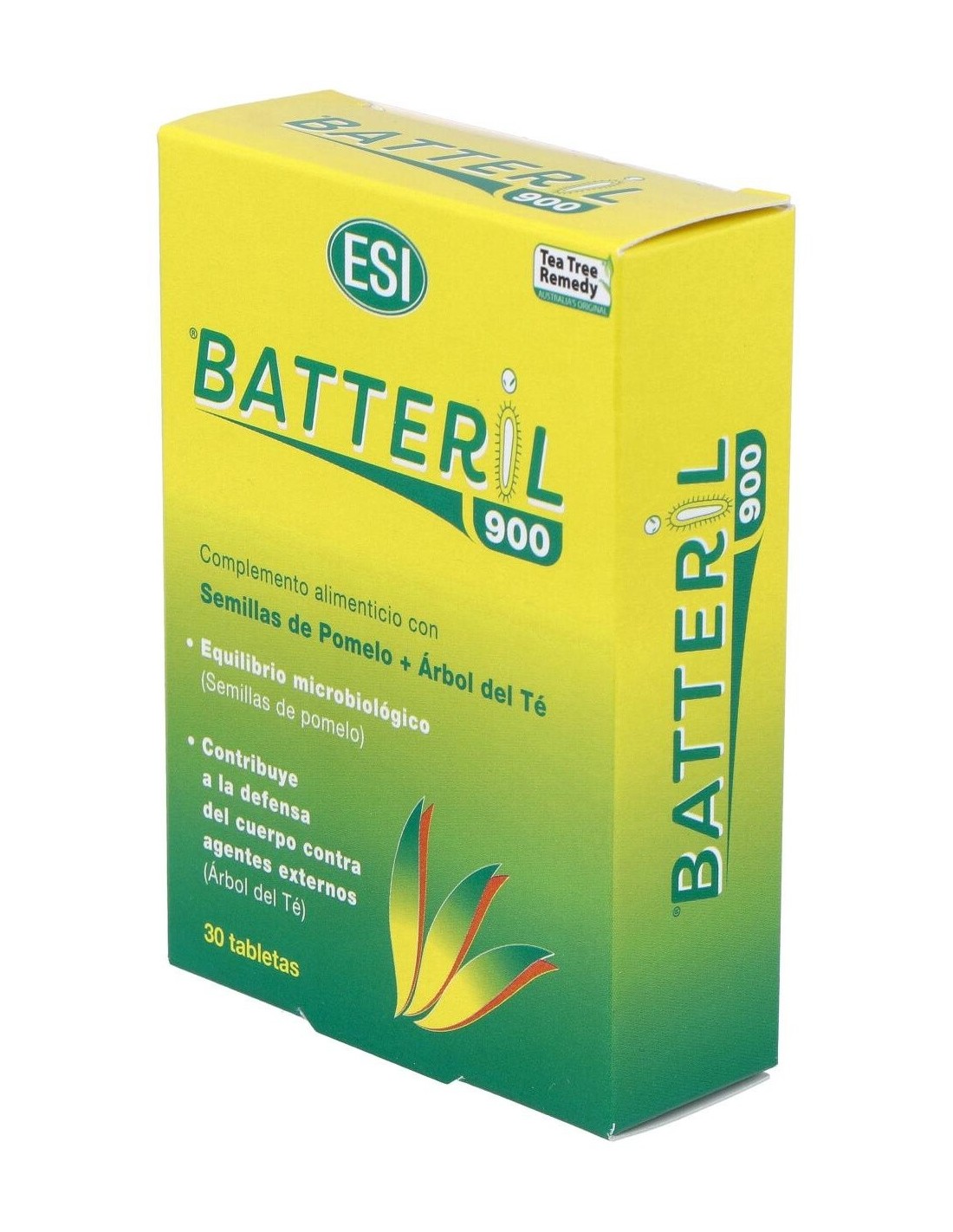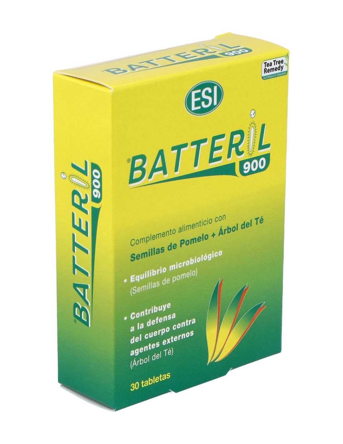 Batteril 900 es un producto a base de extracto de semilla de pomelo y aceite esencial de árbol de té, útil para contrarrestar las infecciones más comunes. Los principios activos contenidos son los responsables de la actividad antibacteriana, antimicótica, antivirica y antiparasitaria. El producto es útil en casos de infecciones de las vías respiratorias, digestivas, urinarias...indicado en amigdalitis, cistitis, candidiasis vaginal, gripe, resfriado...entre otros tipos de infección. Propiedades de los principios activos: