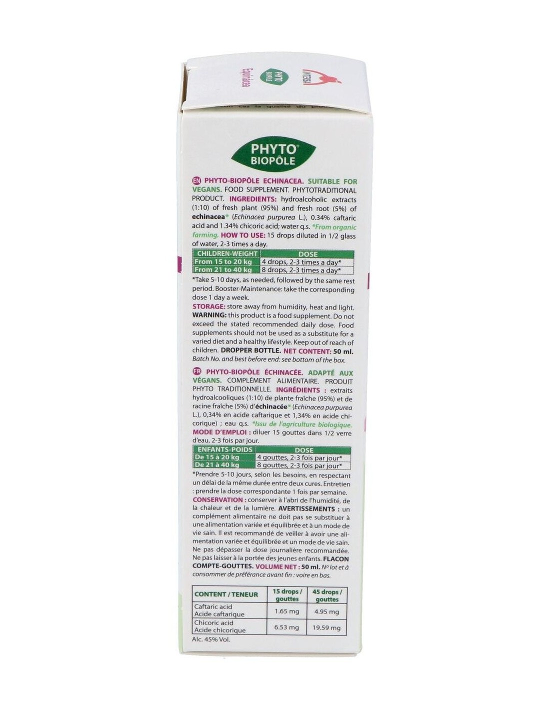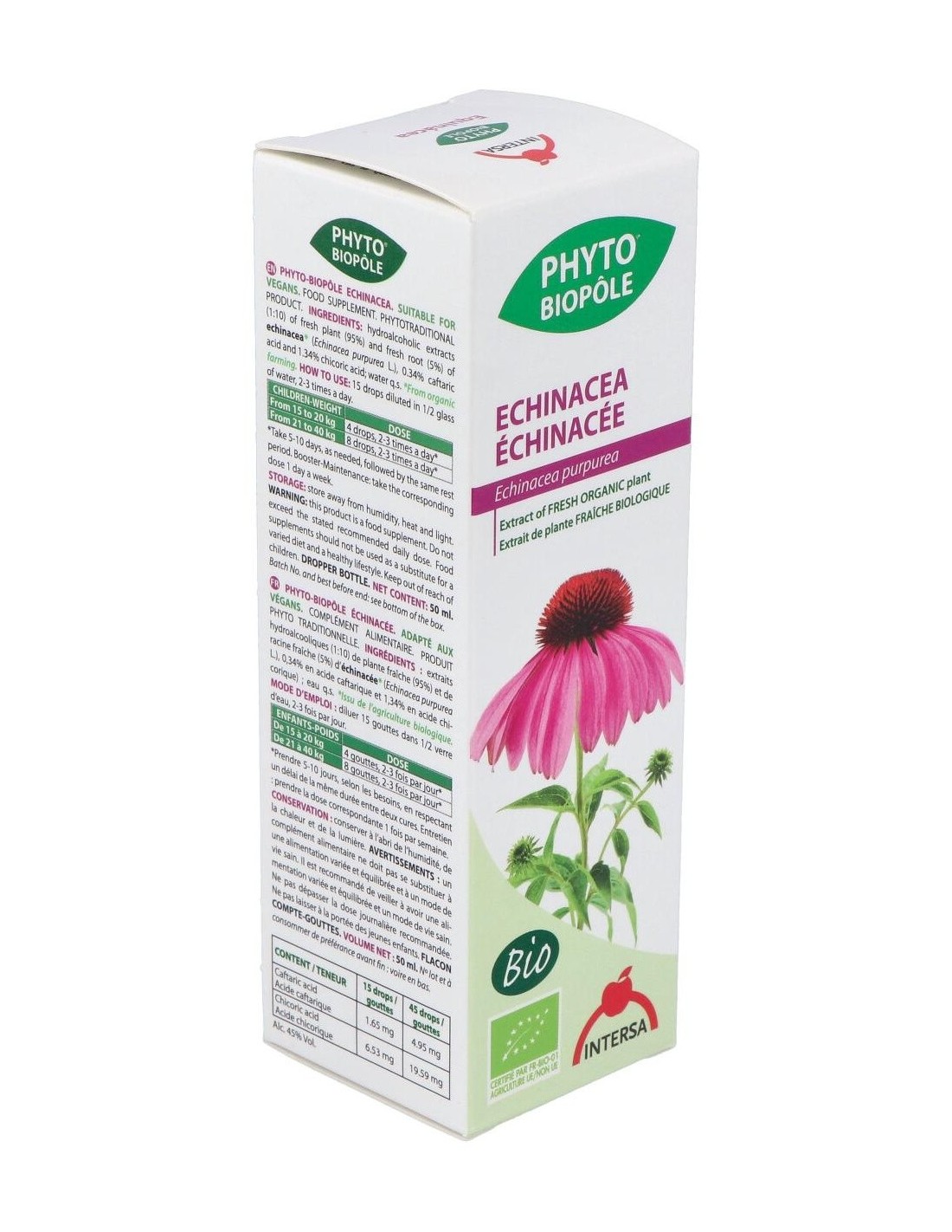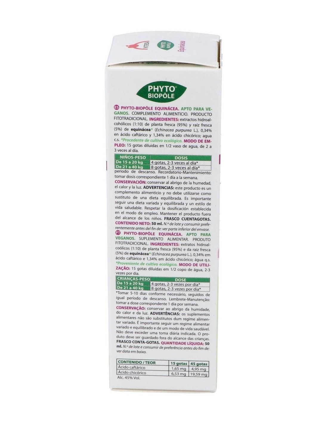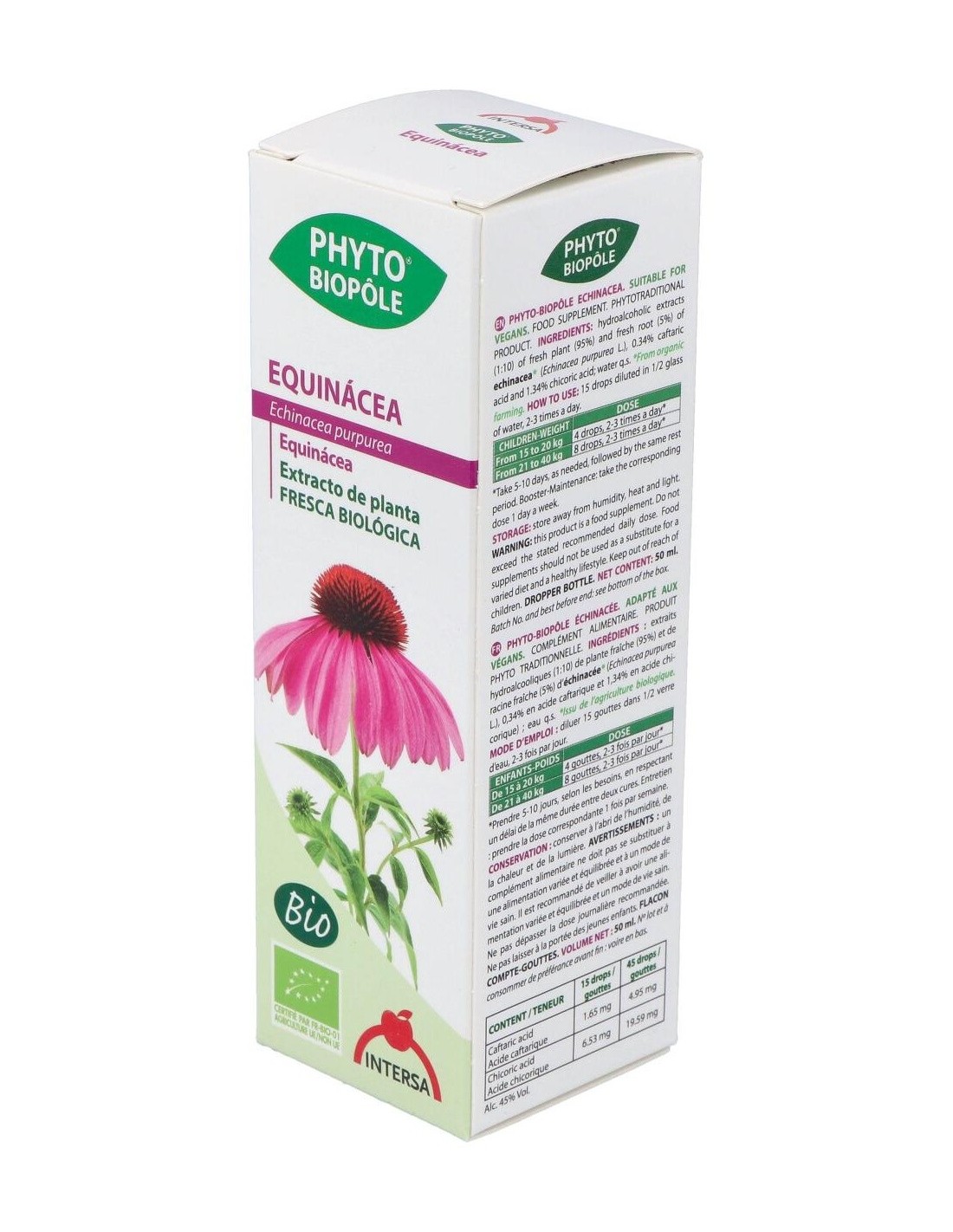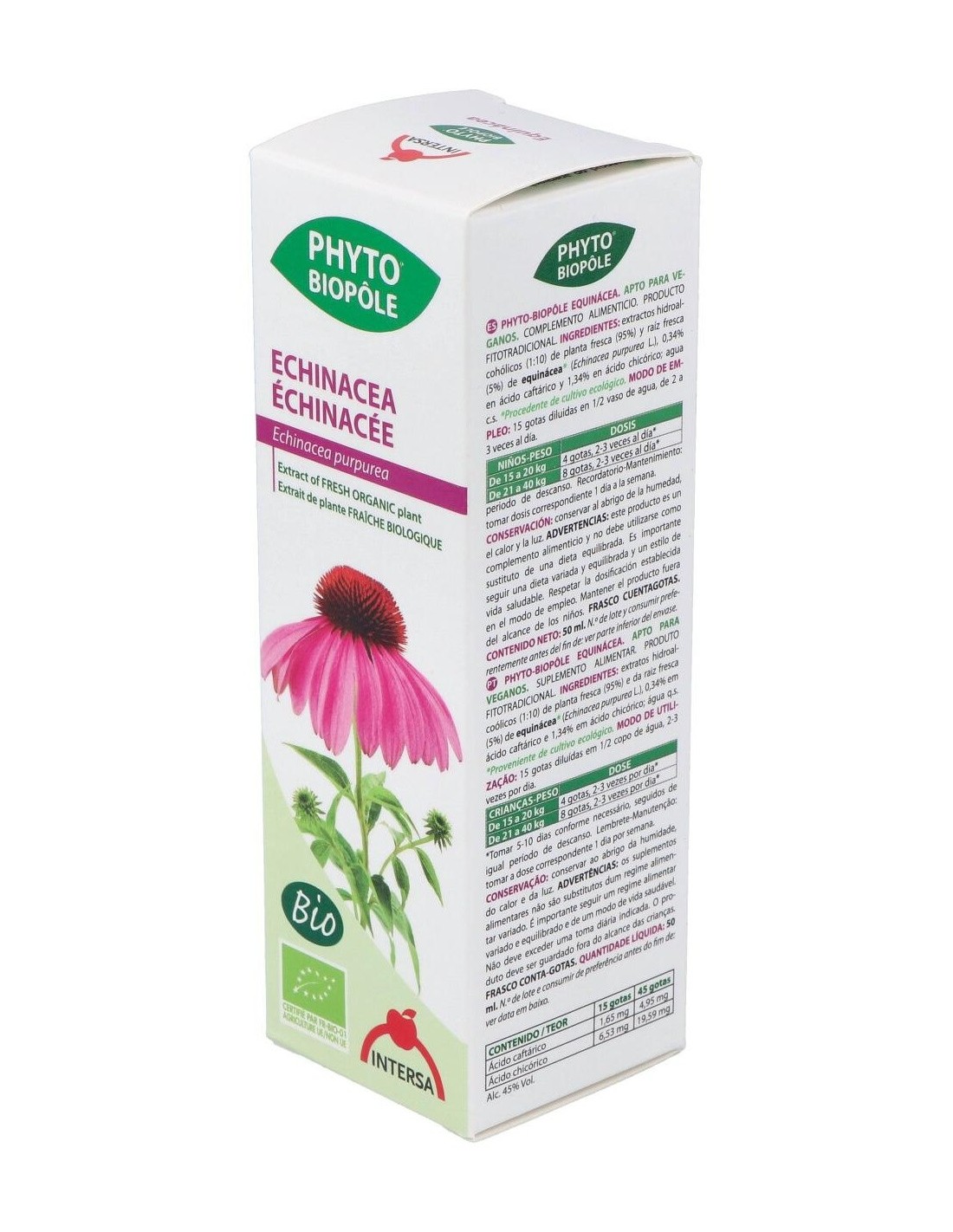 rosáceo característico. Las raíces son la parte más apreciada por su alto contenido en principios activos, entre los que encontramos un aceite esencial, alcaloides indolizidínicos y compuestos fenólicos derivados del ácido cafeico, entre los que destaca el Echinacósido. También hallamos compuestos alifáticos insaturados, especialmente Alquilamidas y Polisacáridos. Los Indios Norteamericanos usaron ya la Equinácea tanto como cicatrizante como para aliviar cefaleas, la tos y dolores estomacales. Hoy en día su uso mayoritario es debido a su capacidad inmunoestimulante. El conjunto de sus principios activos estimulan el sistema inmunitario, y más en concreto favorecen la proliferación de los glóbulos blancos y la producción de Interferón. La Equinácea se usa tradicionalmente para combatir infecciones, especialmente el resfriado común y la gripe, así como otras infecciones del tracto respiratorio superior. También se emplea popularmente contra muchas otras infecciones, entre las que se pueden incluir las del tracto urinario, las vaginales, el herpes genital, las del torrente sanguíneo (septicemia) y las de las encías entre otras. Otros usos no relacionados a infecciones incluyen el síndrome de fatiga crónica, el reumatismo, las migrañas, la indigestión, el dolor, los mareos, las mordeduras de serpiente de cascabel y el trastorno de déficit de atención e hiperactividad. También se aplica la Equinácea a la piel para el tratamiento de furúnculos, abscesos, heridas en la piel, úlceras, quemaduras, eczema, psoriasis, daño por radiación ultravioleta, herpes simple, picaduras de abeja y hemorroides. Ingredientes:Extractos hidroalcohólicos (1:10) de: planta fresca (95%) y raíz fresca (5%) de echinacea* (Echinacea purpurea L., 0,34% en ácido caftárico y 1,34% en ácido chicórico). Modo de empleo:Tomar 15 gotas diluidas en medio vaso de agua de 2 a 3 veces al día (15 gotas equivalen aprox a 0,70 ml). Agitar antes de usar. Presentación:Frasco de 50 ml con cuentagotas.