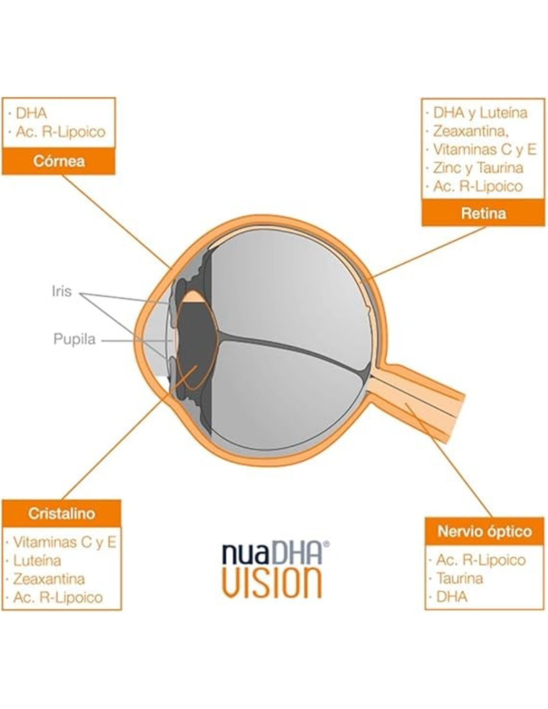 Suplemento destinado a apoyar la salud visual en la edad adulta debido a su composición de nutrientes como luteína, zeaxantina y vitaminas, entre otros.