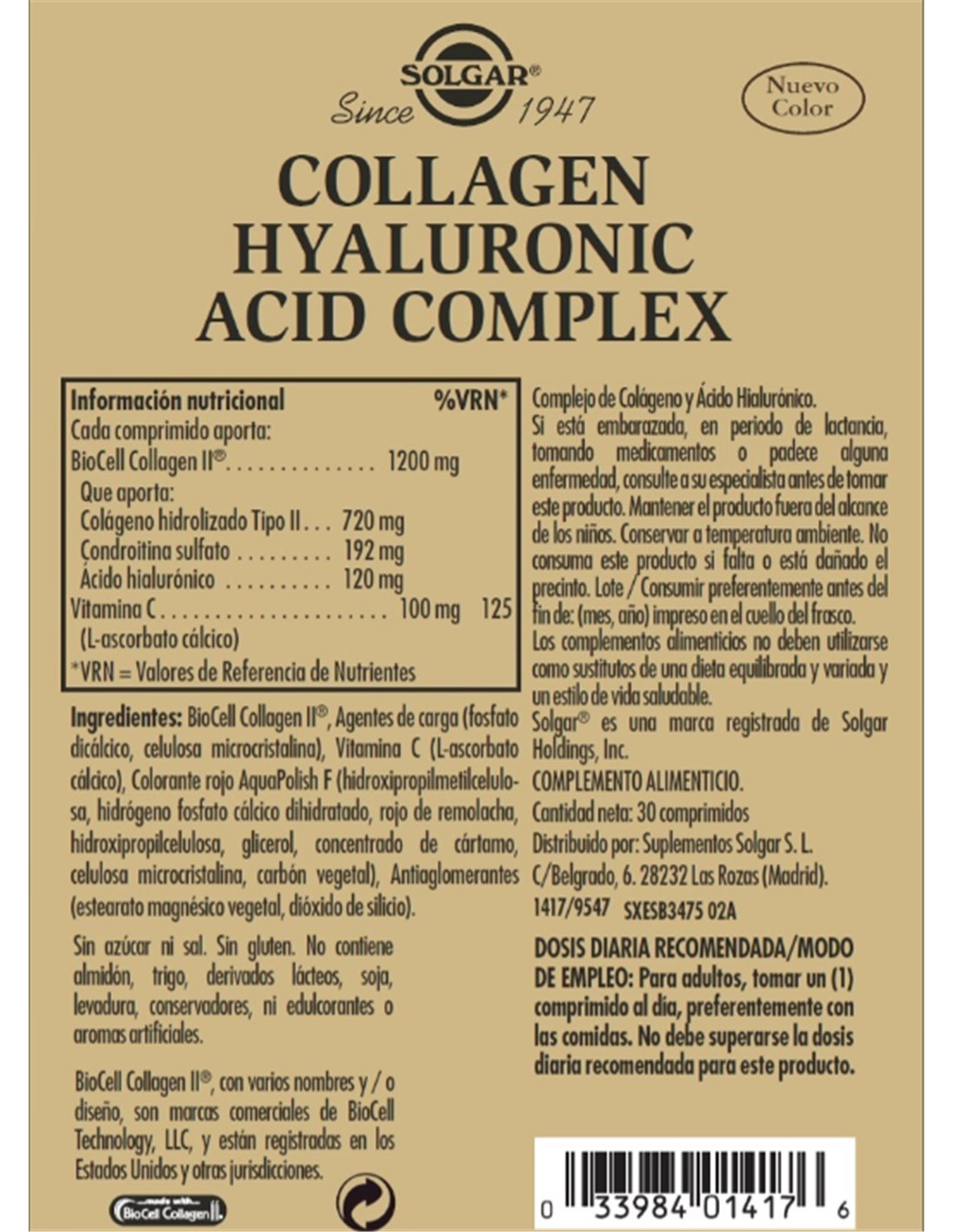 Colagen Acido Hialuronico Complex 120Mg. 30Comp. de Solgar